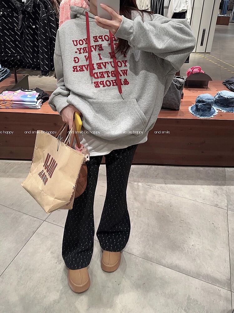 色:ライトグレーのフリーススウェットシャツ,花柄ベルベットフレアパンツ