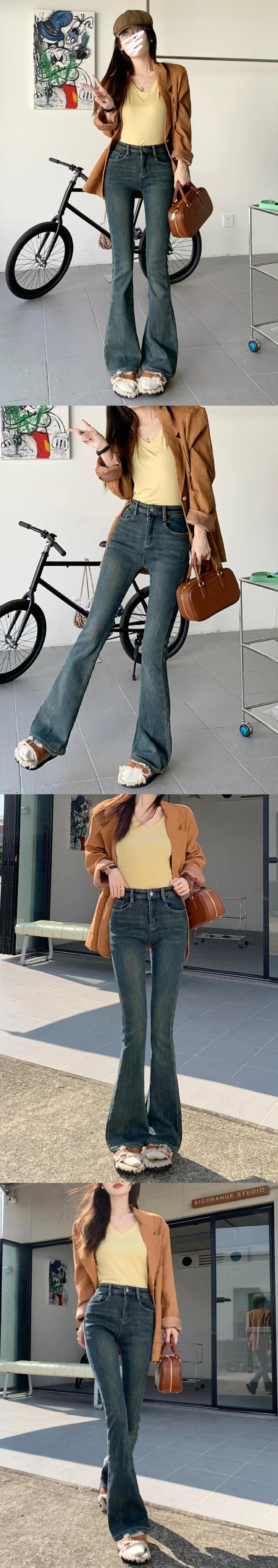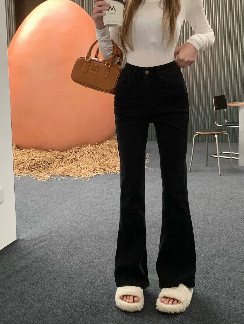 レトロブルージーンズレディース冬ベルベット肥厚マイクロフレア馬蹄パンツ今年人気のハイウエストフロアレングスパンツ レッド ウィンター 冬物 8571694587885126