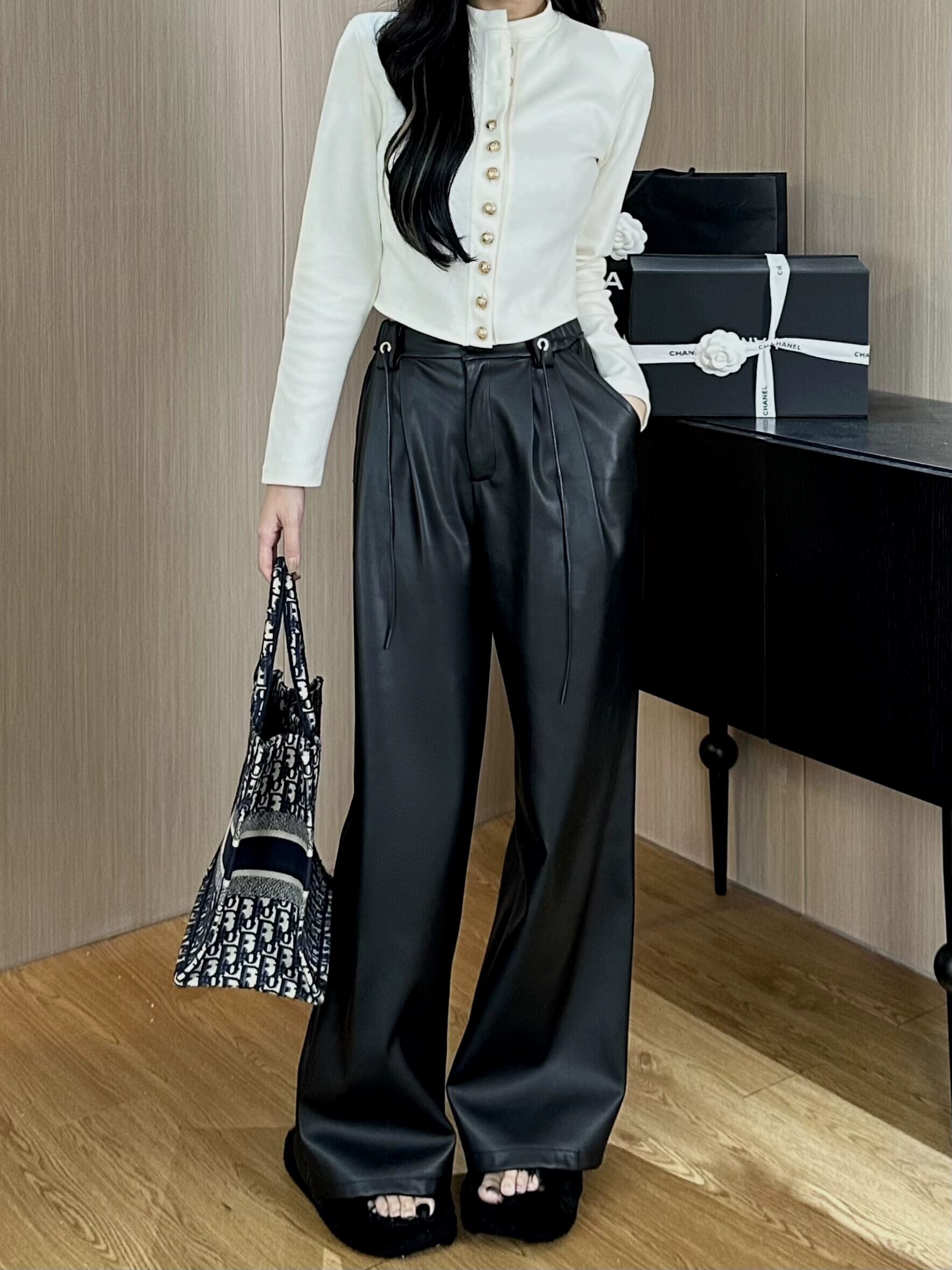 黒の PU レザーパンツワイドレッグパンツ女性の秋と冬のハイウエストカジュアルパンツアメリカンレトロハイエンドフロアレングスパンツ ブラック オータム 秋物 ウィンター 冬物 8571663381946683