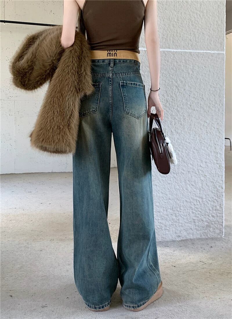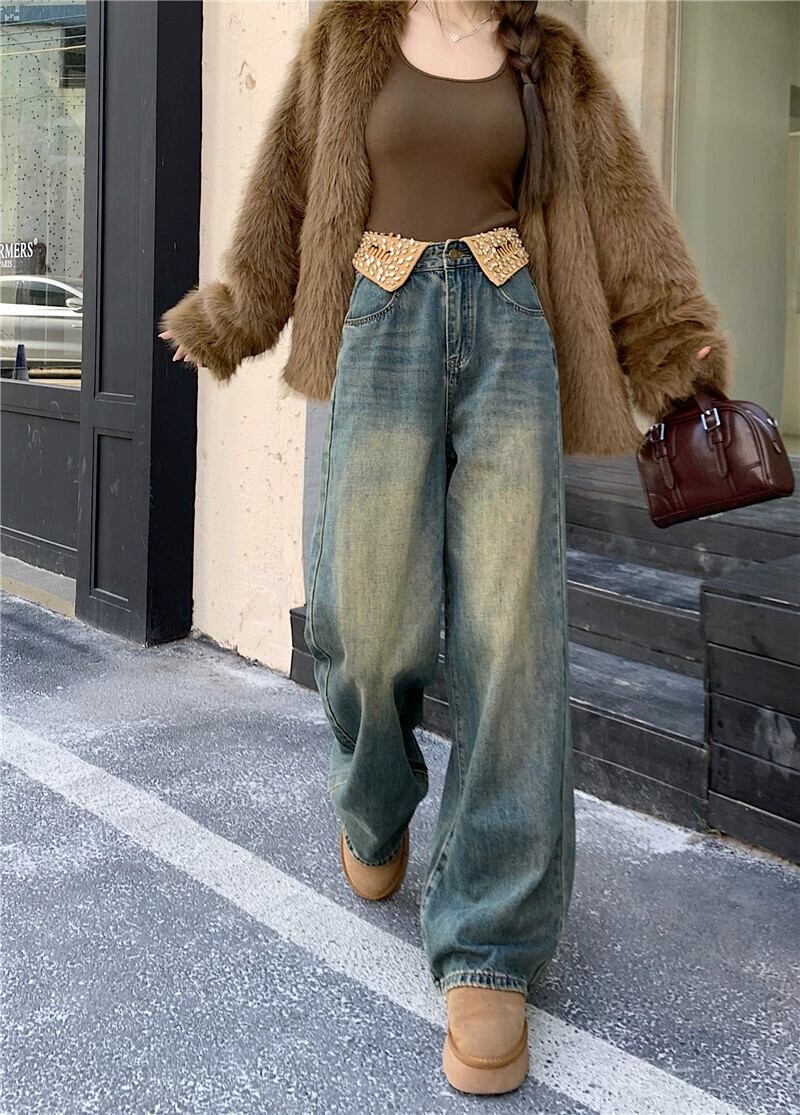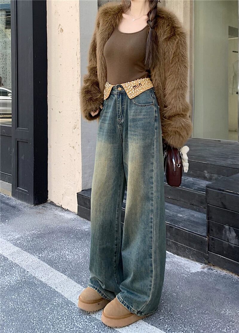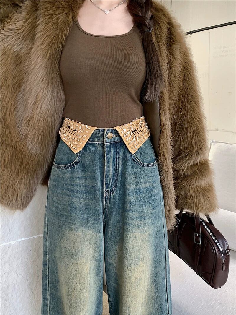 折り返しダイヤモンドジーンズ女性の秋と冬プラスベルベットハイウエストワイドレッグパンツ 2024 新しいルーズストレートストレートフロアレングスパンツ オータム 秋物 ウィンター 冬物 857167088440990