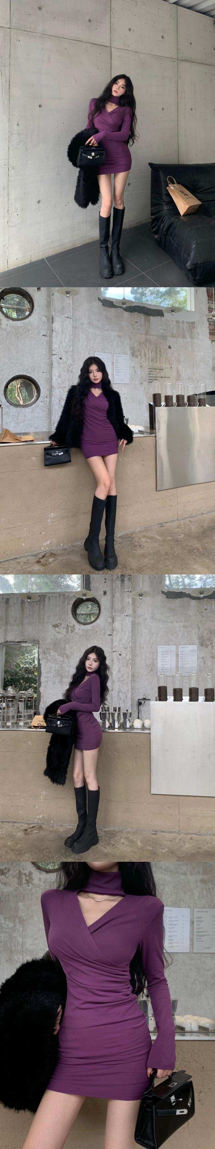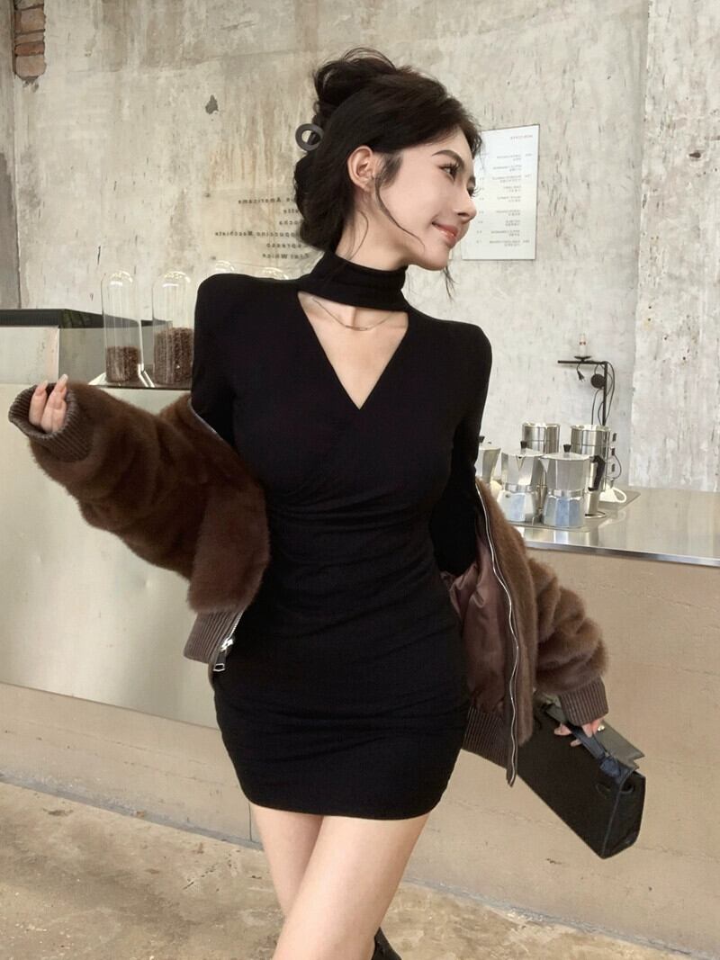 冬のハーフハイカラーのホルターネックドレス女性プラスベルベットの純粋な欲望ネクタイセクシーな黒のコートとヒップハグショートスカート ブラック ウィンター 冬物 ピュア 8571668539485033