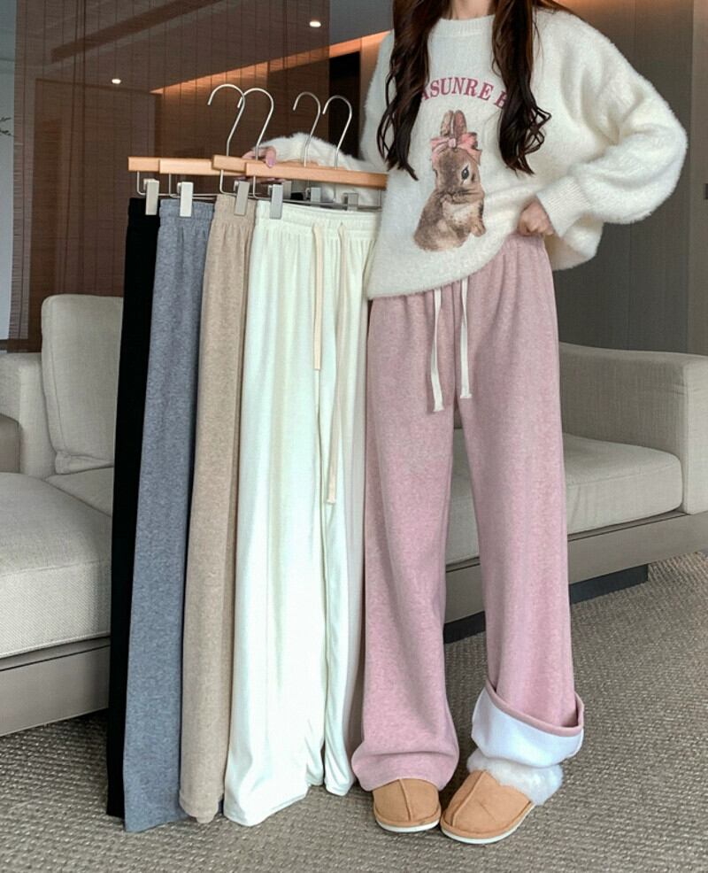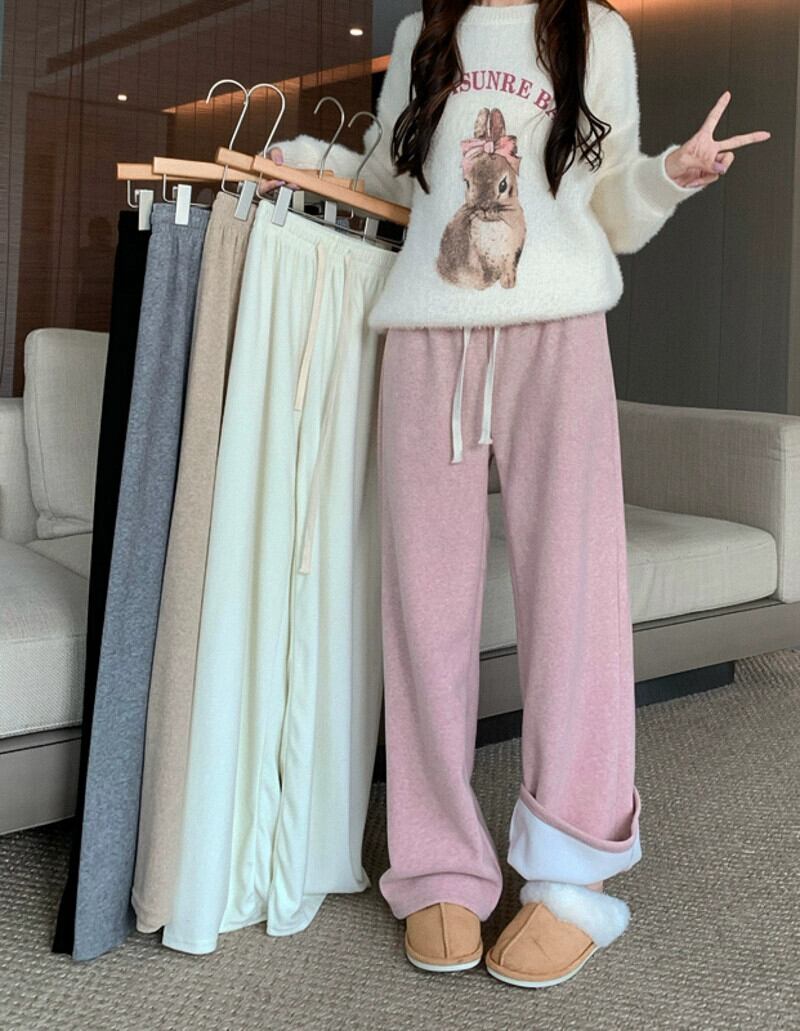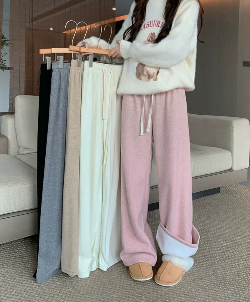 ピンクのワイドレッグパンツの女性の冬のベルベット肥厚ストレートパンツ 2024 新スタイルの小さなハイウエストカジュアルフロアモップパンツ ウィンター 冬物 8571689114054973