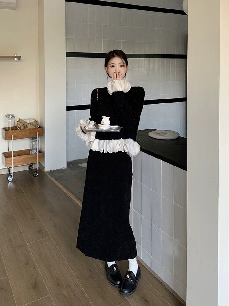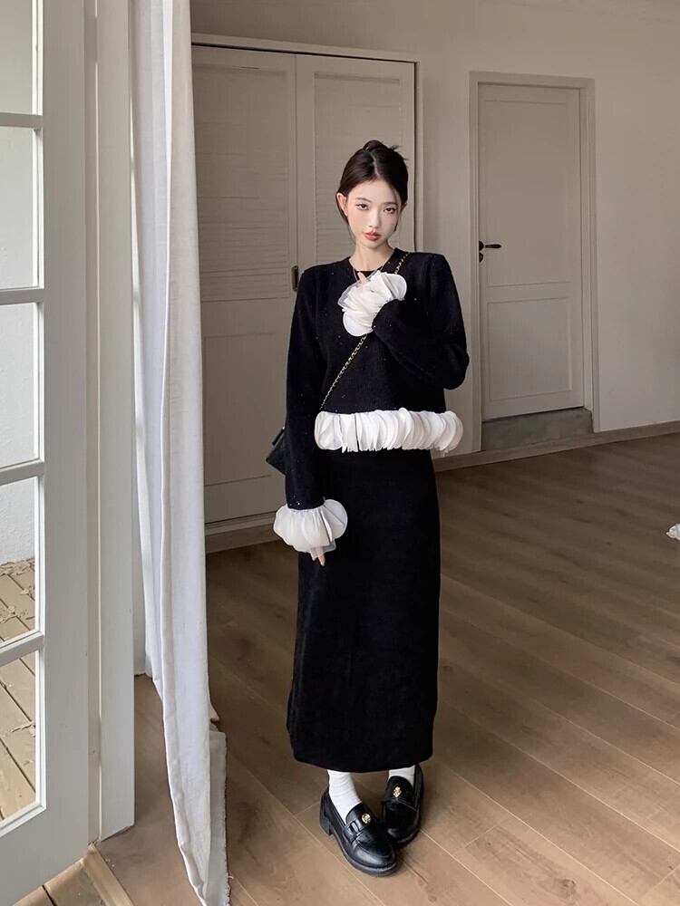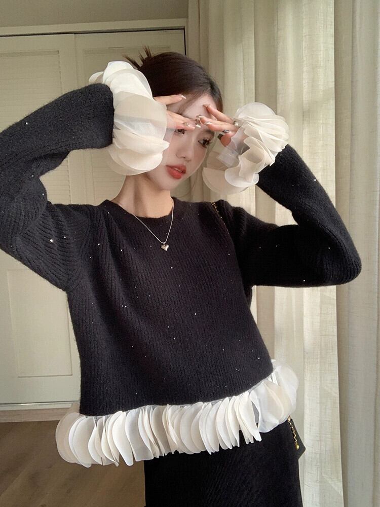 黒ファイングリッターセーター女性秋と冬 2024 新しいレトロユニークな超見栄えの良い花びらステッチショートセーター ブラック オータム 秋物 ウィンター 冬物 8571624206197826
