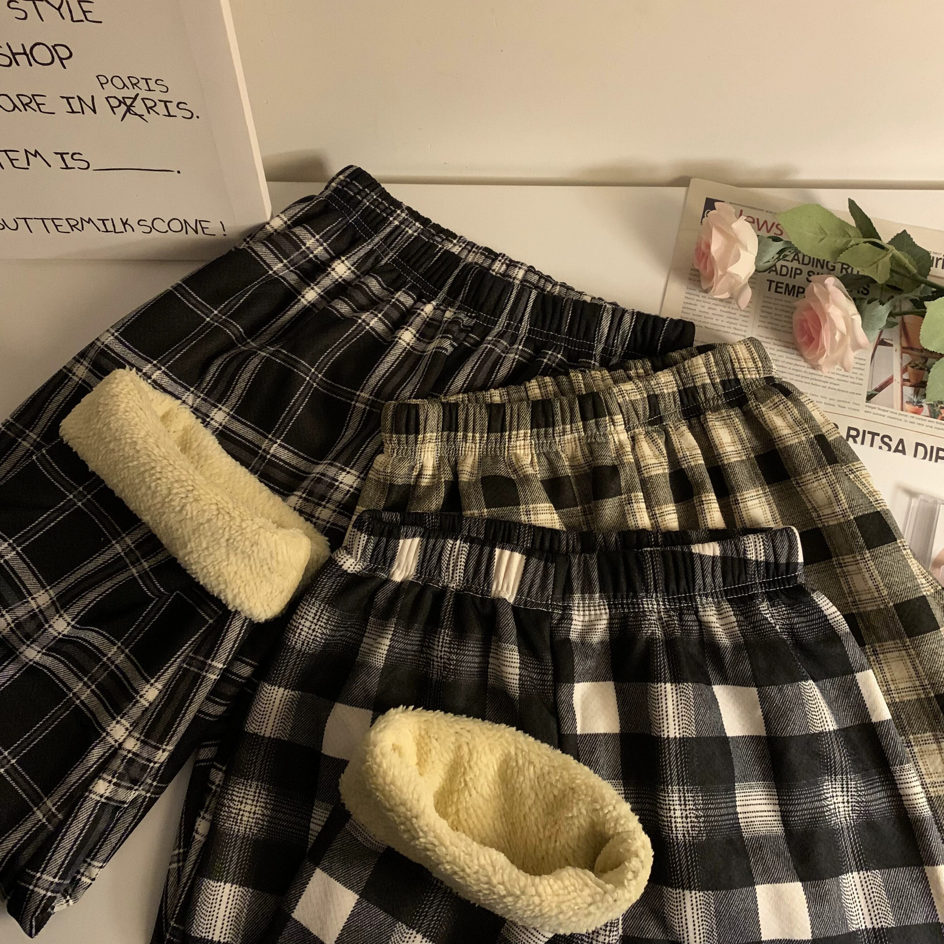 女性の冬のラムベルベットの暖かいワイドレッグパンツ、ベルベットと厚みのあるチェック柄パンツ、ハイウエスト、ルーズ、レトロ、カジュアル、フロアレングスパンツ ウィンター 冬物 857164725498434