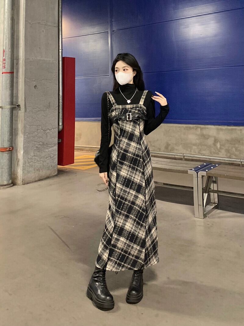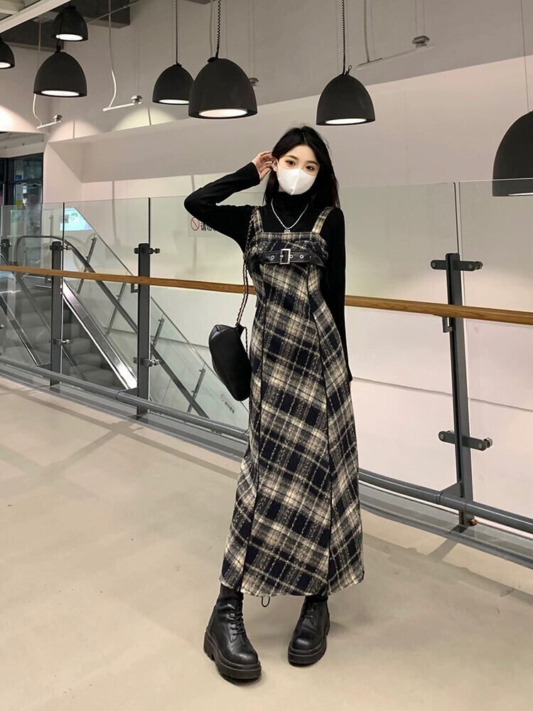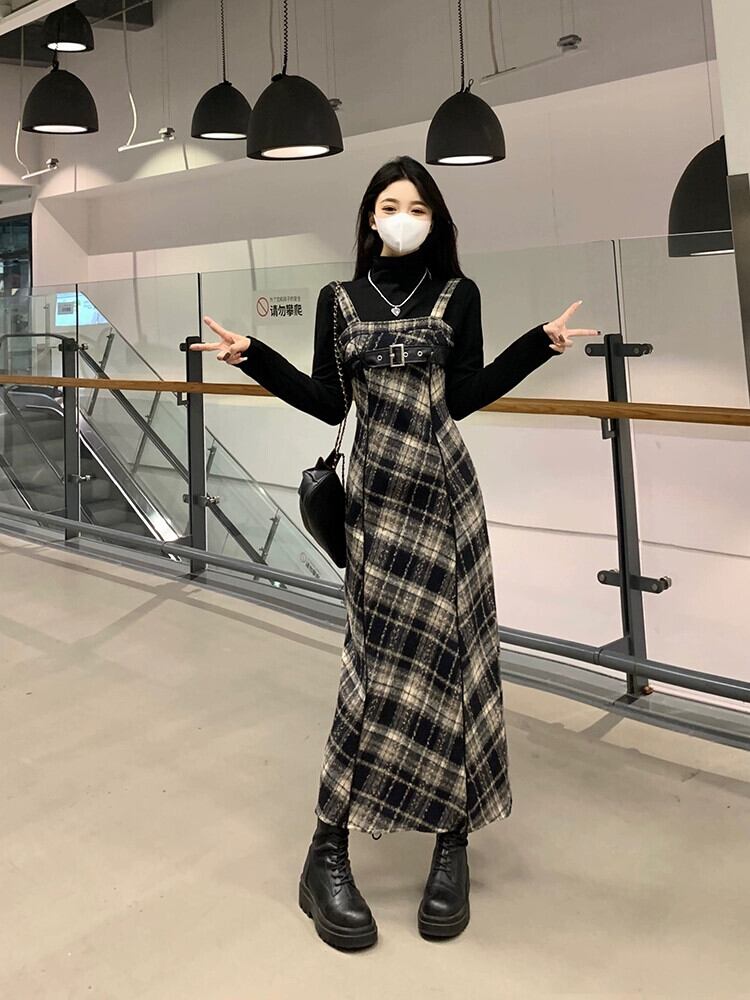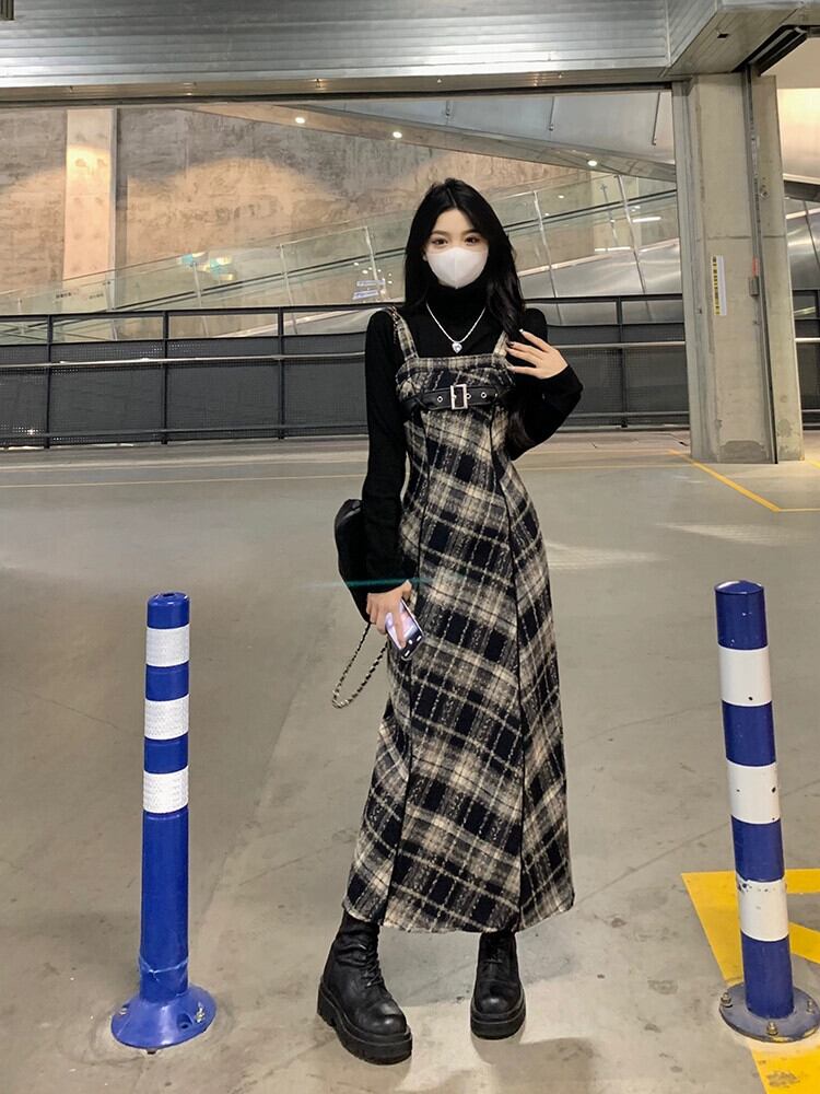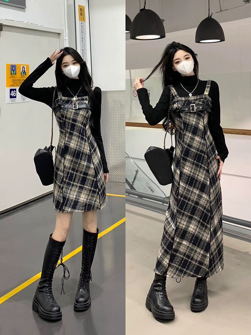 チェック柄サスペンダードレス女性の2024年秋冬新しいスタイルのレトロな気質超格好良いハイエンドウエストロングスカート オータム 秋物 ウィンター 冬物 8571686677031375