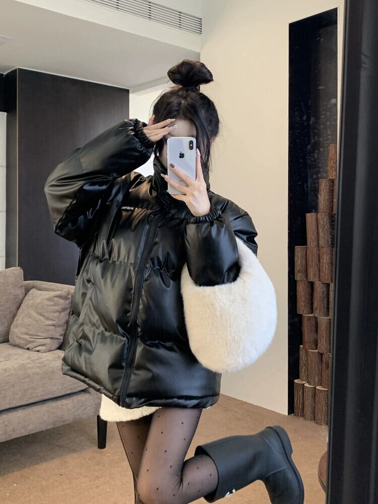 黒 PU レザーコットンコート女性の冬肥厚パンコート 2024 新しい香港スタイルのレトロなハイエンドコットンコート ブラック ウィンター 冬物 8571681782038220