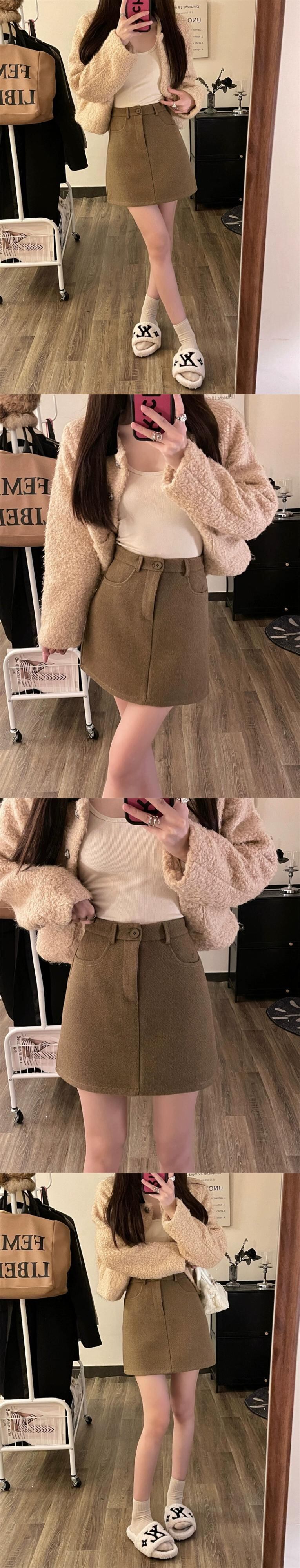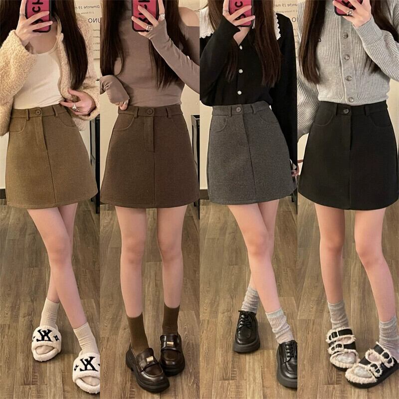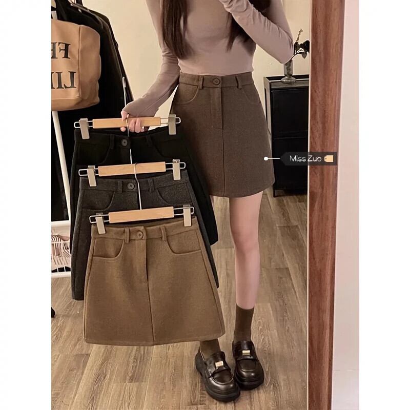 コーヒー色のウールのスカートの女性の冬のハイウエスト A ラインスカート 2024 新スタイルの小さな露出防止ヒップカバーショートスカート レッド ウィンター 冬物 Aライン 857163605327119