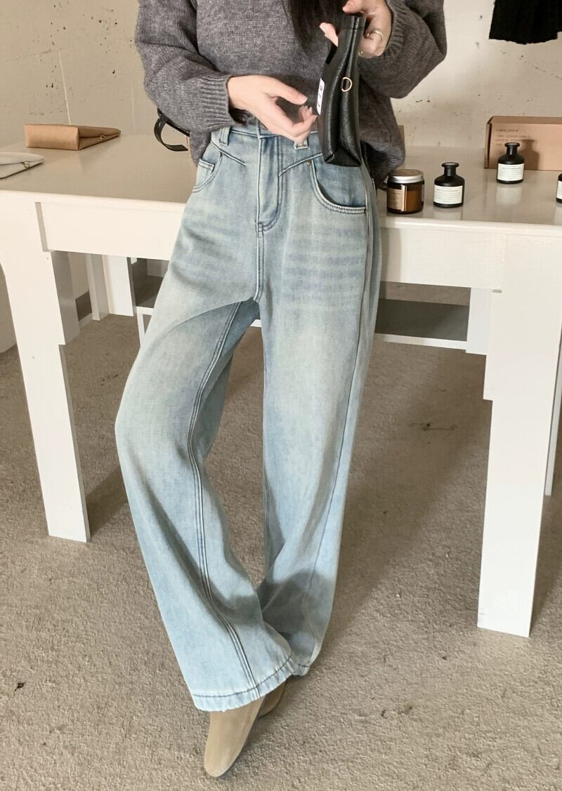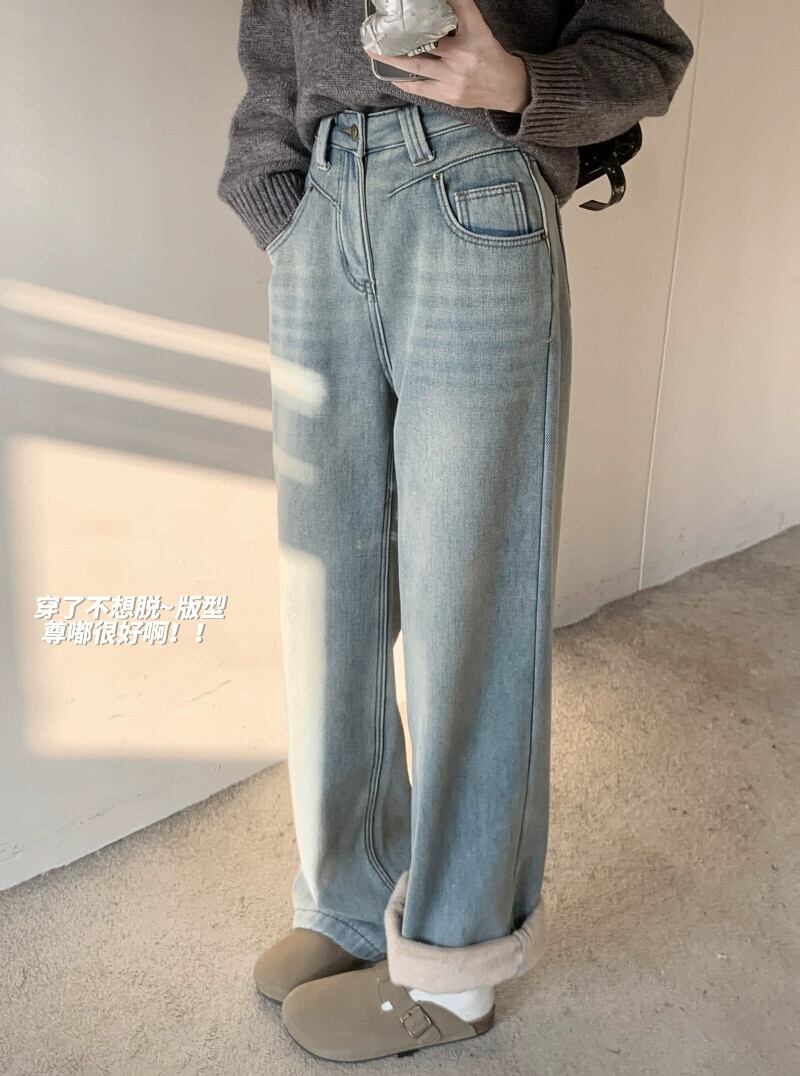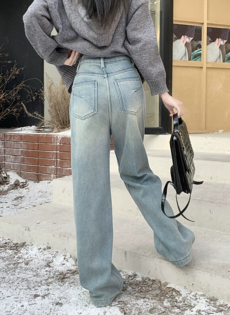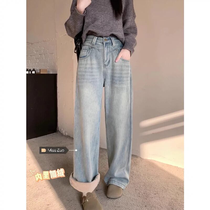 ライトブルージーンズレディース冬ベルベット肥厚ワイドレッグパンツ2024新しいハイウエストスリムストレートレッグフロアレングスパンツ ウィンター 冬物 8571621993046642