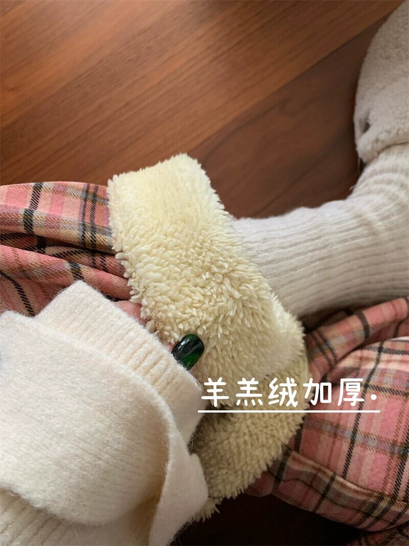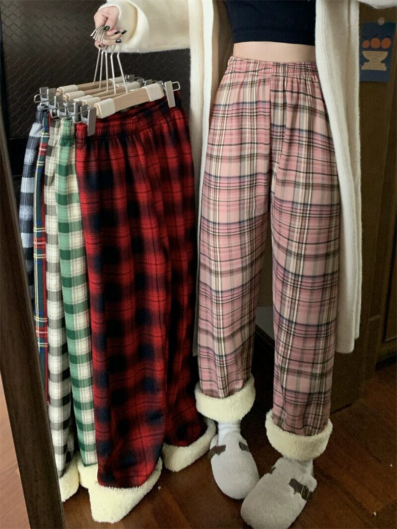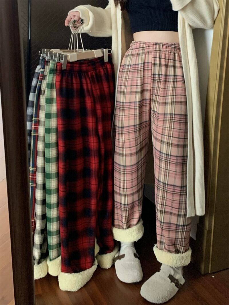 秋冬のラムベルベットピンクチェック柄ワイドレッグパンツレディース、厚みのあるベルベット、ハイウエスト、スリムでドレープのあるカジュアルパンツ ハイウェスト オータム 秋物 ウィンター 冬物 8571670535197955