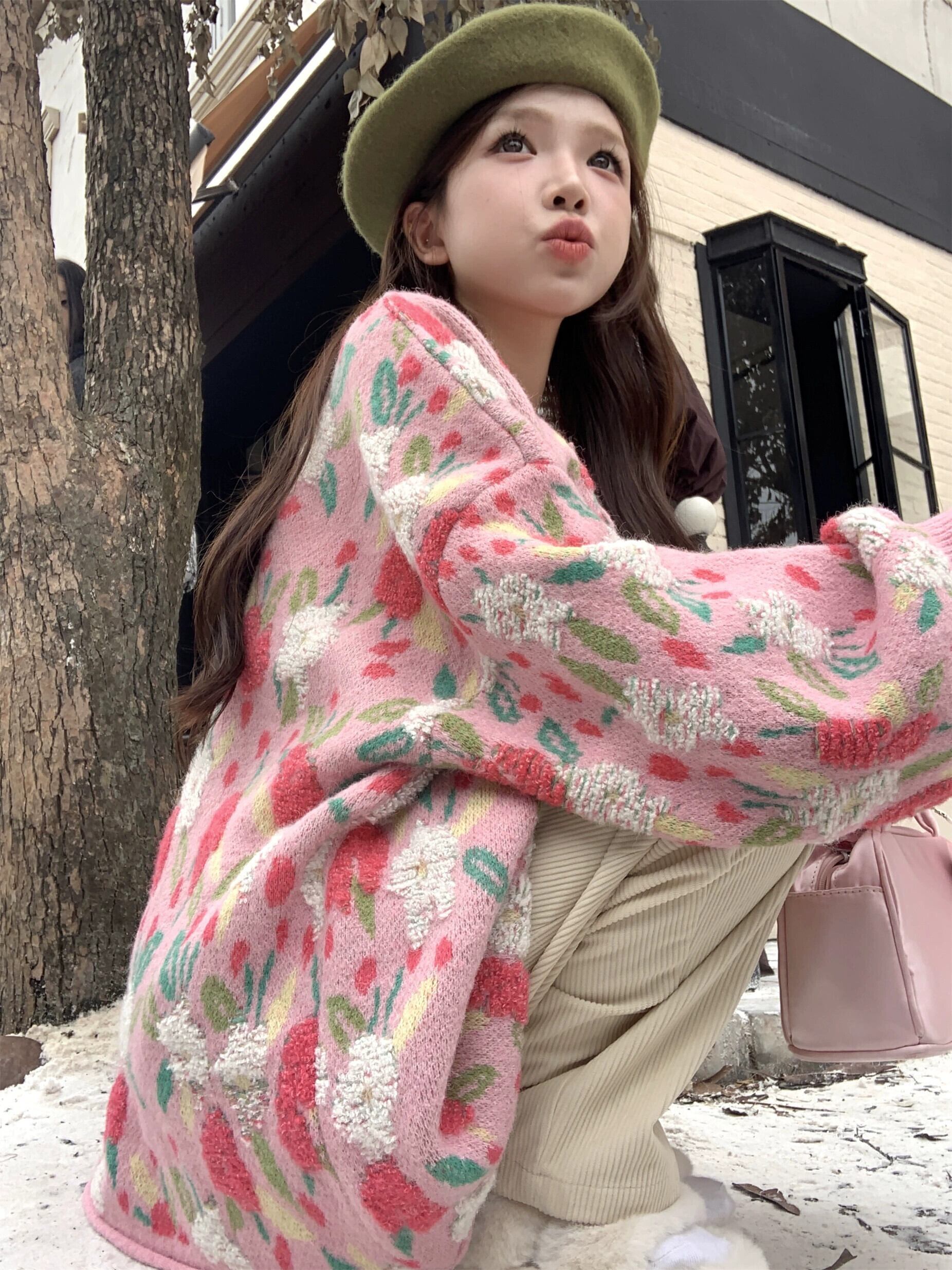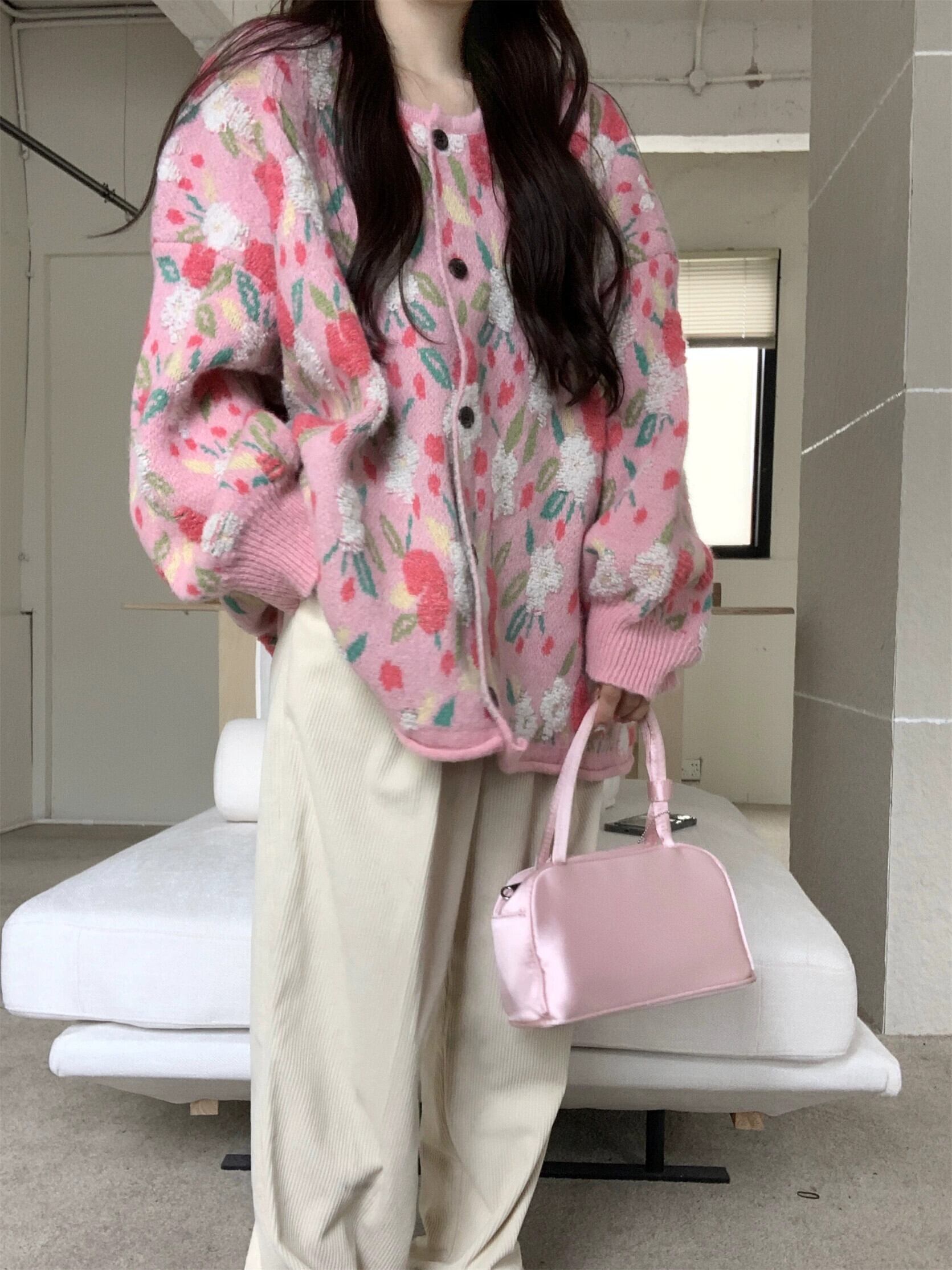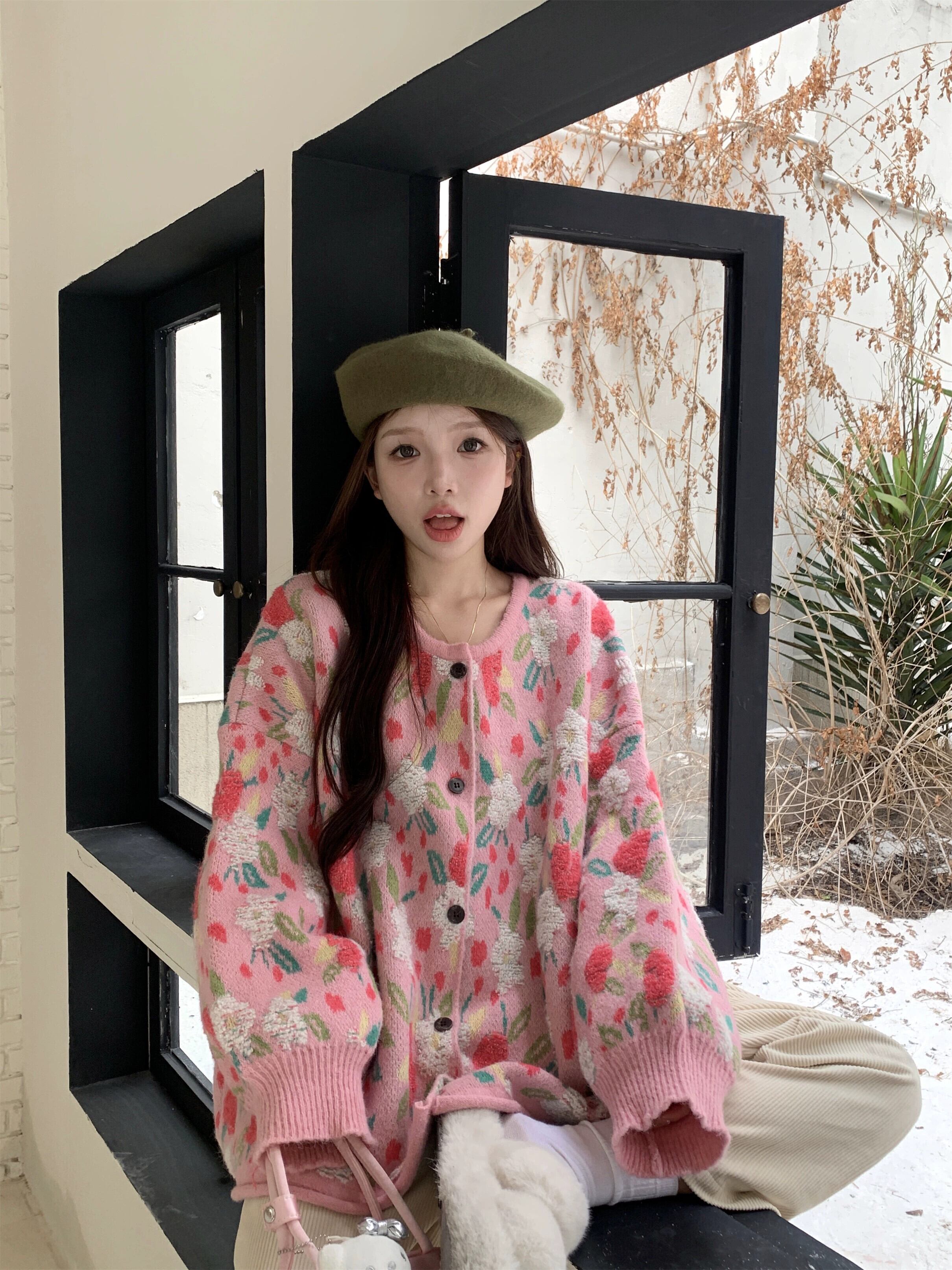 怠惰なスタイルのセータージャケット女性秋と冬 2024 新しいレトロなエストフラワールーズソフトワックス長袖ニットカーディガン ロング オータム 秋物 ウィンター 冬物 フラワーデザイン 8571627066491412