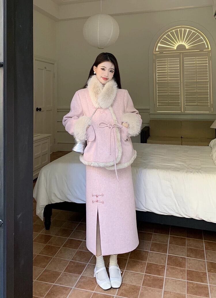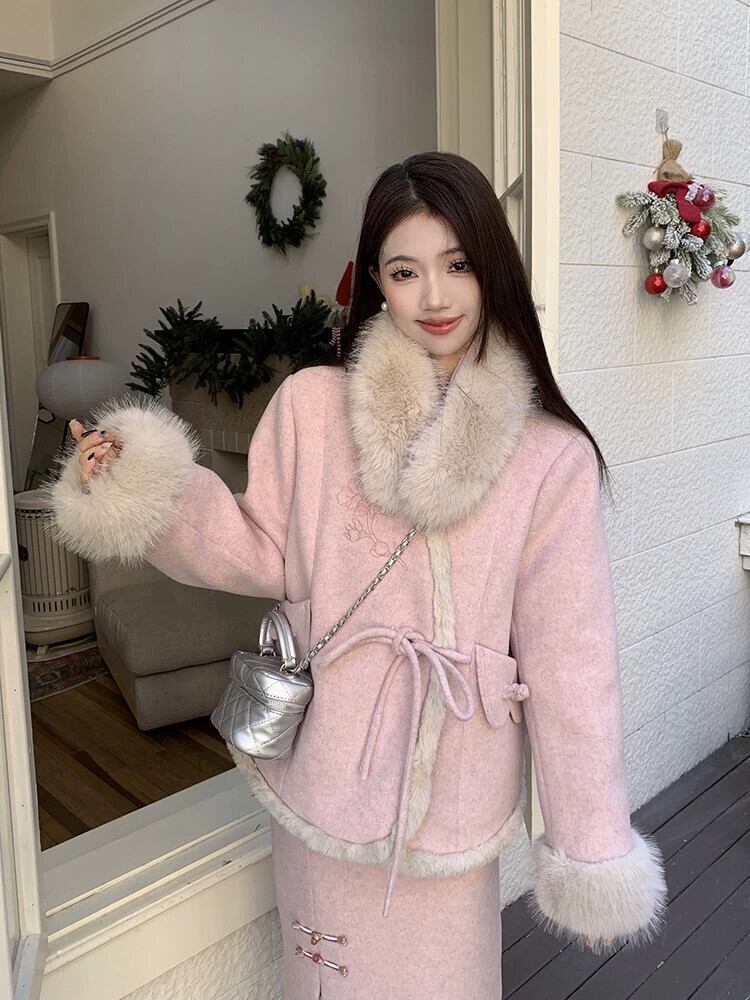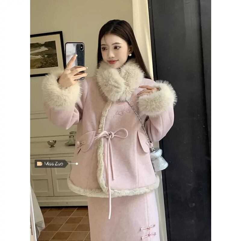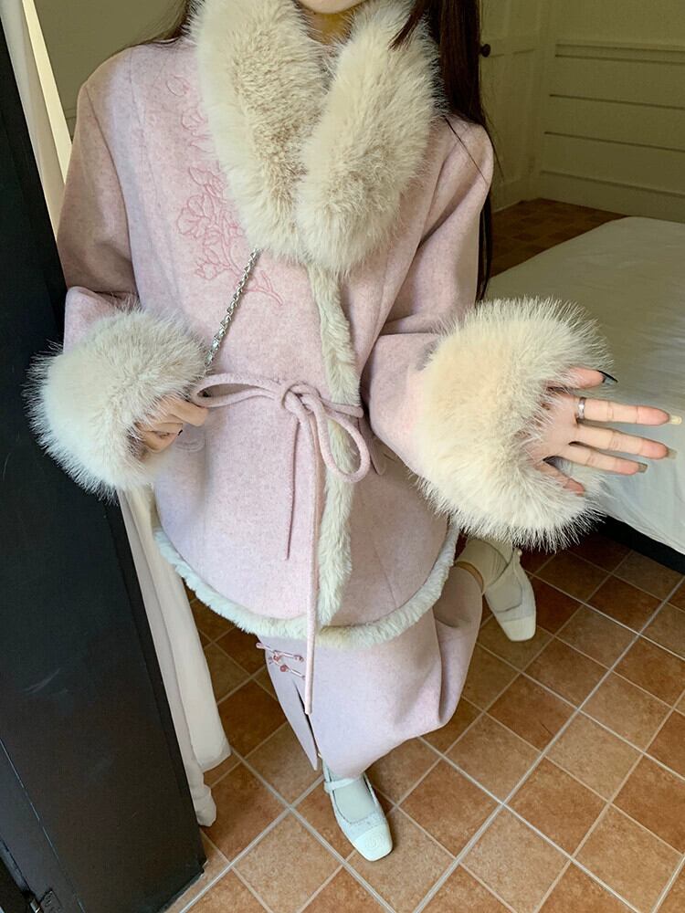 中国風の国民風ピンク刺繍毛皮スプライシングウールコート女性冬肥厚暖かいダウン綿コート レッド コットン ウィンター 冬物 8571675194064948