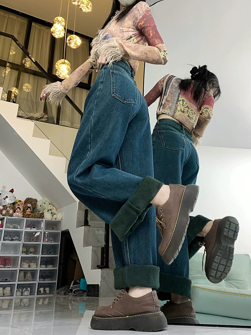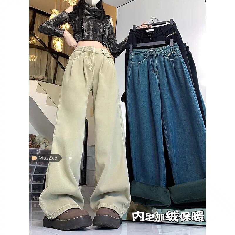 ベルベット肥厚ジーンズ女性秋冬 2024 新しいハイウエストスリムストレートパンツカジュアルワイドレッグパンツ オータム 秋物 ウィンター 冬物 8571692815265495