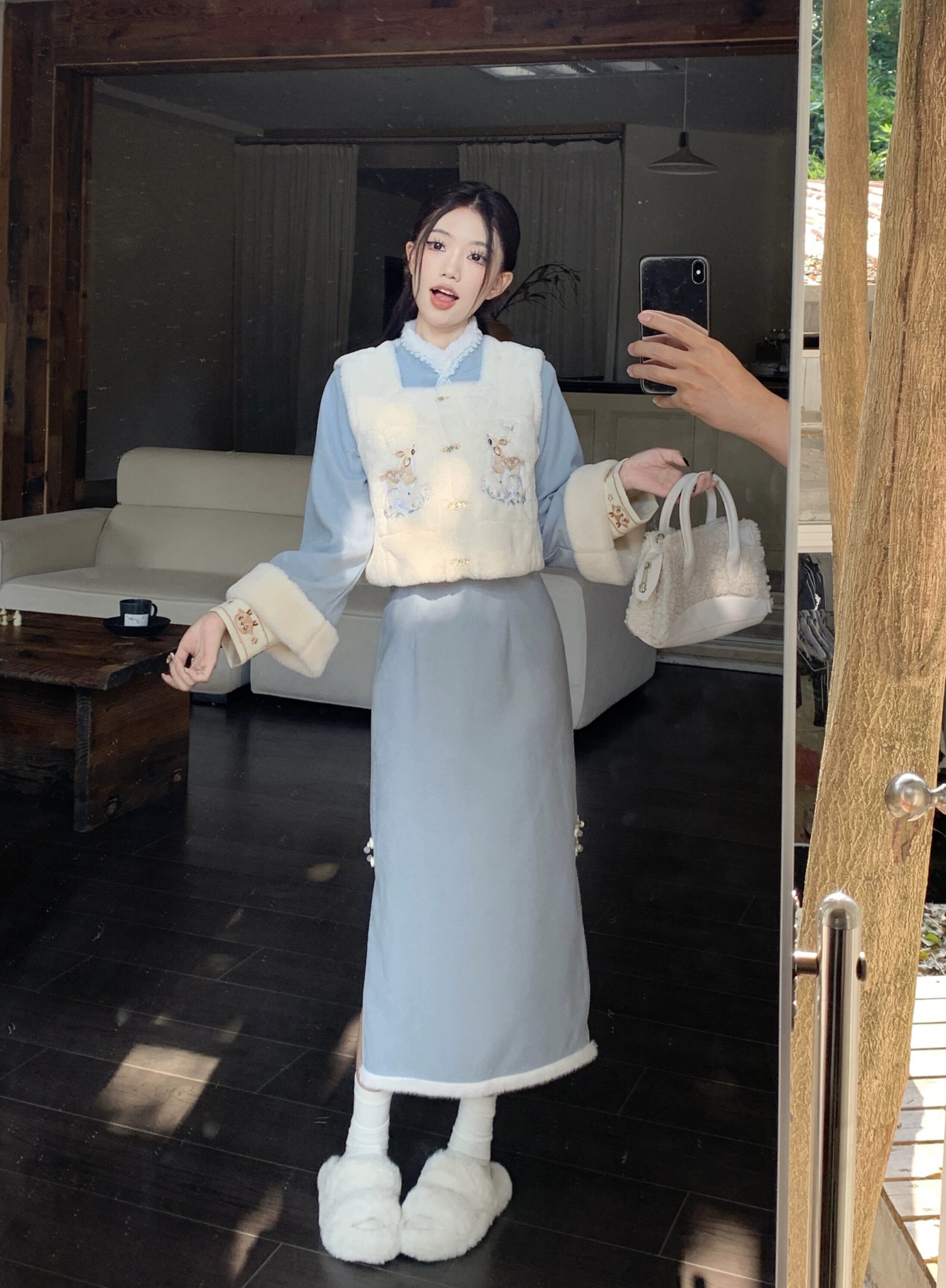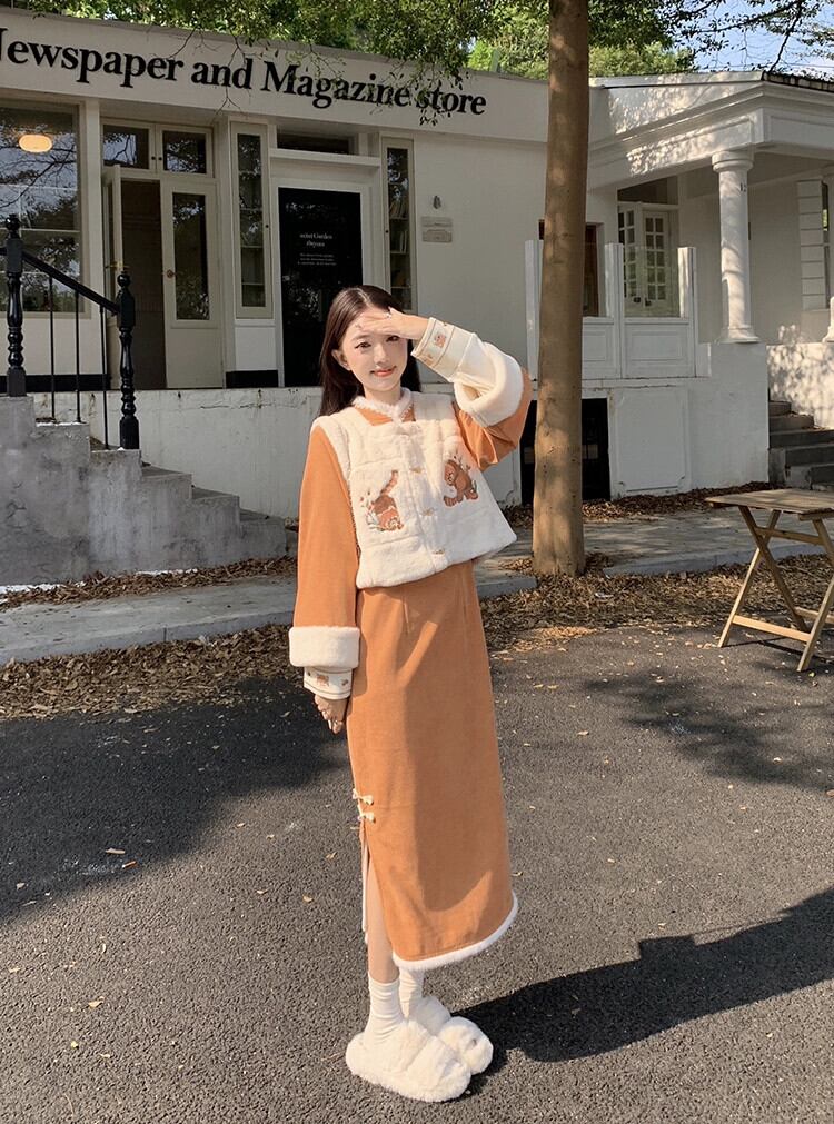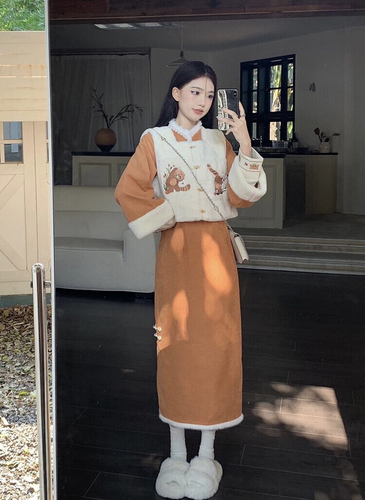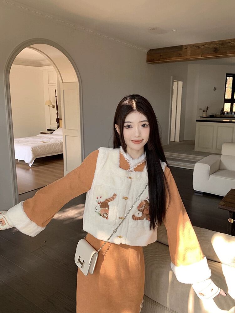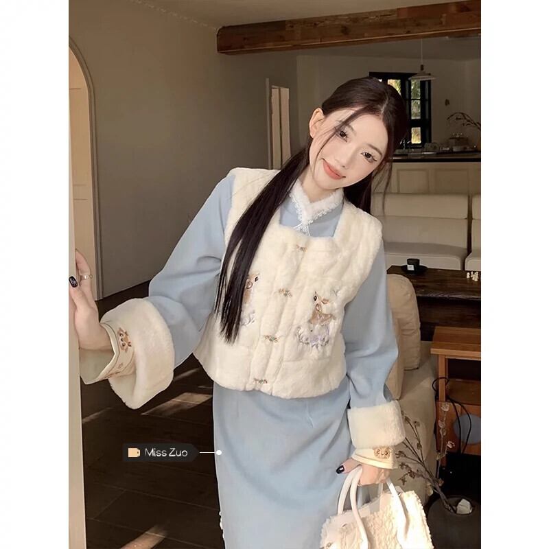 中国風の刺繍模造子羊毛ベストジャケット女性冬 2024 新スタイルベルベット肥厚ベストジャケットアウター レッド ウィンター 冬物 8571615855159710