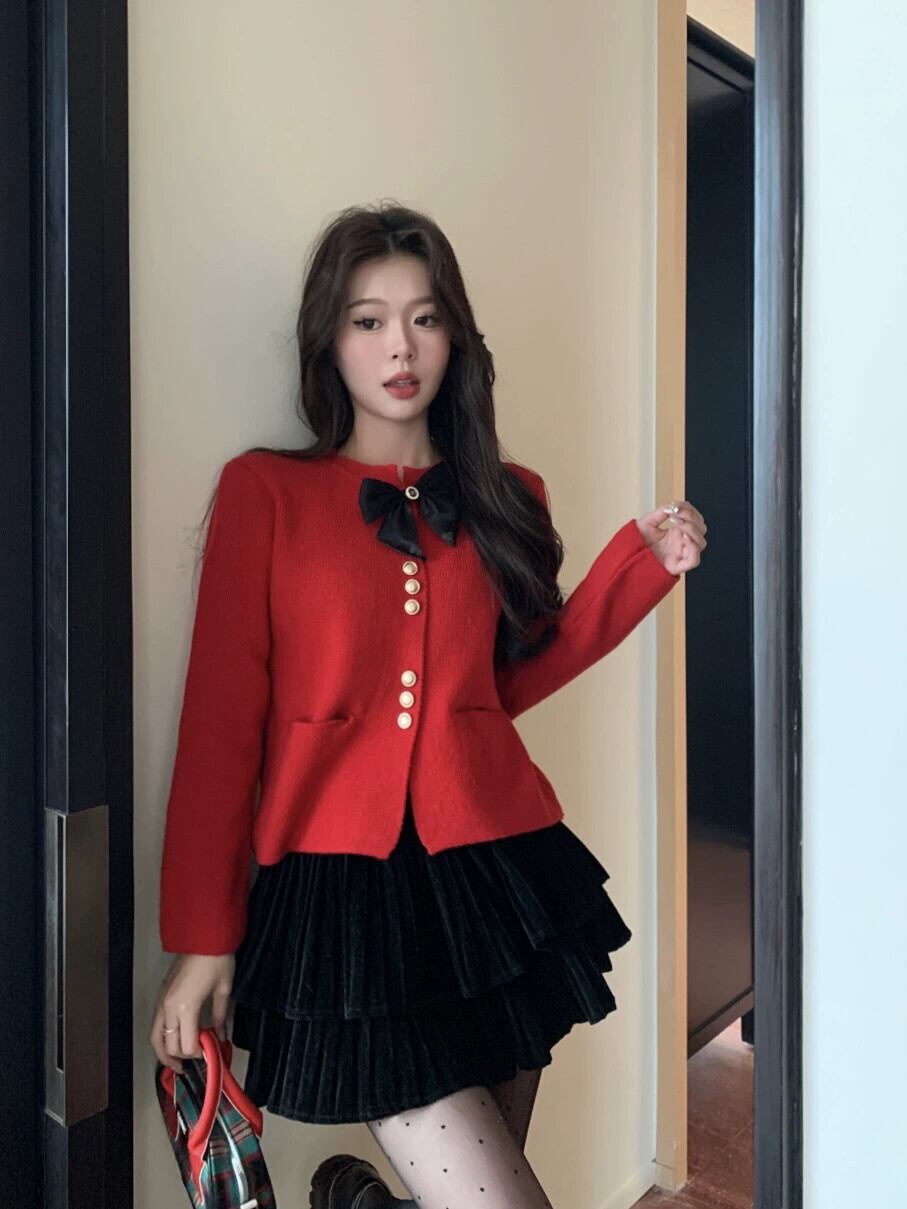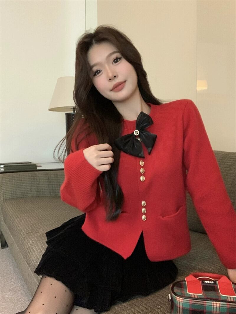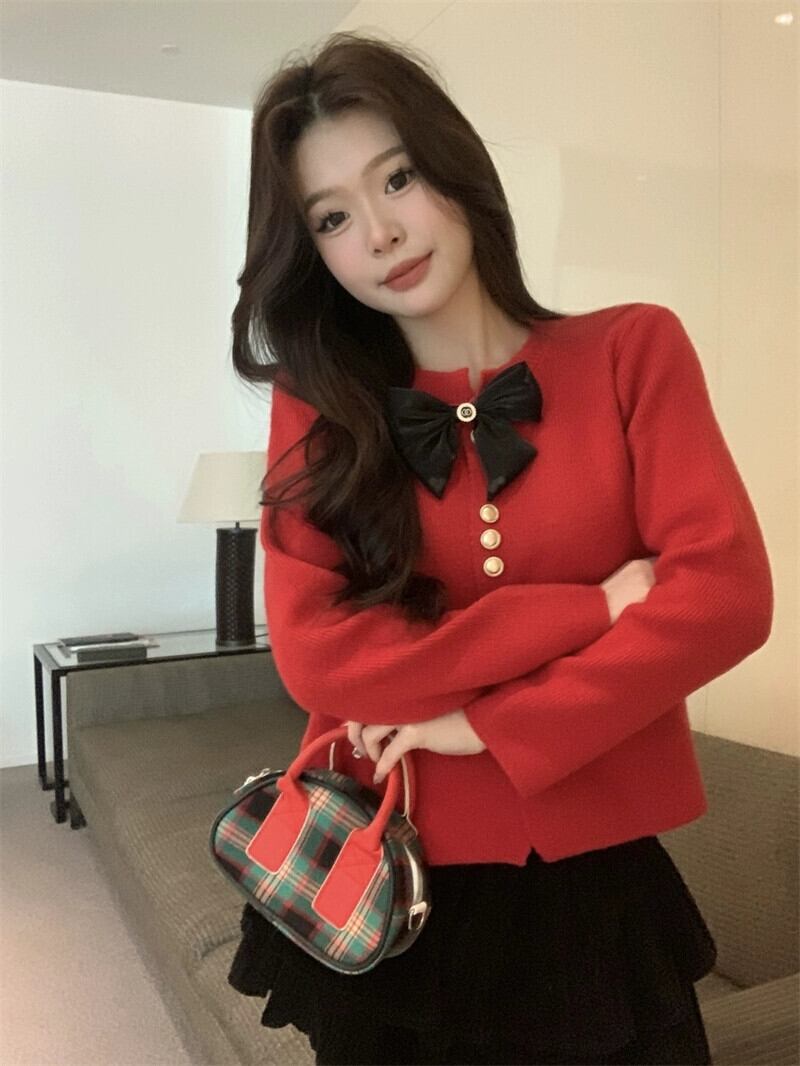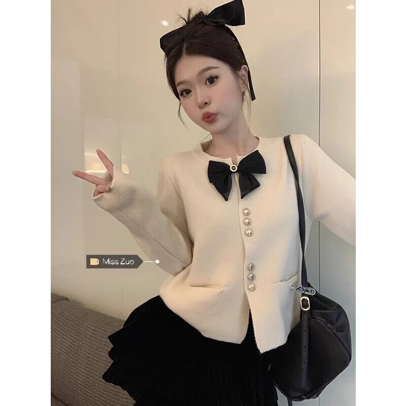 Xiaoxiangfeng リボンニットセーターの女性の秋と冬 2024 新しいスタイルのフレンチルーズショート長袖トップジャケット ロング オータム 秋物 ウィンター 冬物 8571625126922877