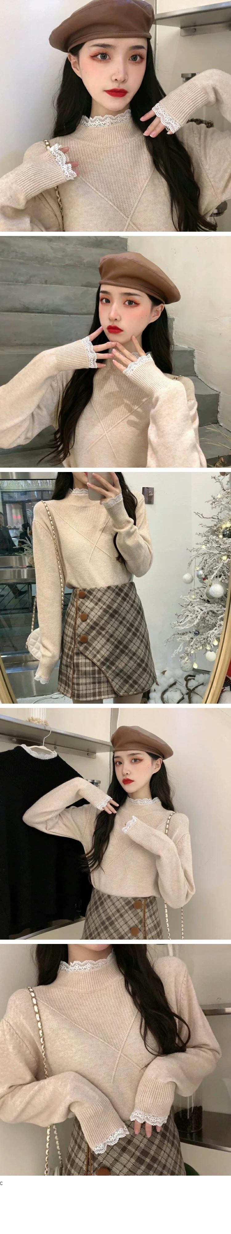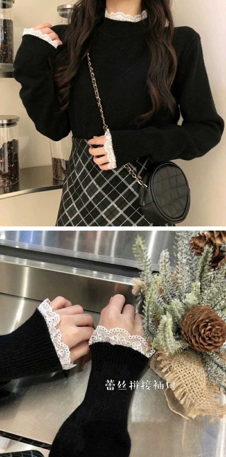 インナーボトムシャツ、レディースデザインニッチトップ、2024年秋新作、シックでスタイリッシュな黒長袖セーター ロング ブラック オータム 秋物 8571623726339055