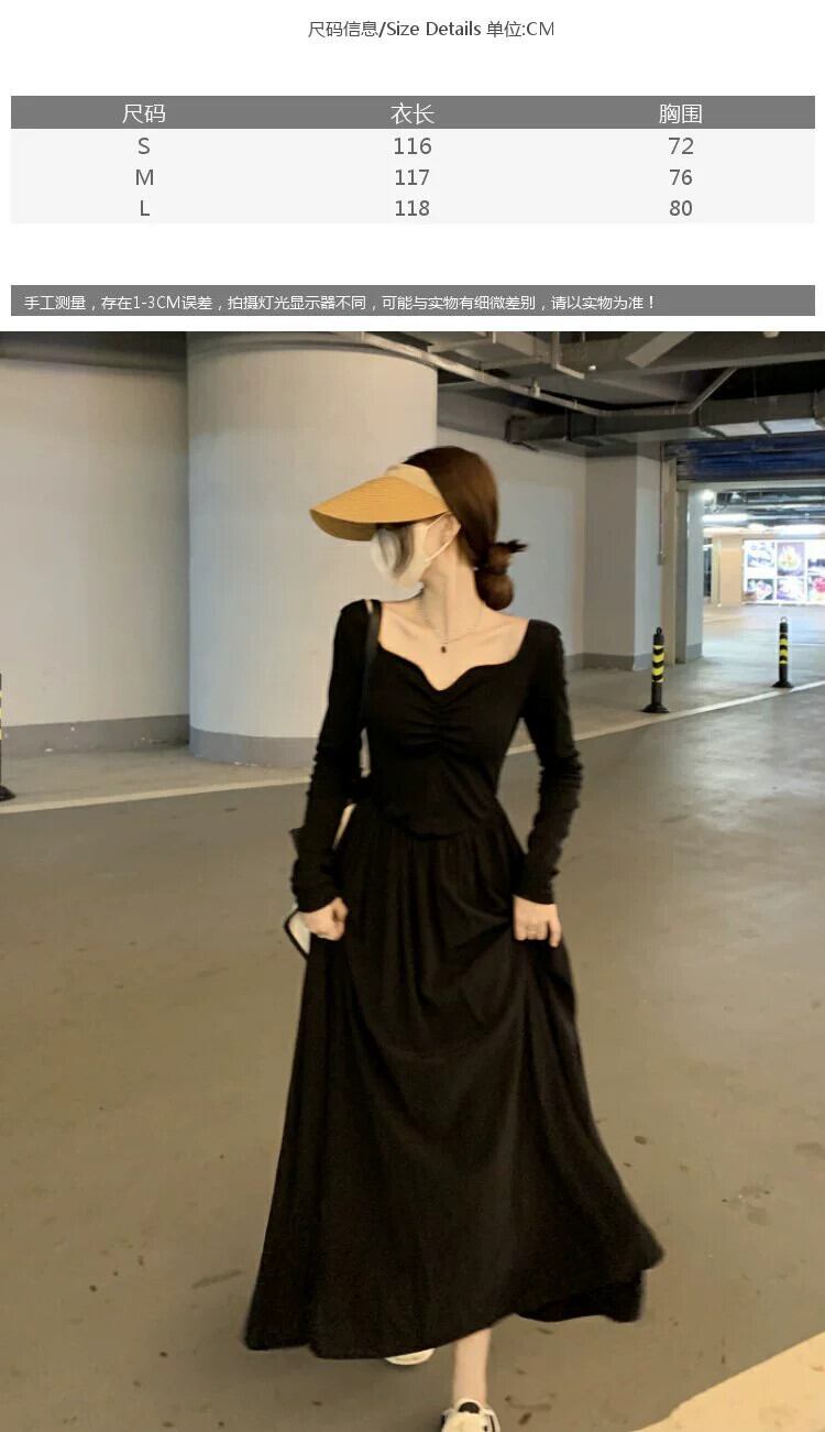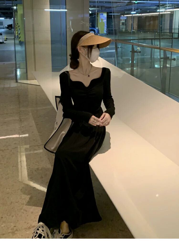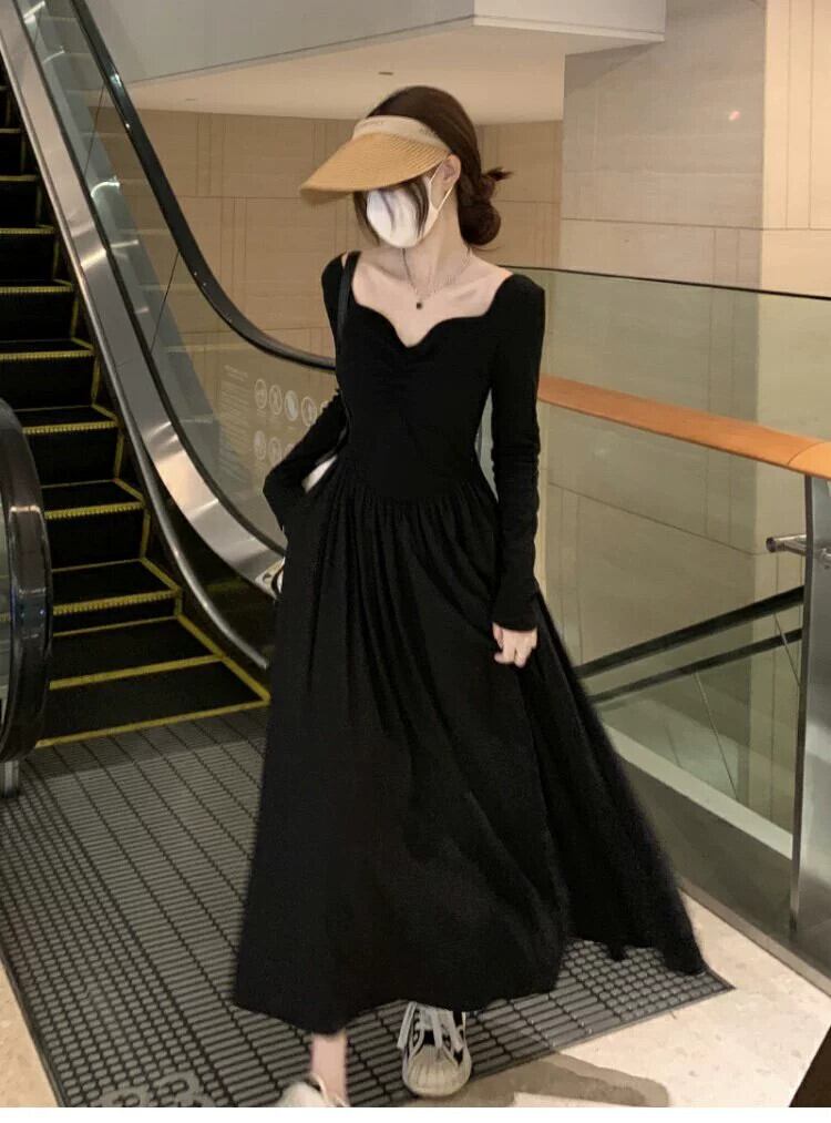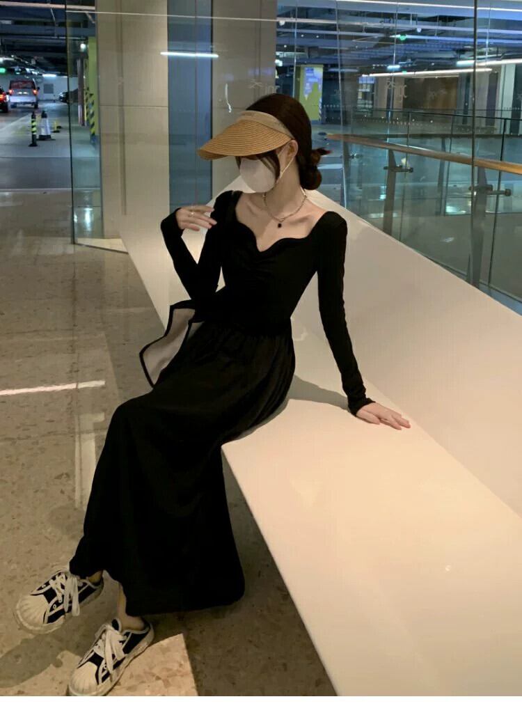 黒長袖ドレスの女性の秋 2024 新しいフレンチヘップバーンスタイルのリトルブラックドレスウエスト痩身ロングスカート オータム 秋物 8571663028294259