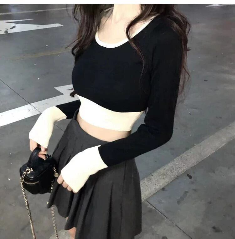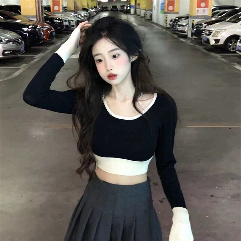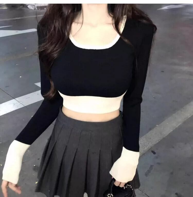 甘いショートトップレディース2024年秋の新デザインユニークでユニークなスリムニット長袖Tシャツ ロング 大人ガーリー スウィート キュート カジュアル オータム 秋物 8571613289457987