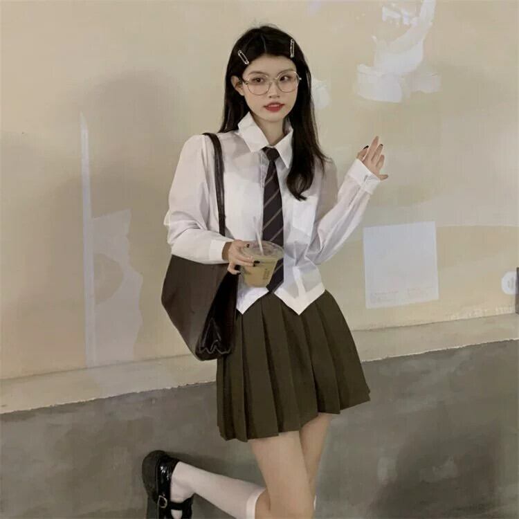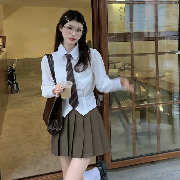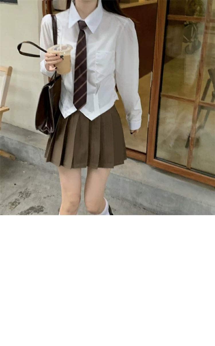 色:ネクタイと白いシャツ,茶色のスカート