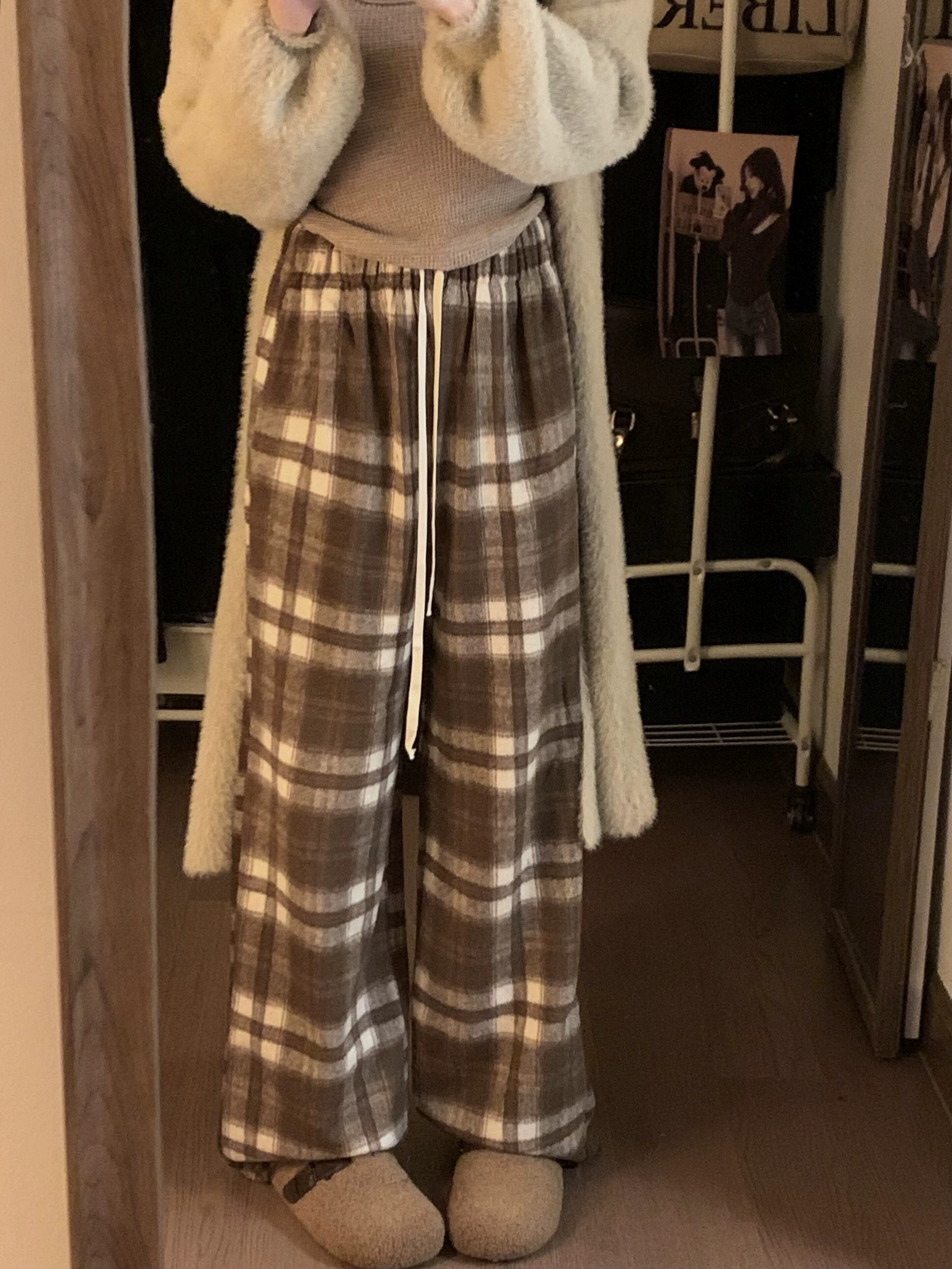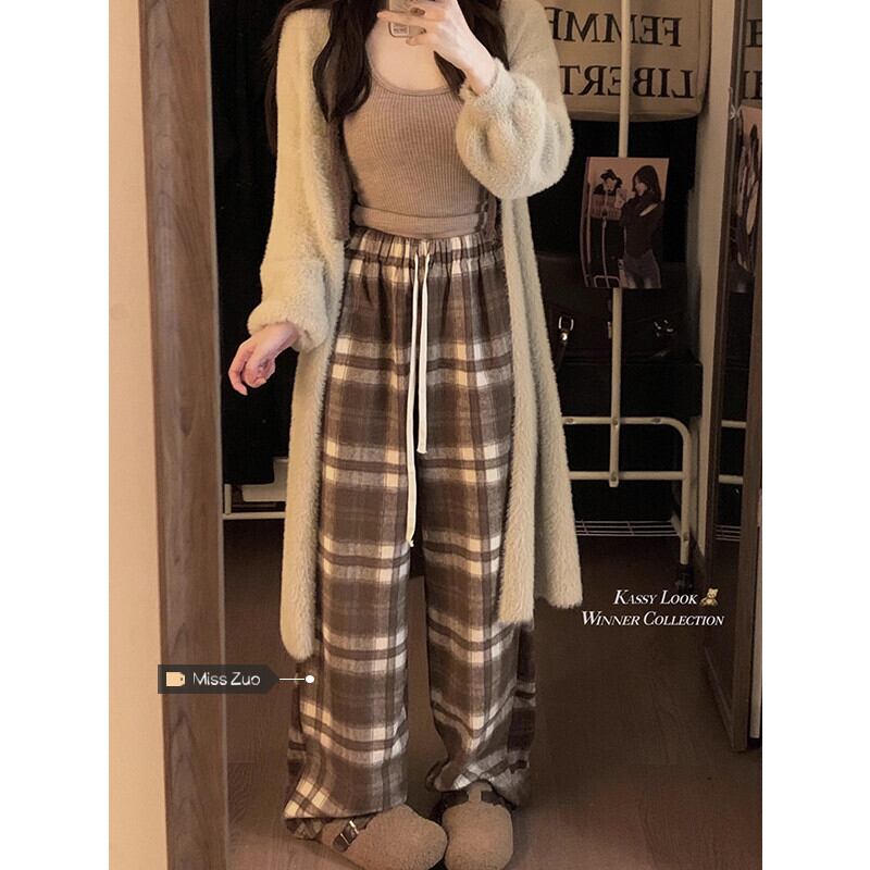 起毛チェック柄ワイドレッグパンツ女性の秋と冬のハイウエストスリムカジュアルパンツ 2024 新しい緩いレトロフロアレングスパンツ オータム 秋物 ウィンター 冬物 8571621600669299