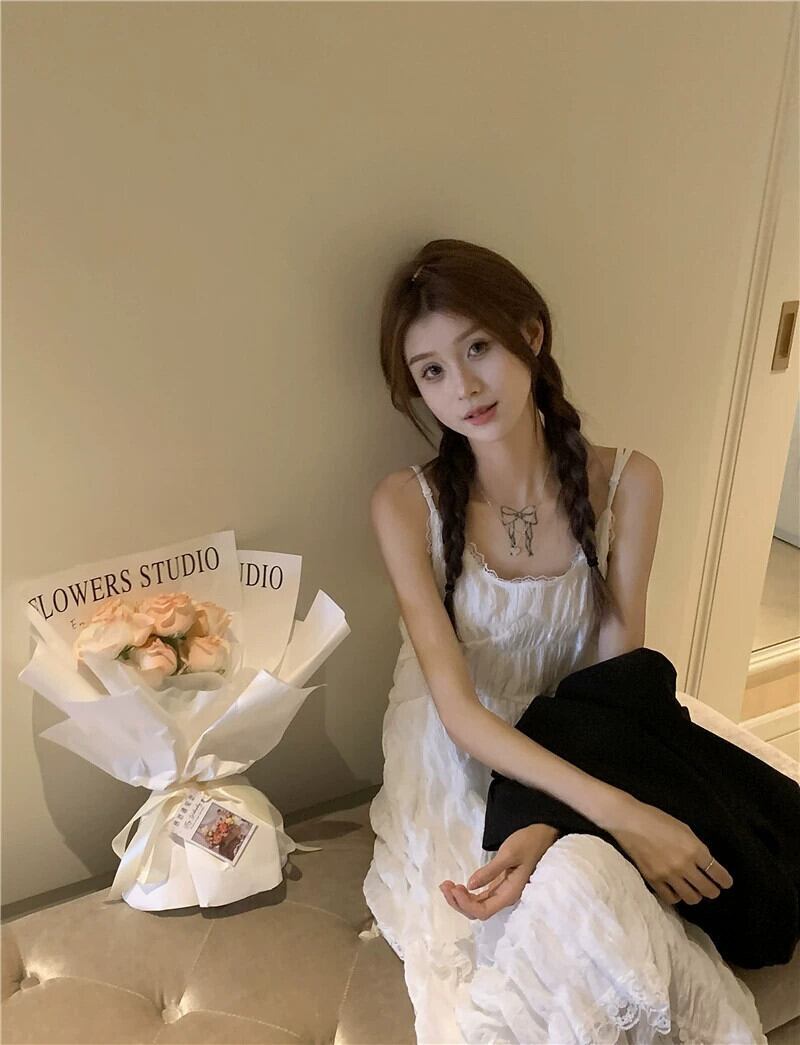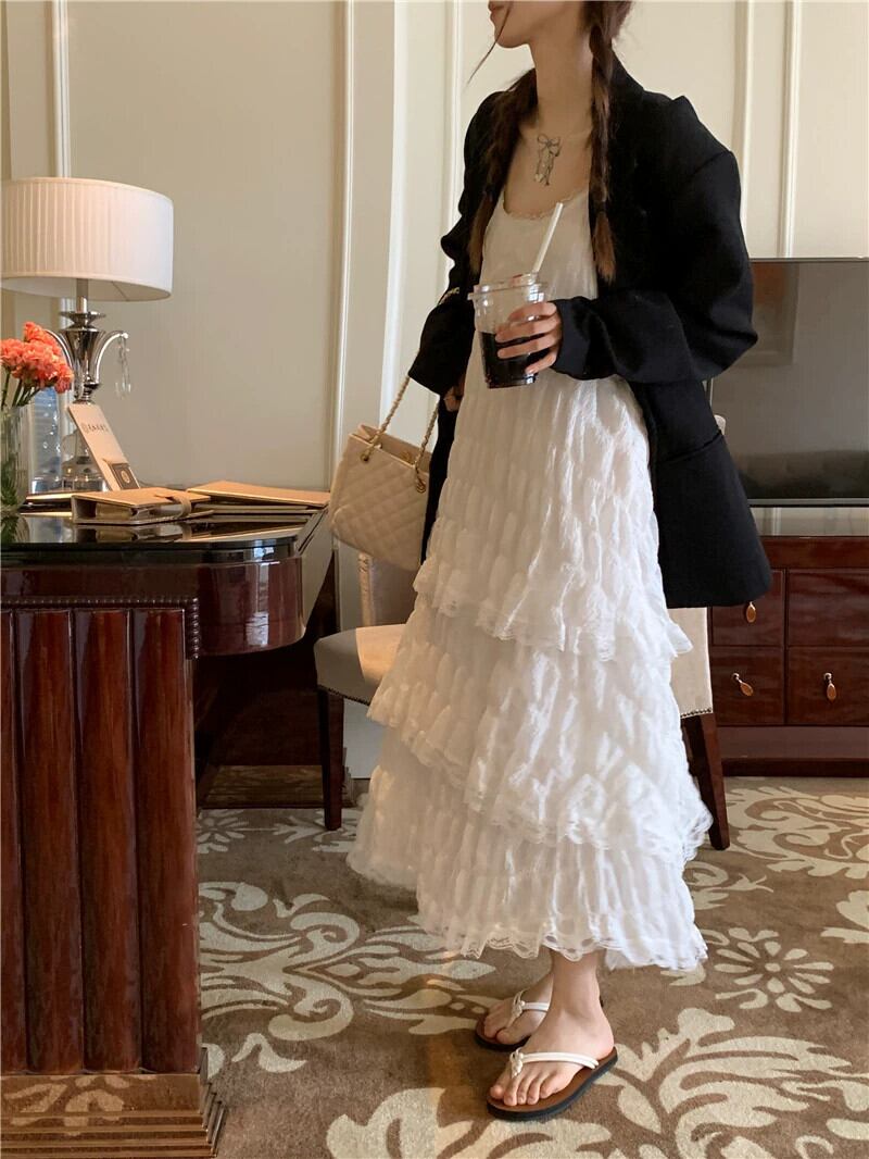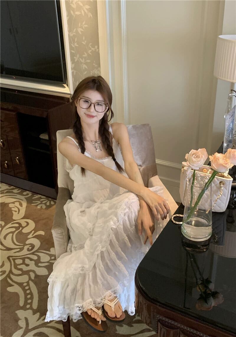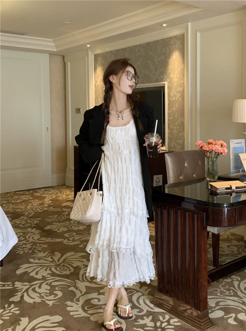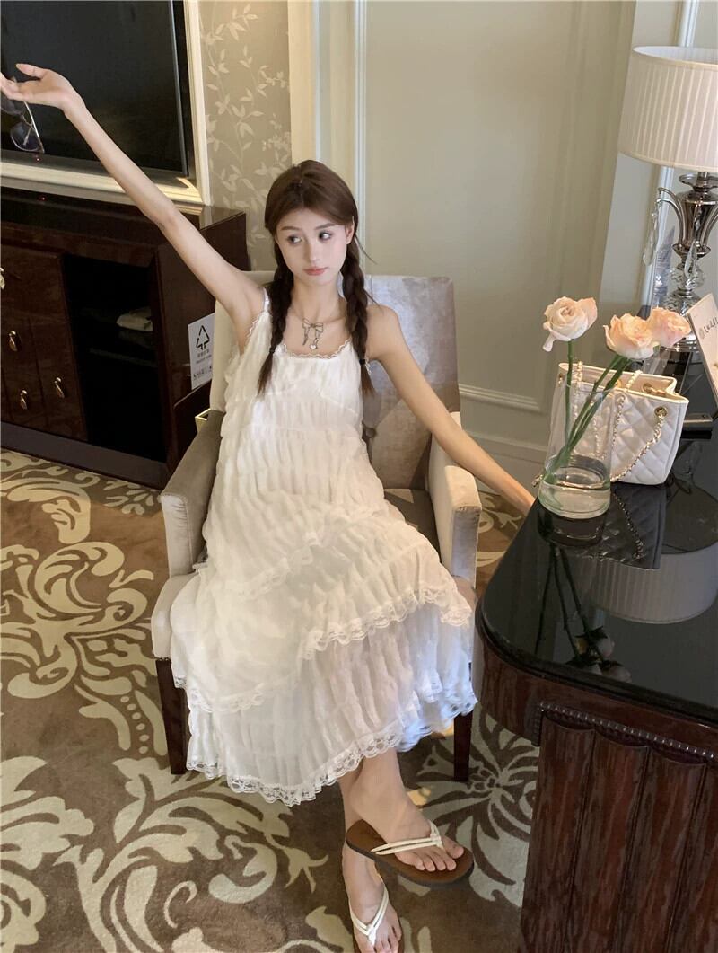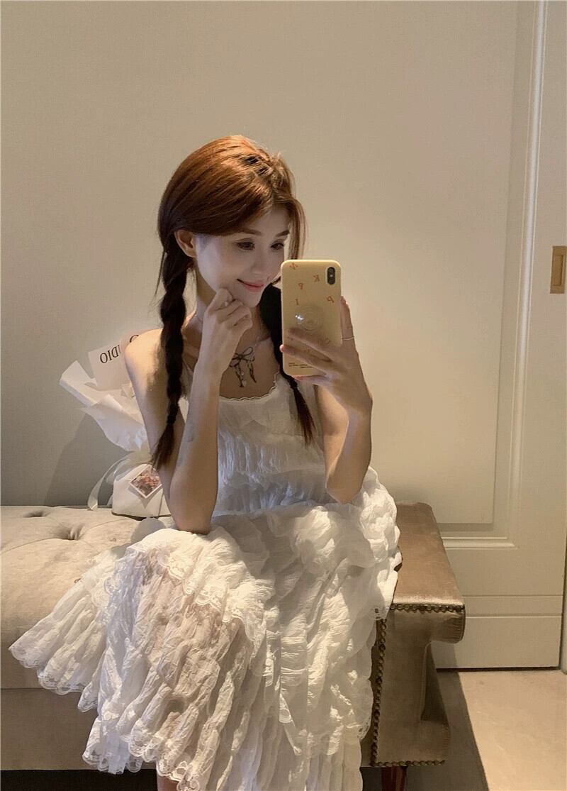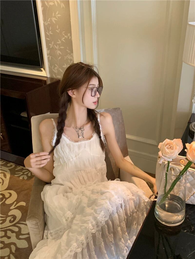ホワイトケーキドレス サスペンダードレス レディース 夏 ニッチデザイン フレンチスイート初恋 スーパーフェアリー ロングスカート 大人ガーリー スウィート キュート カジュアル サマー 夏物 8571639194970457