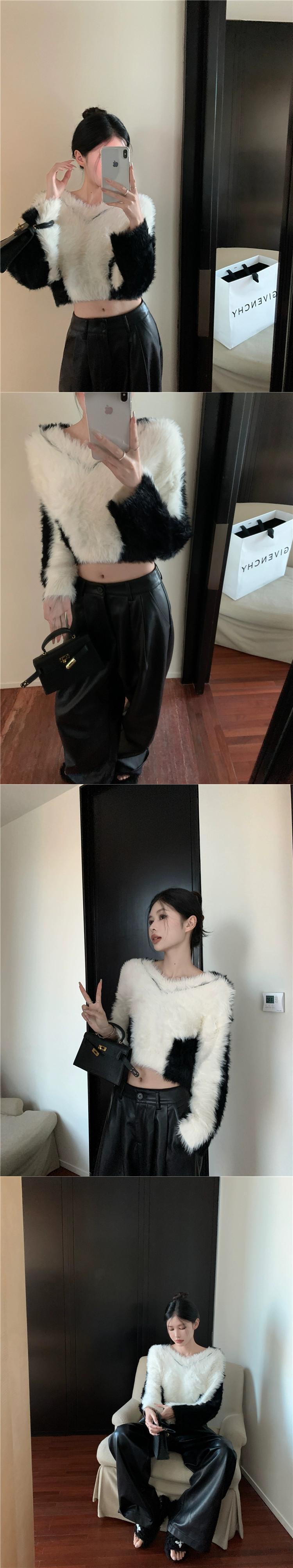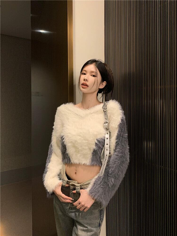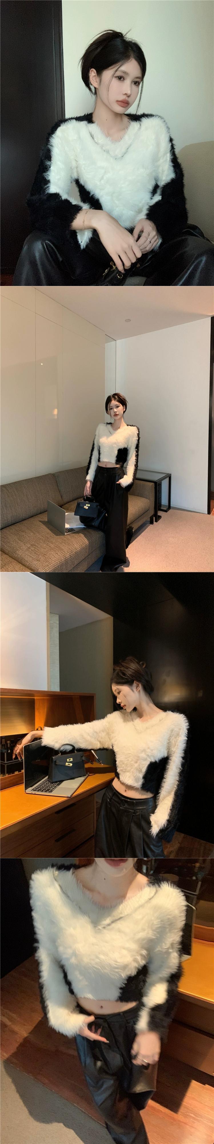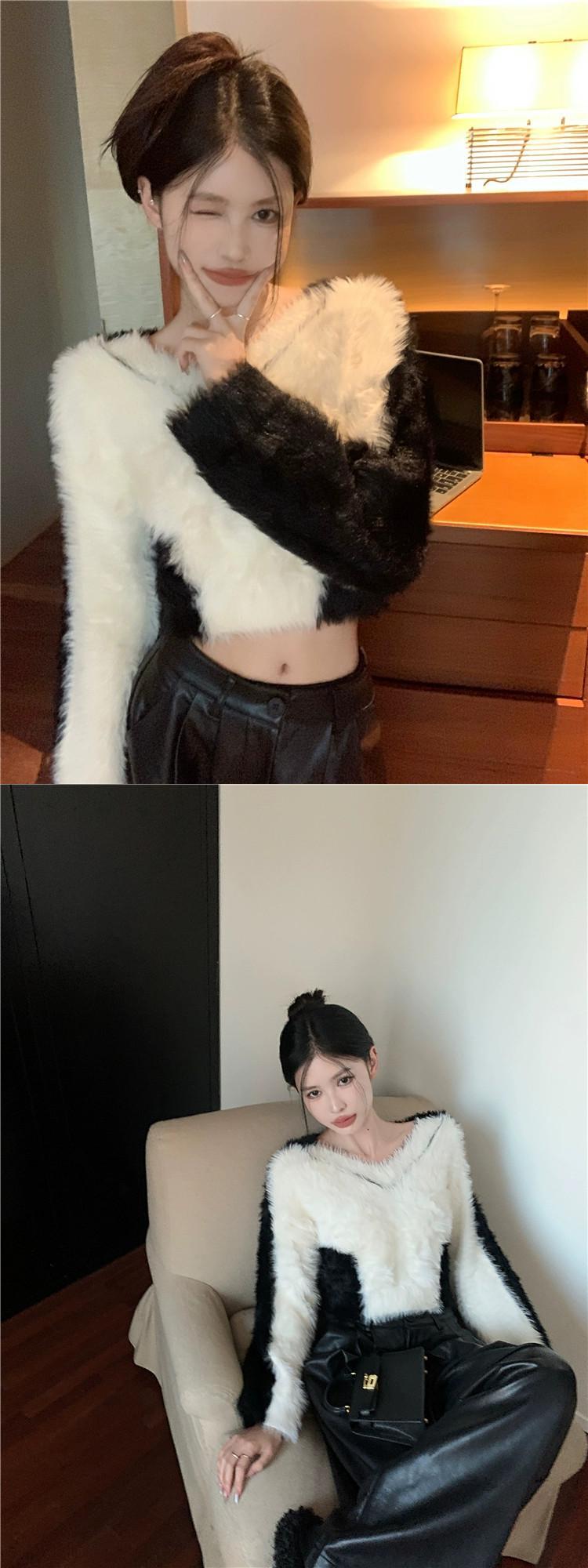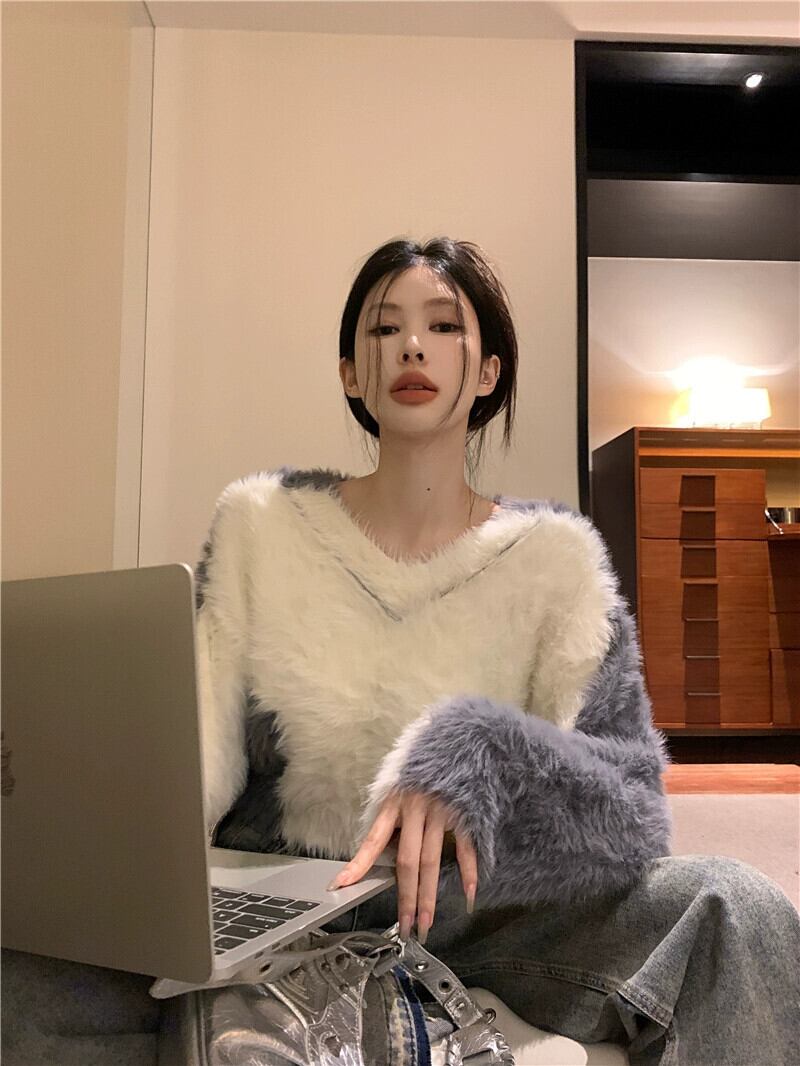 模造ミンクベルベットコントラストカラーセーター女性の秋と冬ボトリングセーターホットガールソフトとワックスシックな V ネックショートトップ オータム 秋物 ウィンター 冬物 Vネック 8571680416168721
