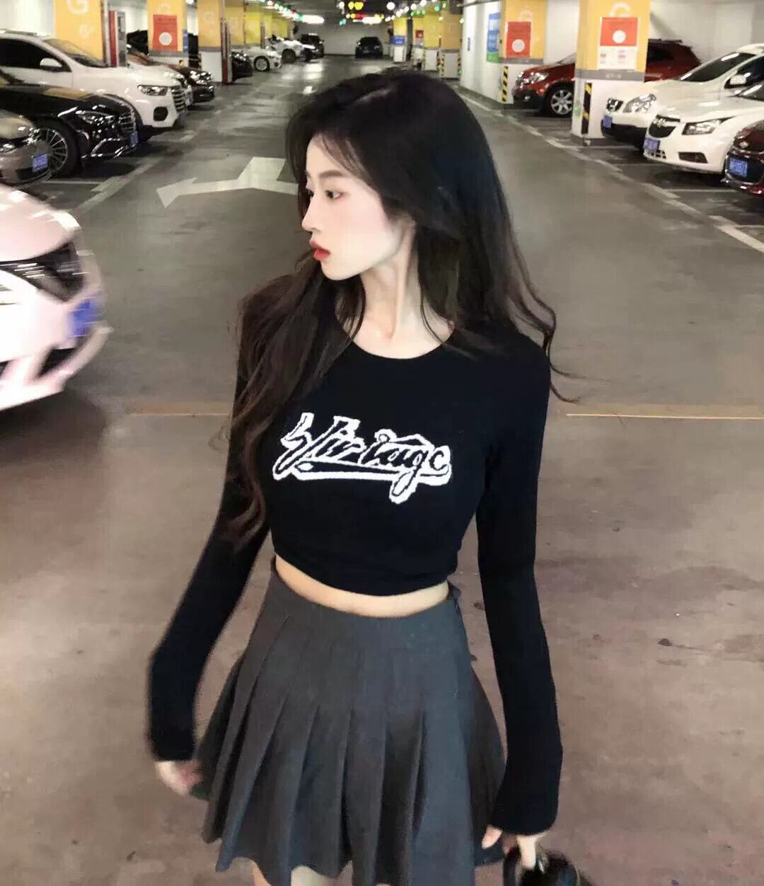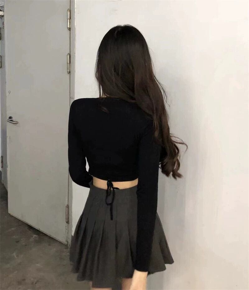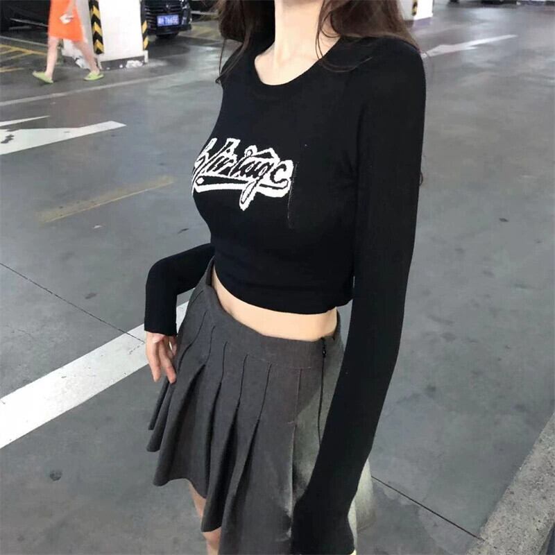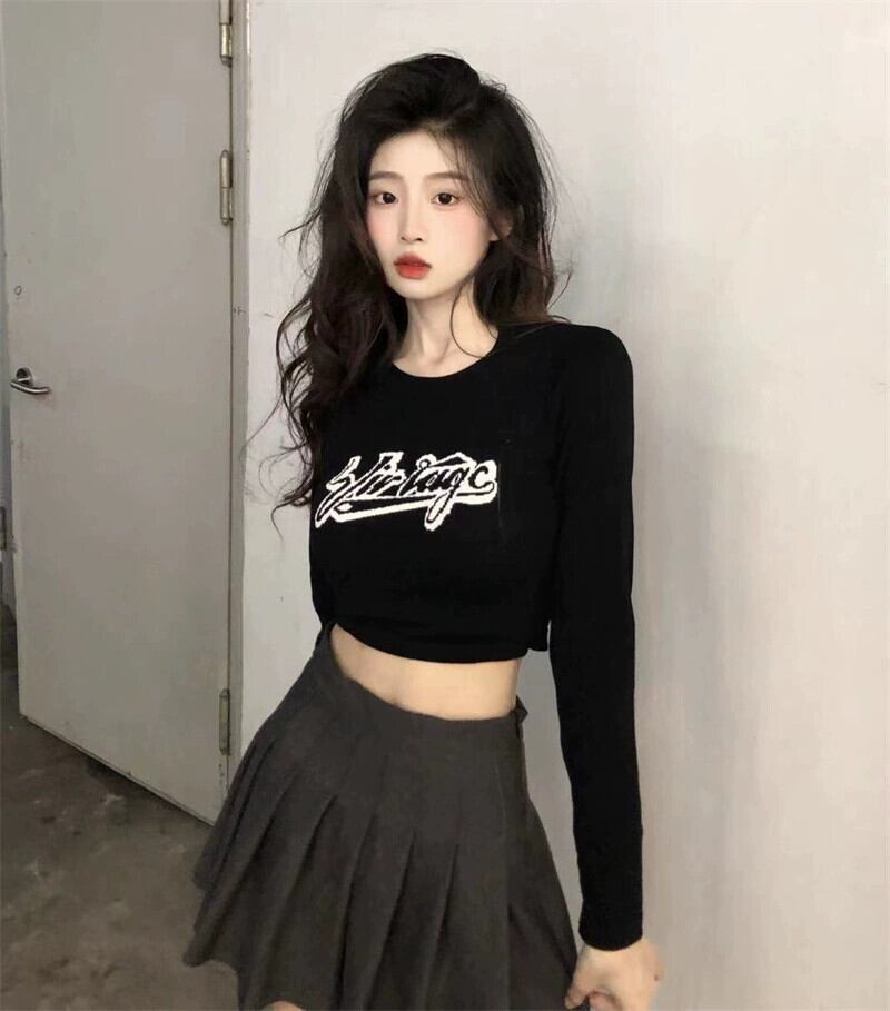黒のニット長袖 T シャツの女性の秋と冬のインナー レイヤリング シャツ純粋な欲望の甘くてスパイシーなスリム フィットへそ出し bm ショート トップ ロング ブラック 大人ガーリー スウィート キュート カジュアル オータム 秋物 ウィンター 冬物 Tシャツ ピュア 8571641839693797