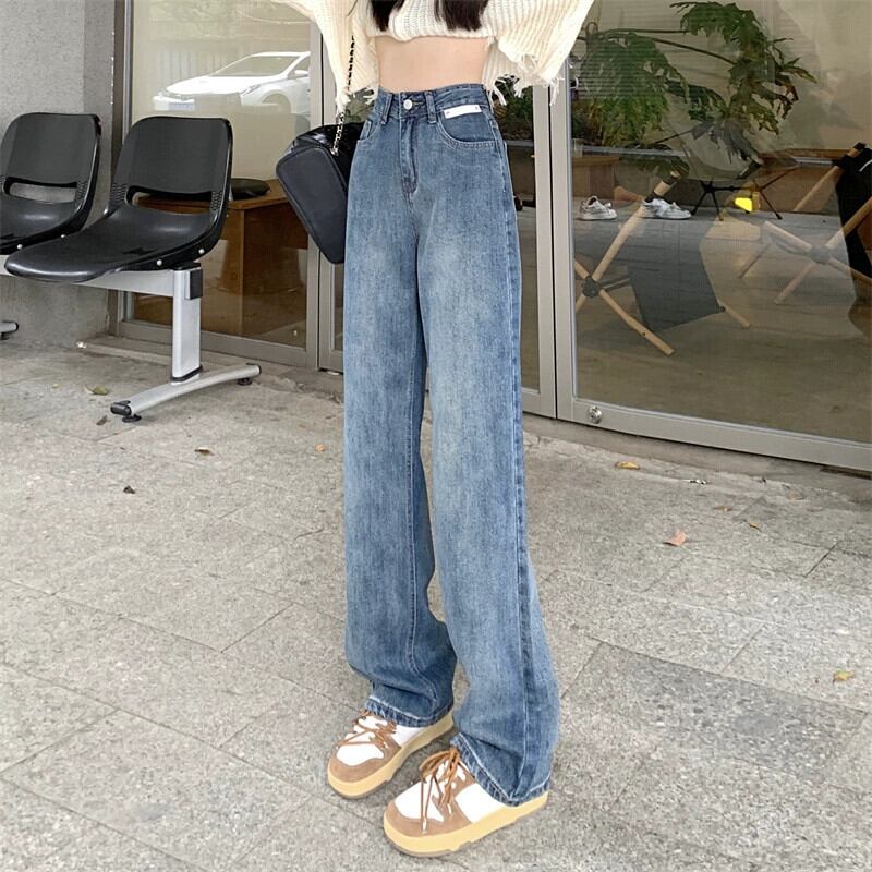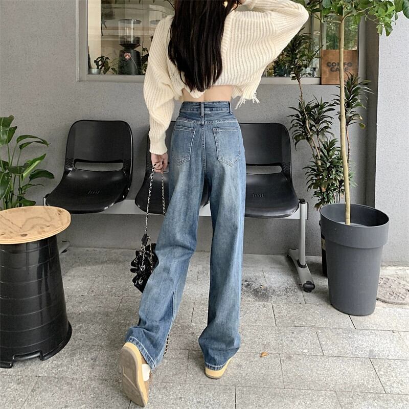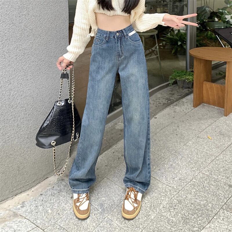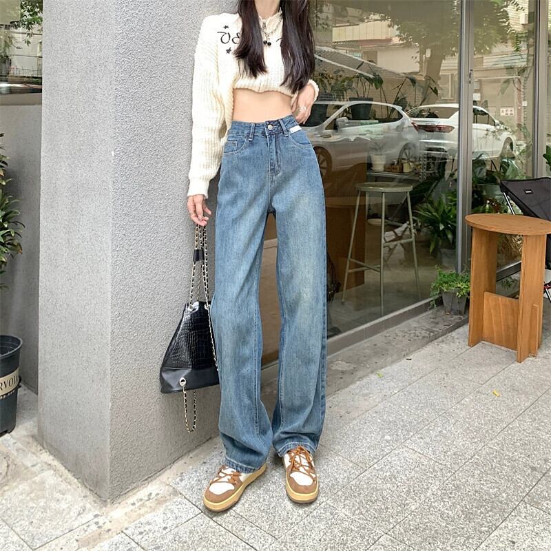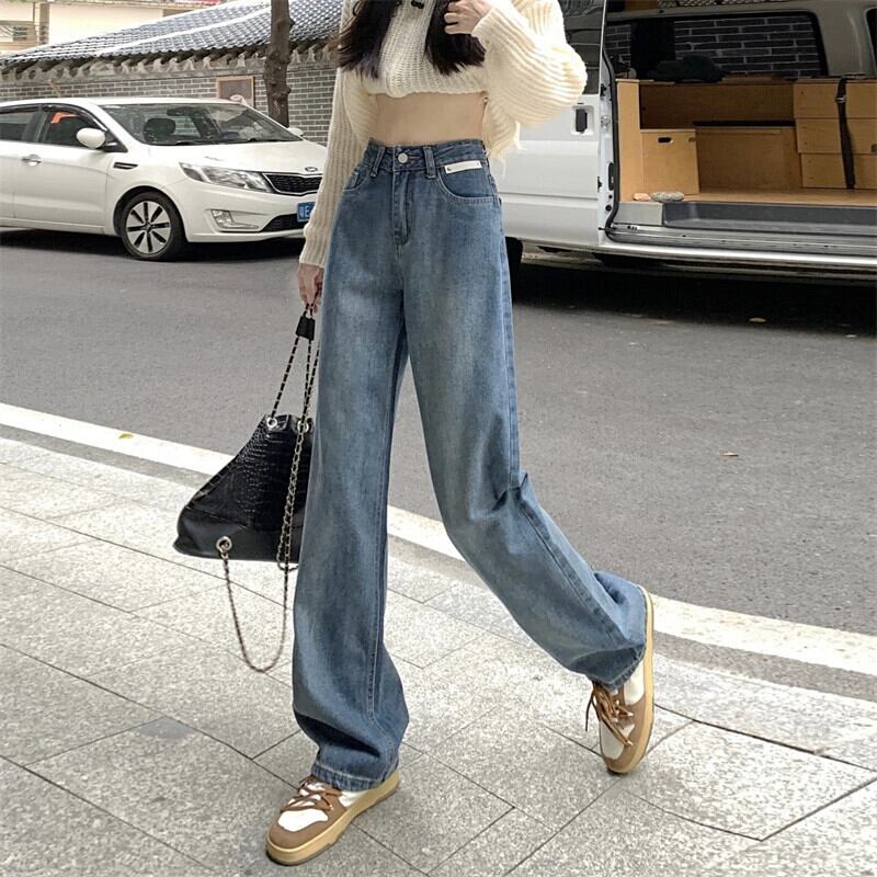 レトロジーンズレディースルーズストレートパンツ2024秋の新スタイルの小さなハイウエストスリムフロアレングスワイドレッグパンツ オータム 秋物 8571638131015552