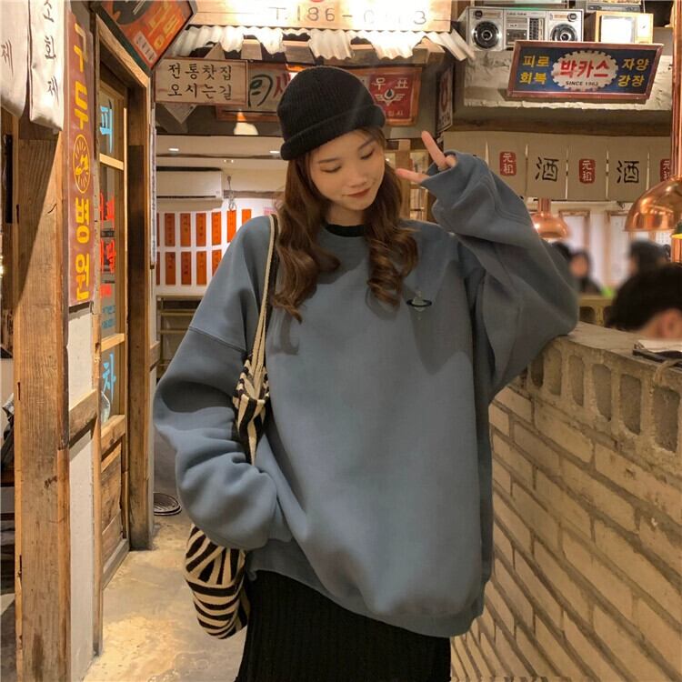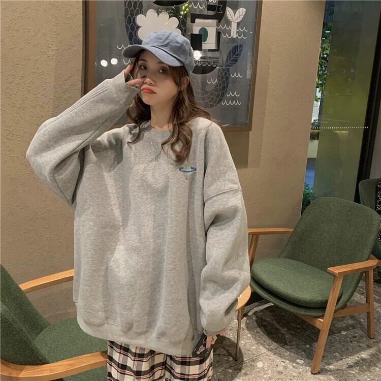 グレーラウンドネックスウェットシャツ女性の秋と冬プラスベルベット 2024 新しいアメリカンレトロ BF 怠惰なスタイル緩いトレンディなブランドトップ オータム 秋物 ウィンター 冬物 Oネック 8571617261058328
