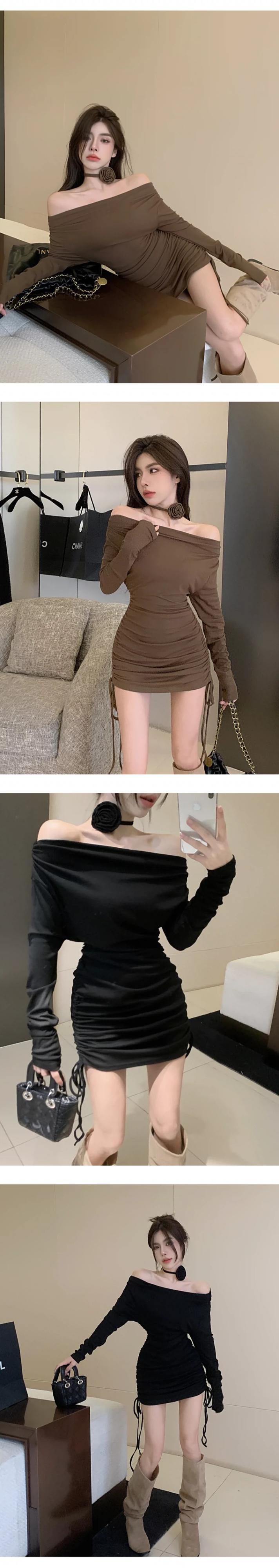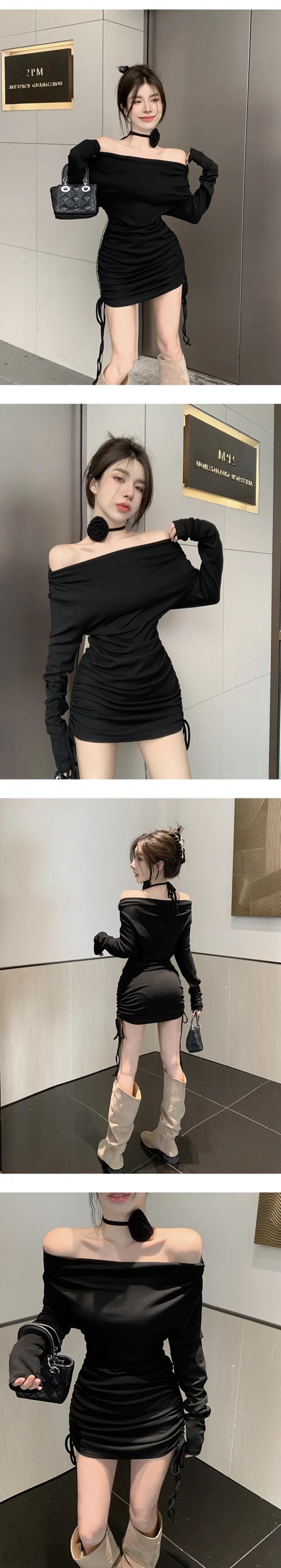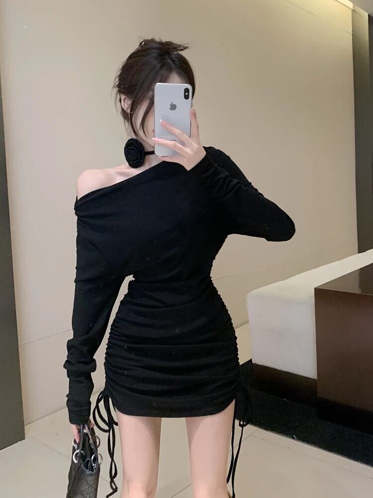 ワンショルダー長袖ドレスの女性、秋のメイラードウェア、セクシーなネクタイ、セクシーな体型を包み込むショートスカート ロング オータム 秋物 857167334771017