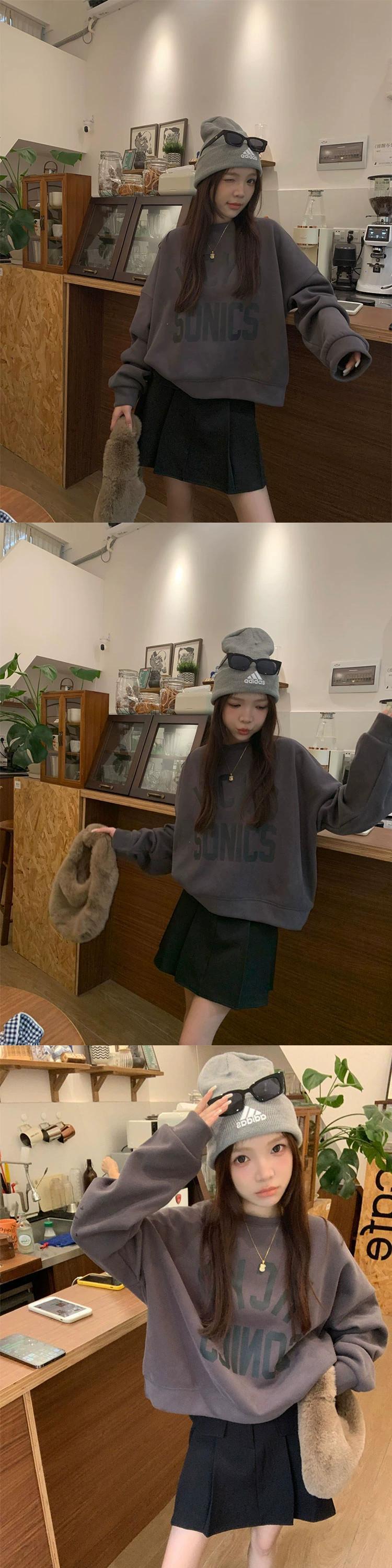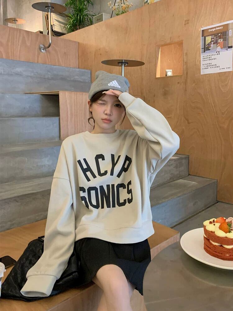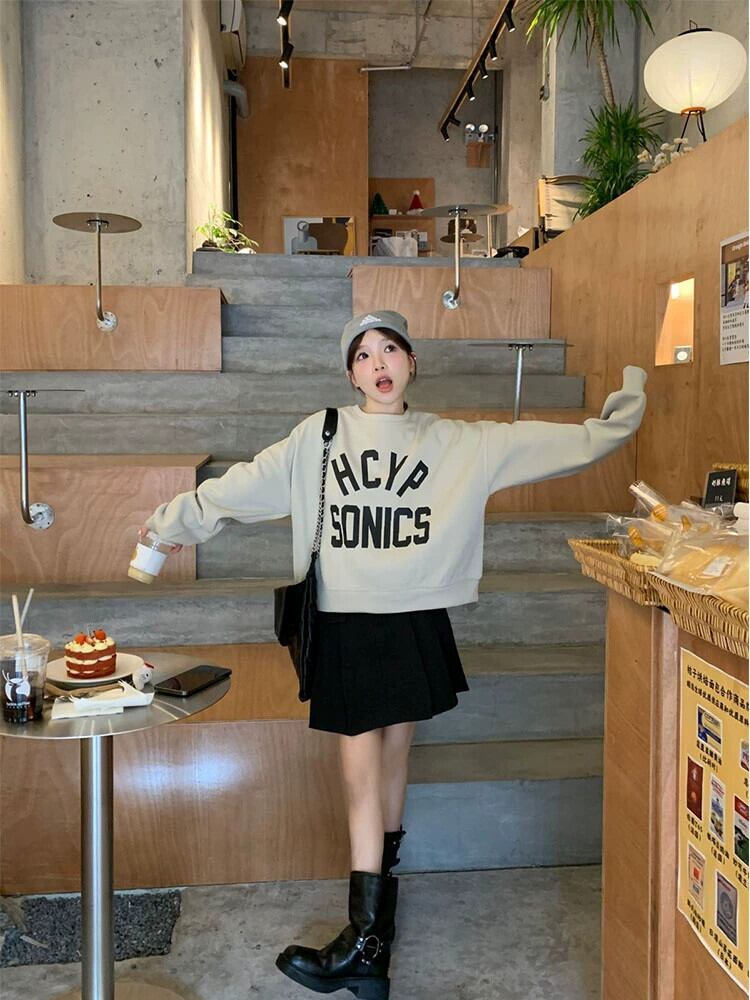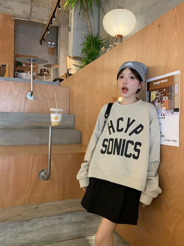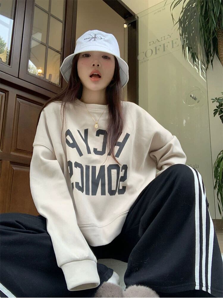 アプリコットラウンドネックスウェットシャツの女性の秋肥厚 2024 新しいアメリカンレトロルーズで eign スタイル長袖トップ小人 ロング オータム 秋物 Oネック 857163864071631