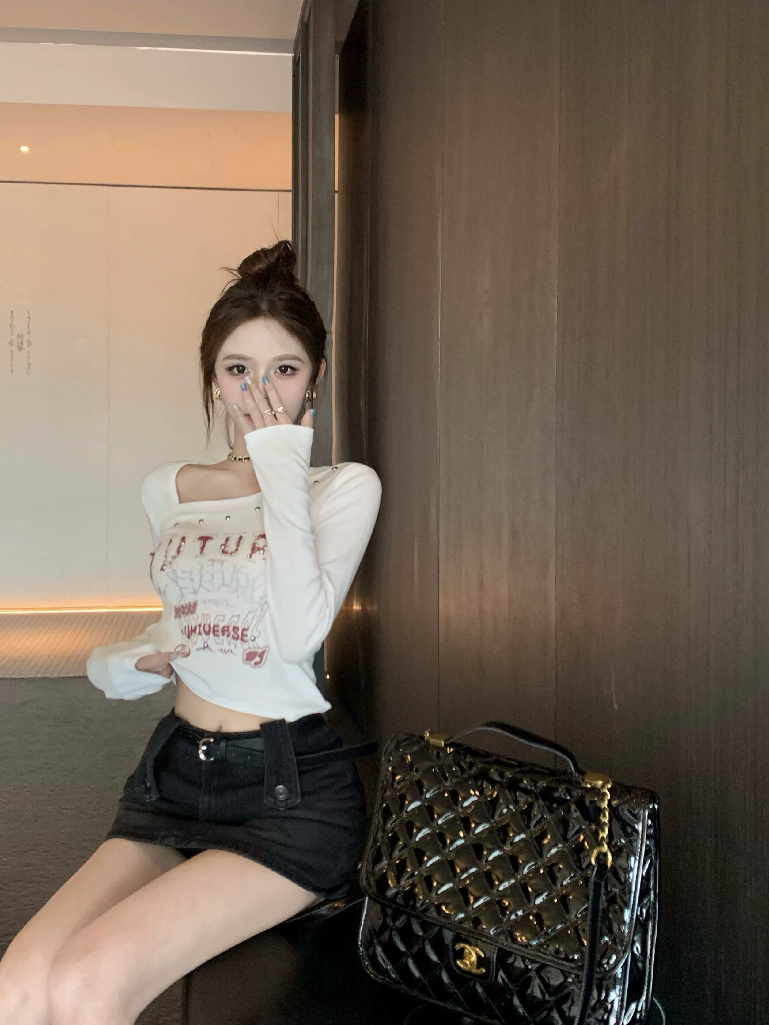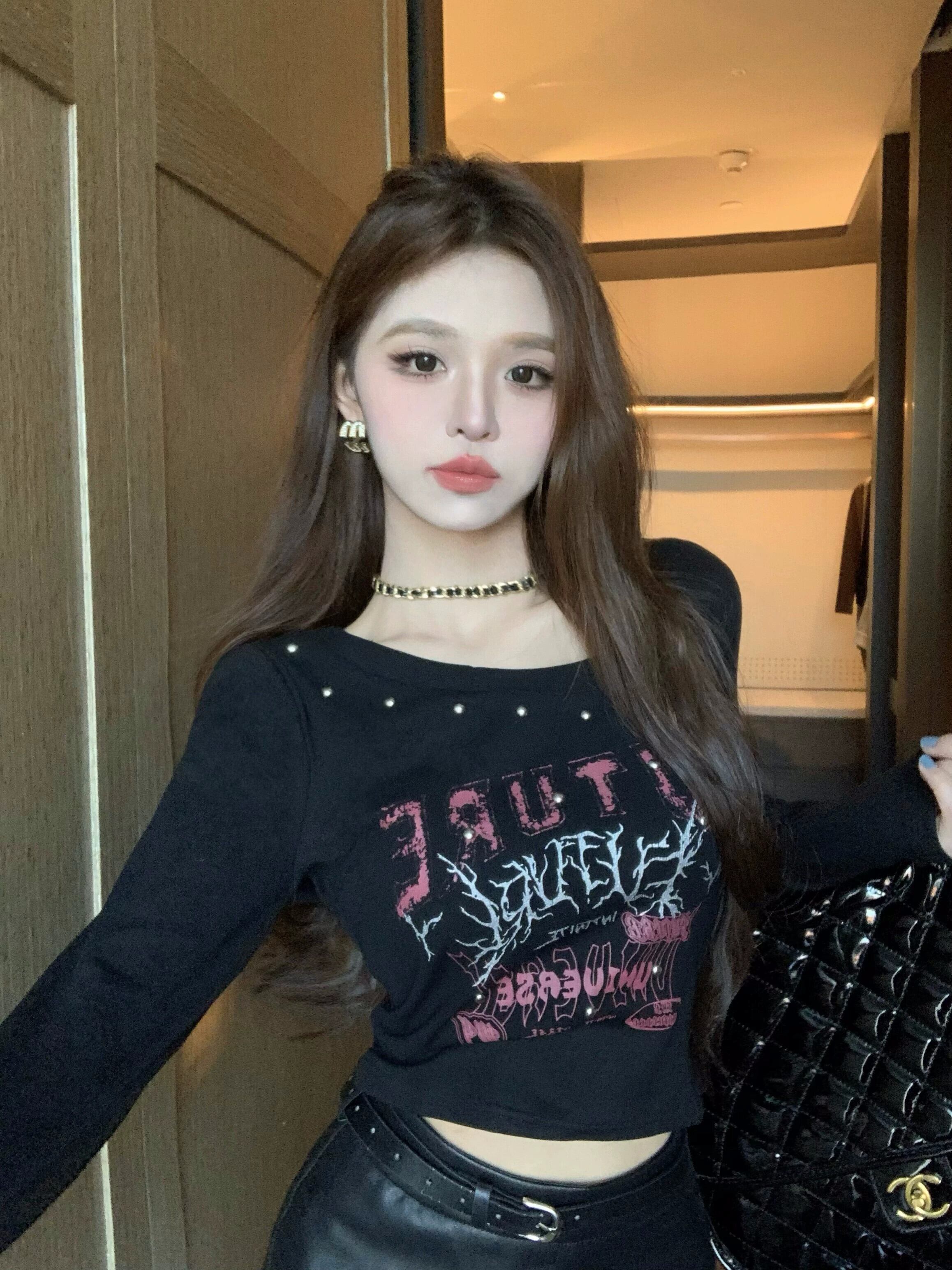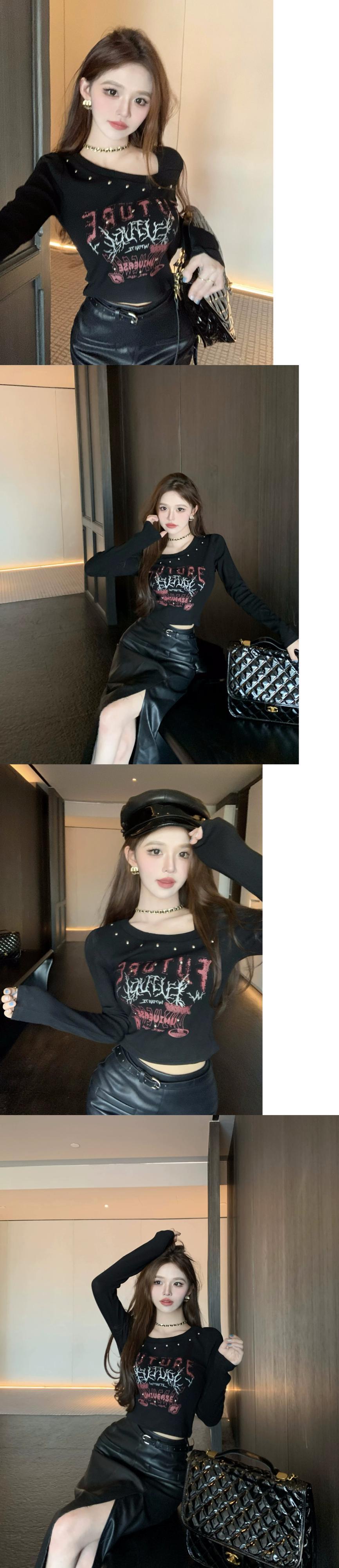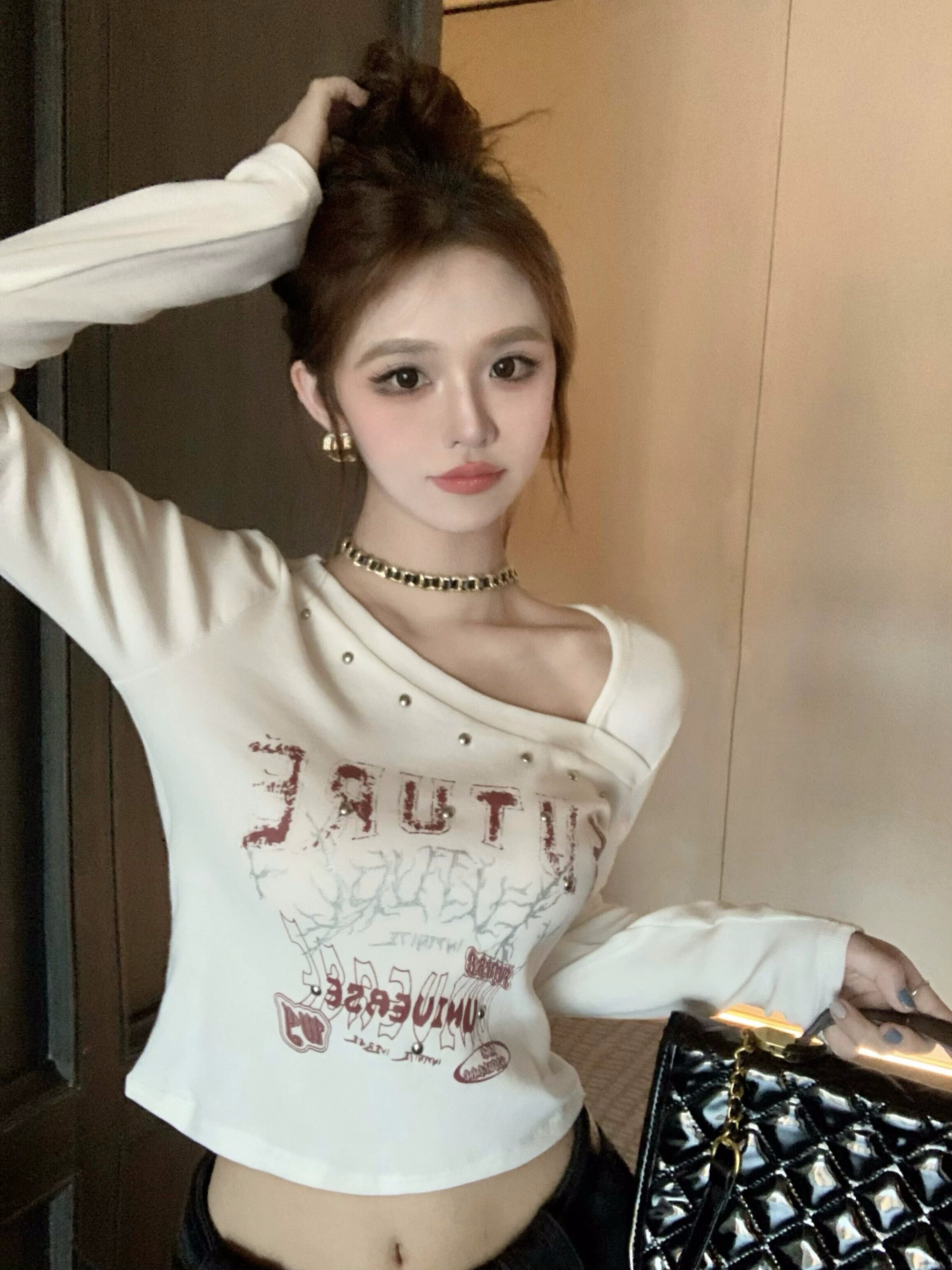 白い長袖 T シャツの女性、秋のインナー レイヤリング シャツ、アメリカン レトロなネクタイ スリムフィット ビーズ スロープ カラー ショート トップ ロング ホワイト オータム 秋物 Tシャツ 8571611500498906
