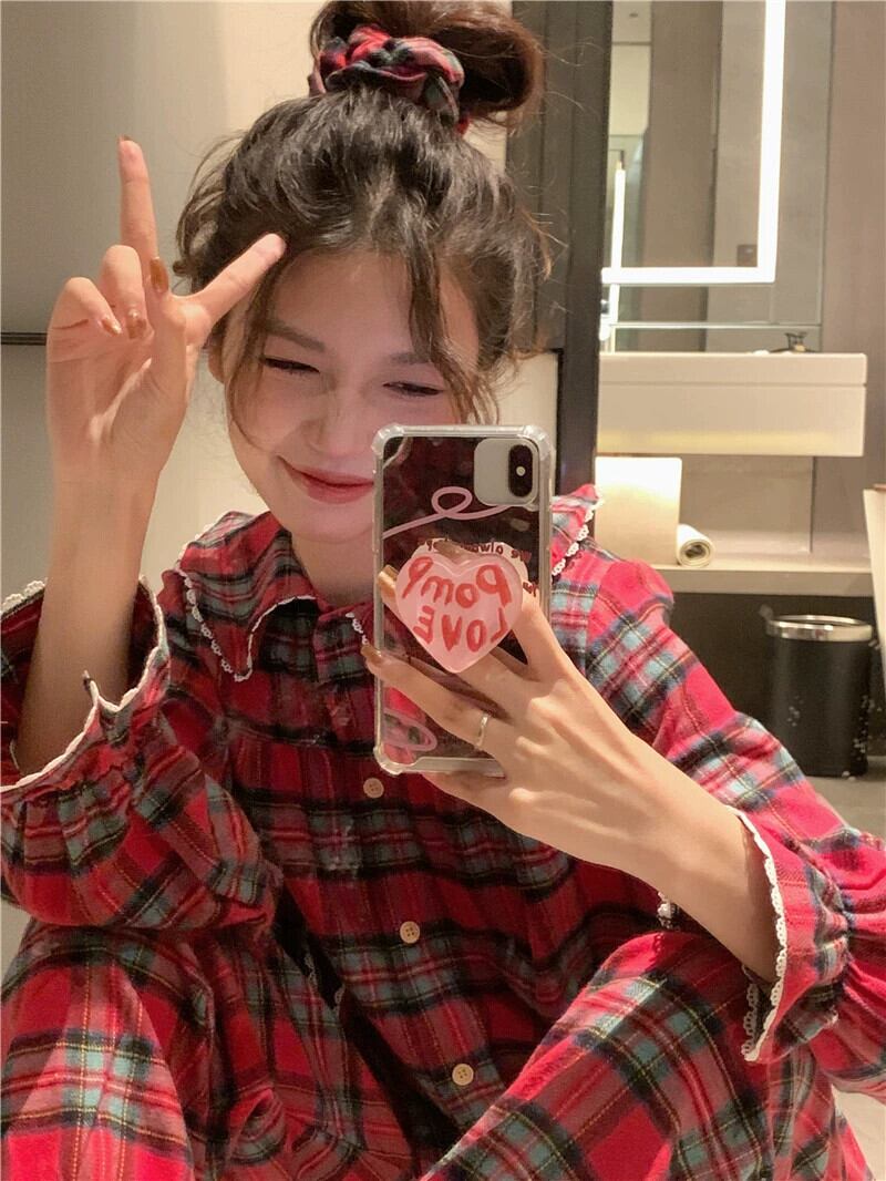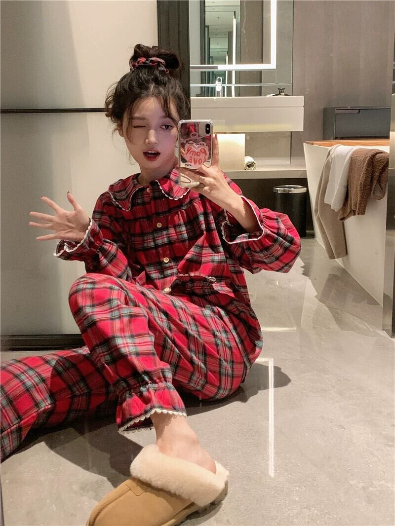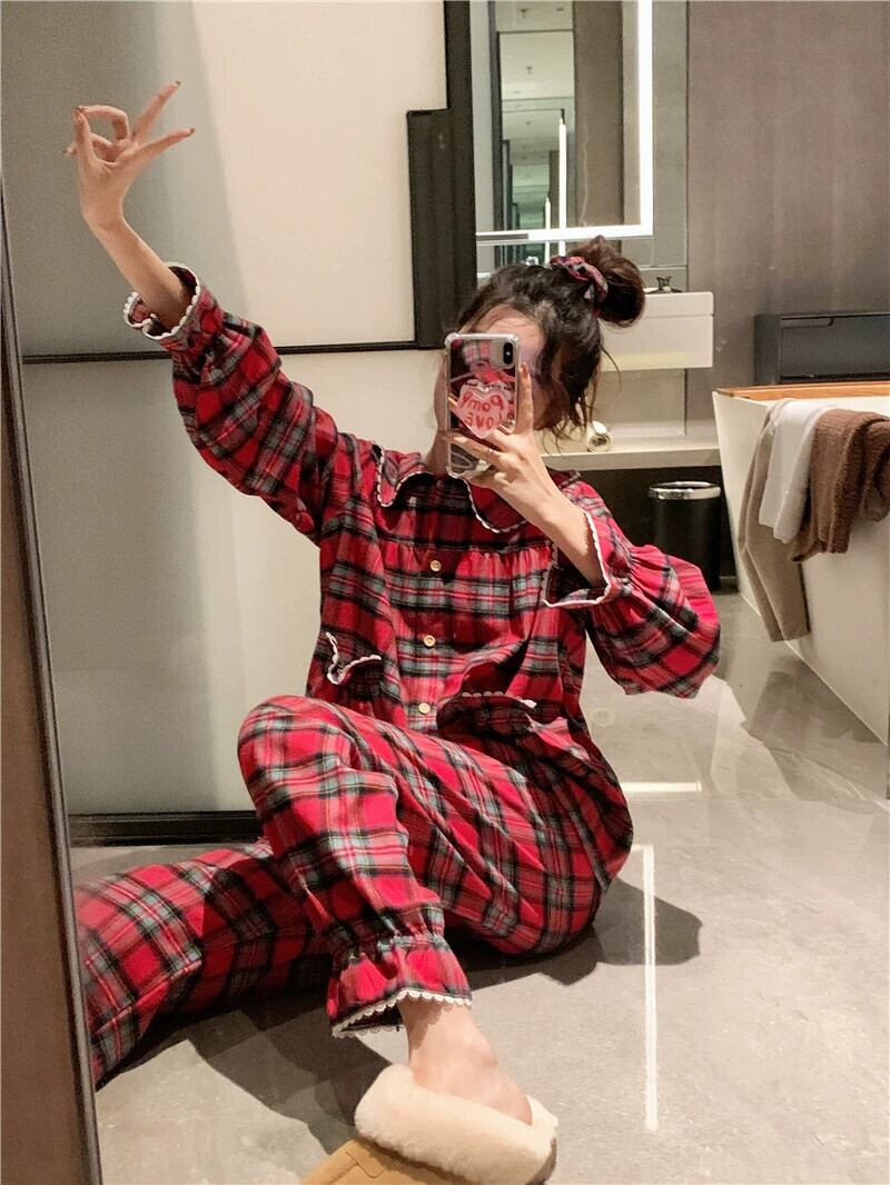 春と秋のチェック柄パジャマ女性は屋外で着用できます。2024年の新しいスタイルのかわいいとハイエンドの長袖ズボンホームウェアセット ロング 大人ガーリー スウィート キュート カジュアル スプリング 春物 オータム 秋物 8571636009101111