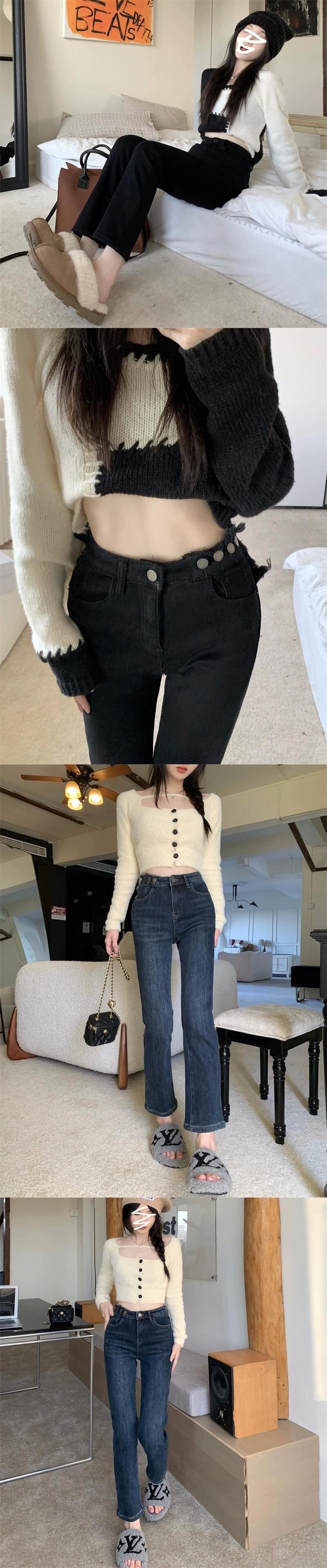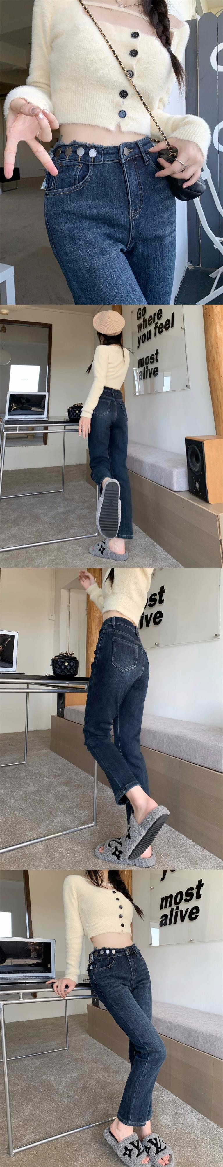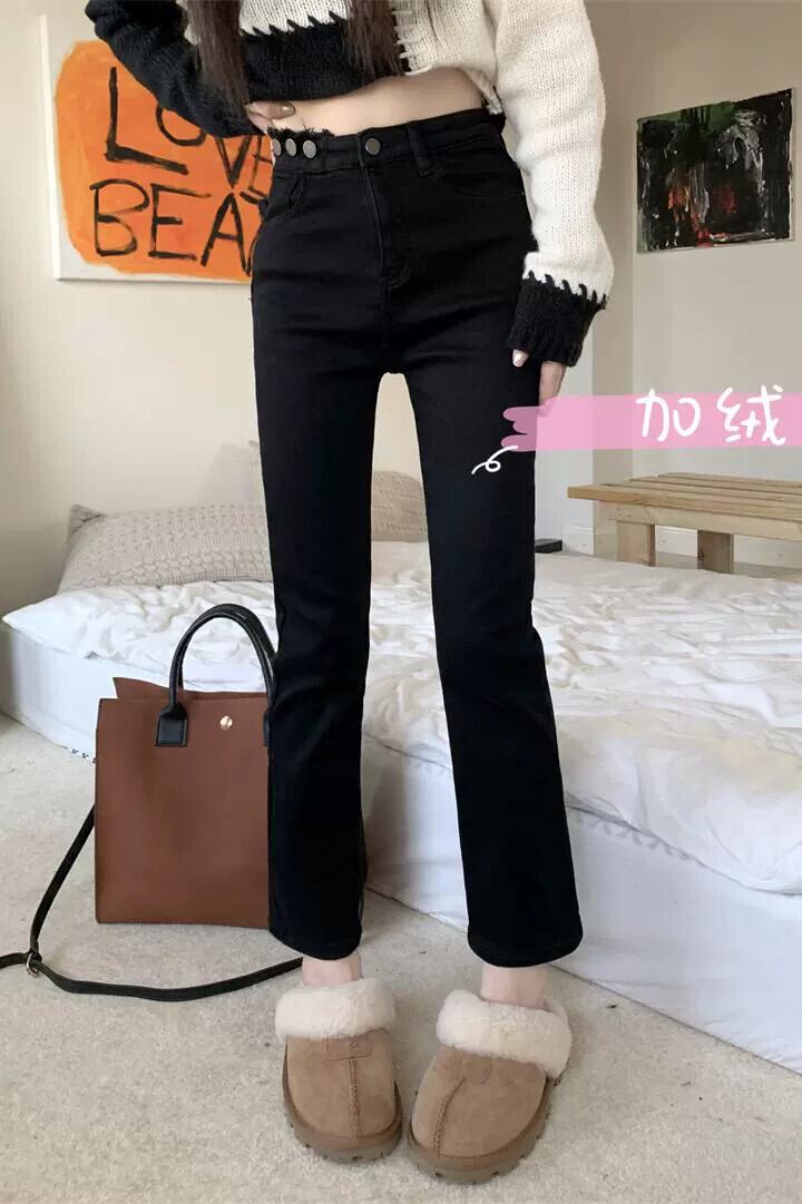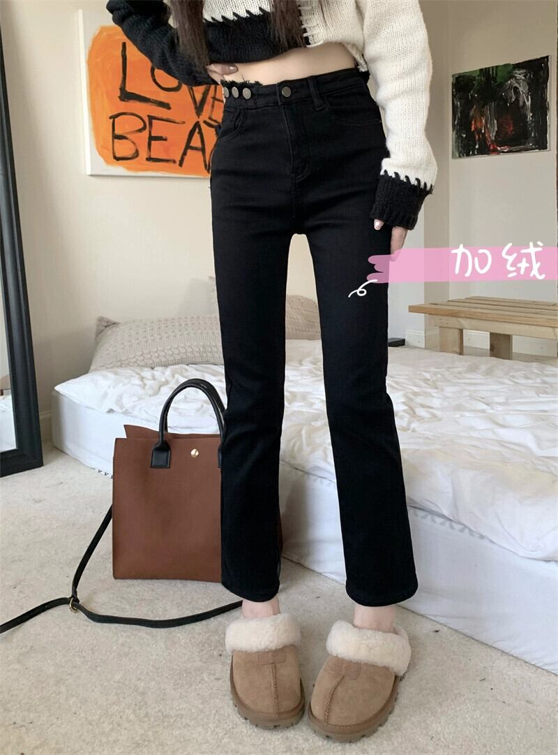 黒の 9 点ジーンズの女性の秋冬ベルベット肥厚ストレートパンツ 2024 新しいスタイルスリムシガレットパンツ小人 ブラック オータム 秋物 ウィンター 冬物 8571691283820299