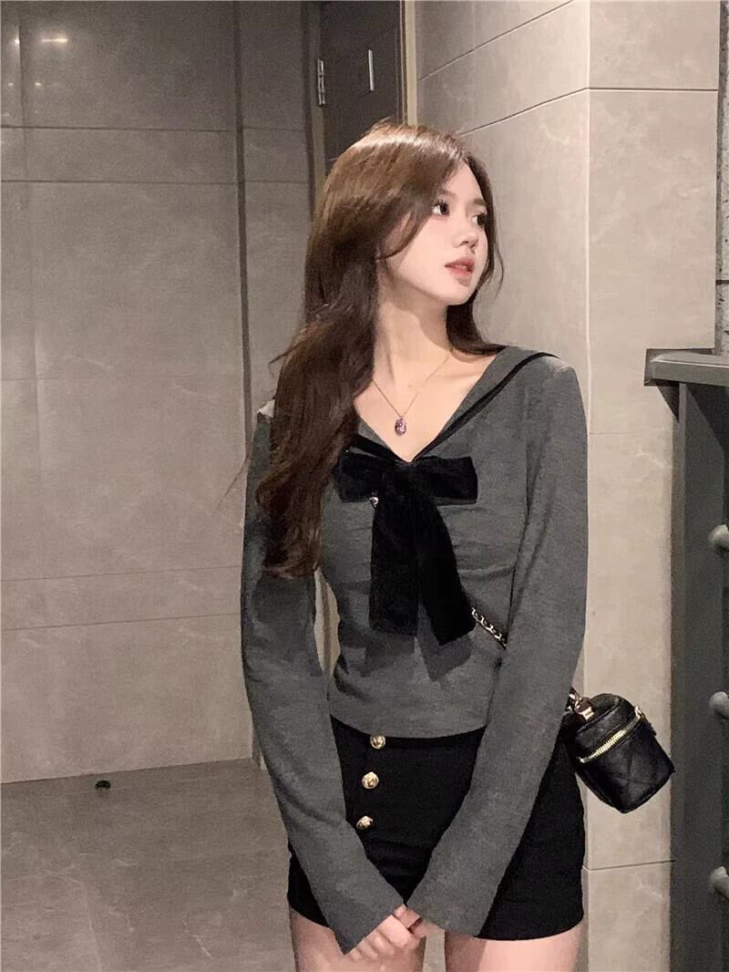 ネイビーカラーショートトップレディース秋ボトムシャツ純粋な欲望今年人気の美しいリボン長袖Tシャツ ロング オータム 秋物 ピュア 857162113647892