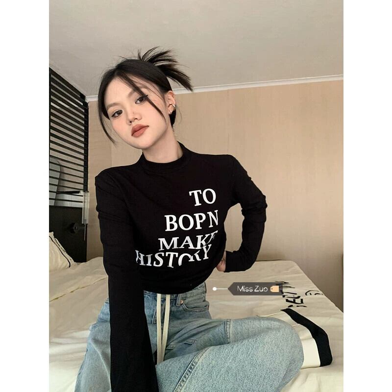 秋と冬の黒の長袖Tシャツの女性、厚いベルベット、ハーフタートルネック、インナーレイヤリングシャツ、アメリカンレトロショートトップ ロング ブラック オータム 秋物 ウィンター 冬物 8571695108092860