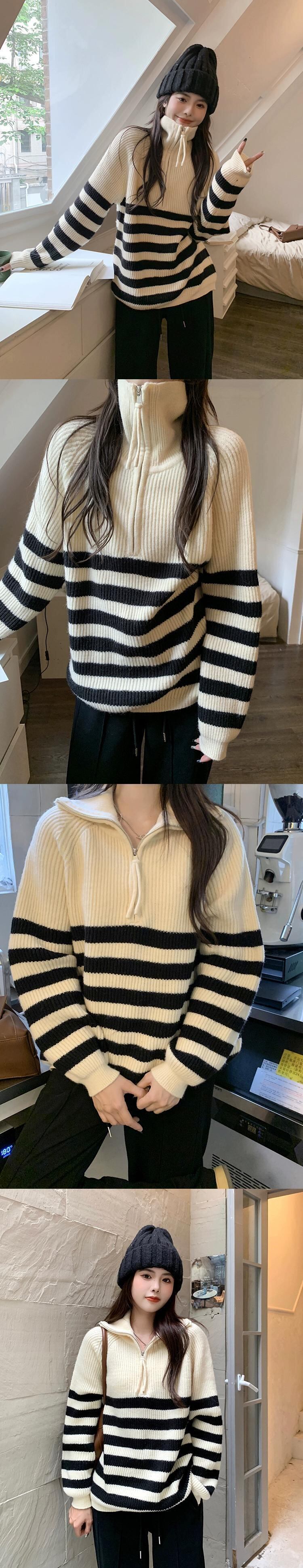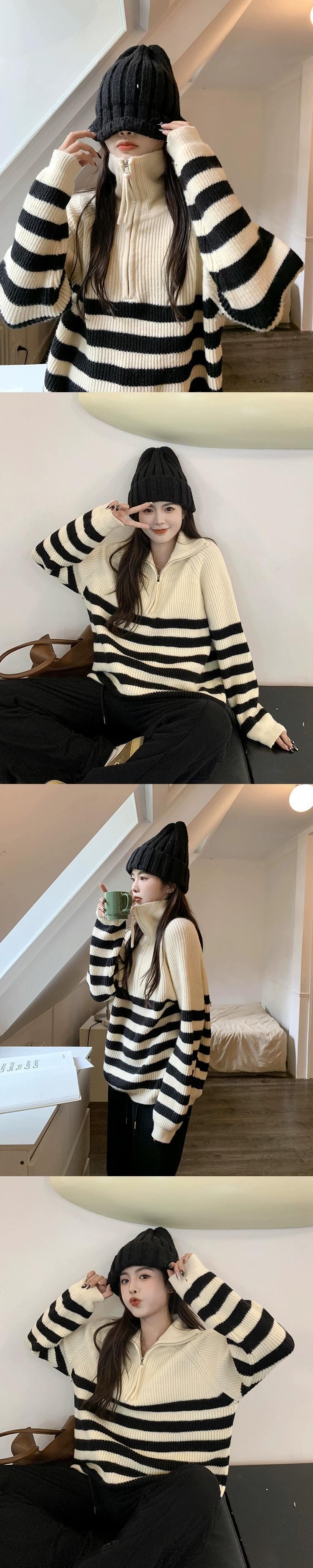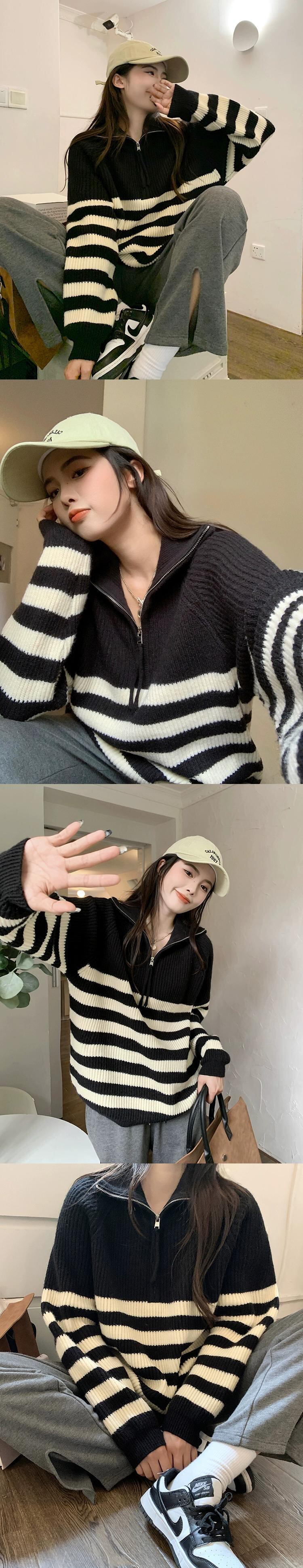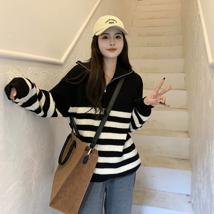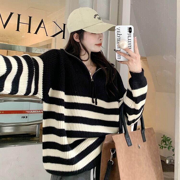 ハーフジップストライプセーターレディース、秋と冬のインナーレイヤリングセーター、レトロな怠惰なスタイル、ハイエンドで非常に素敵なトップ オータム 秋物 ウィンター 冬物 8571698594764117