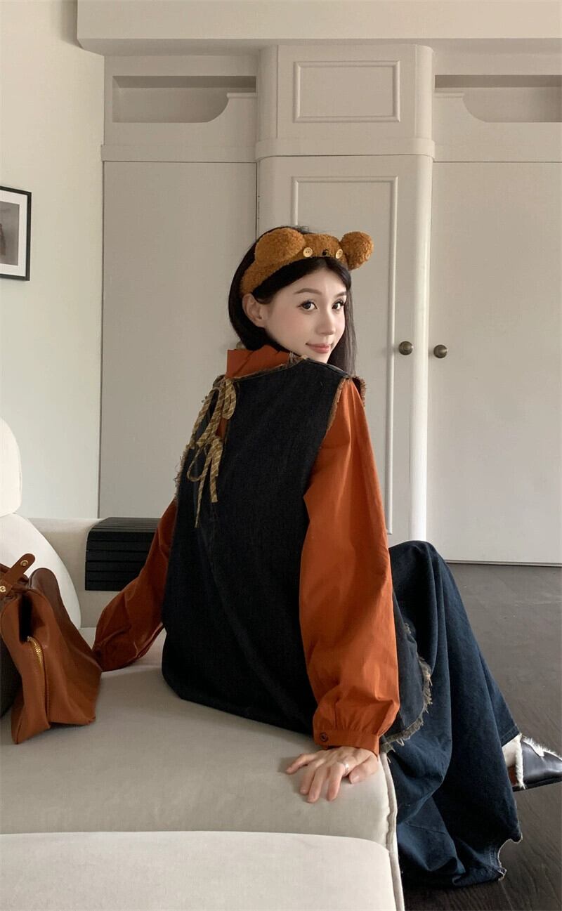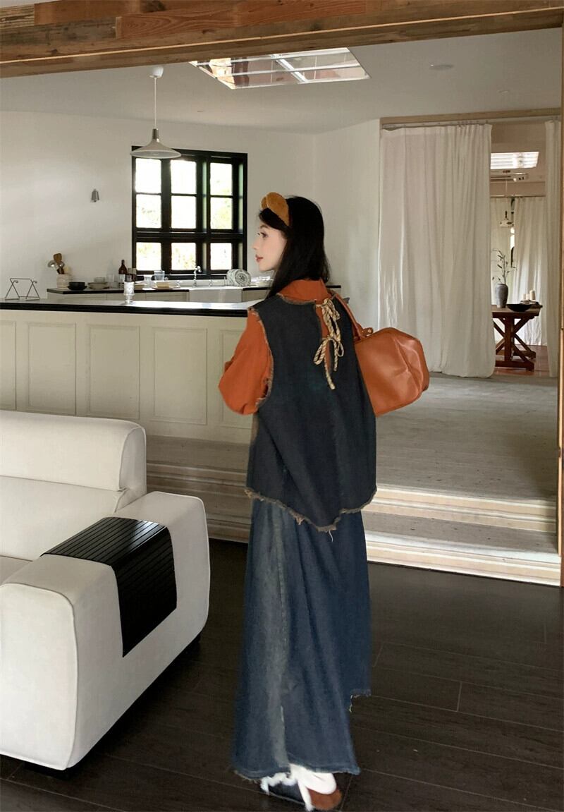 ローエッジデニムベストレディース、レイヤードベスト、2024秋新作、バックストラップ、レトロベスト レッド オータム 秋物 8571679726873521