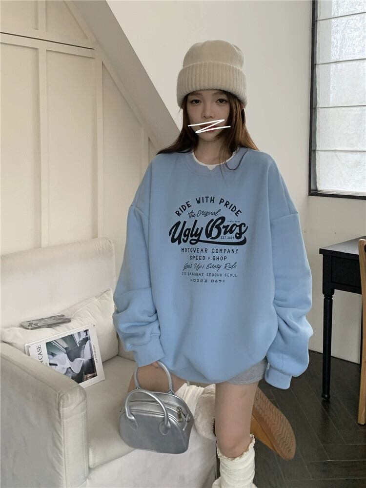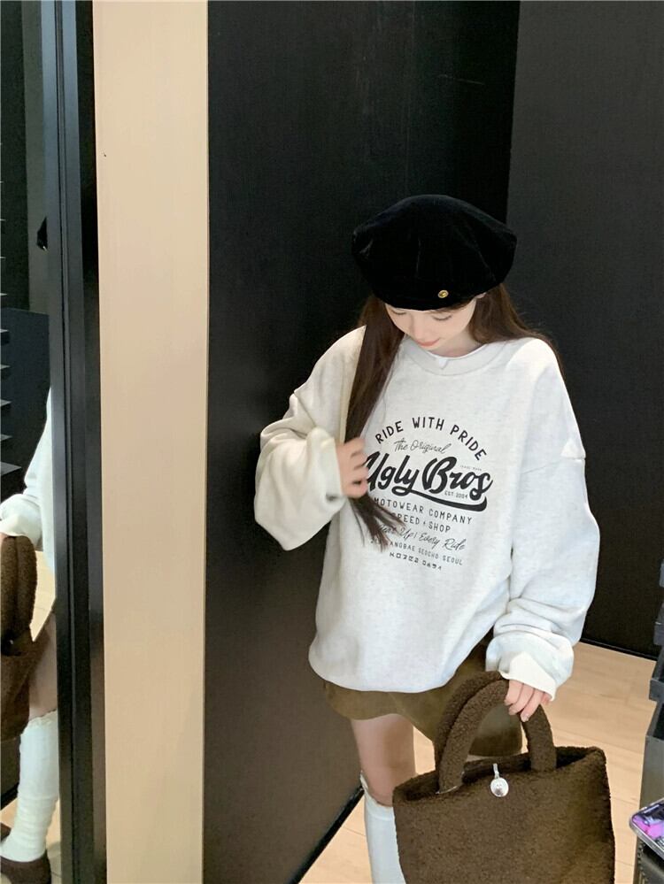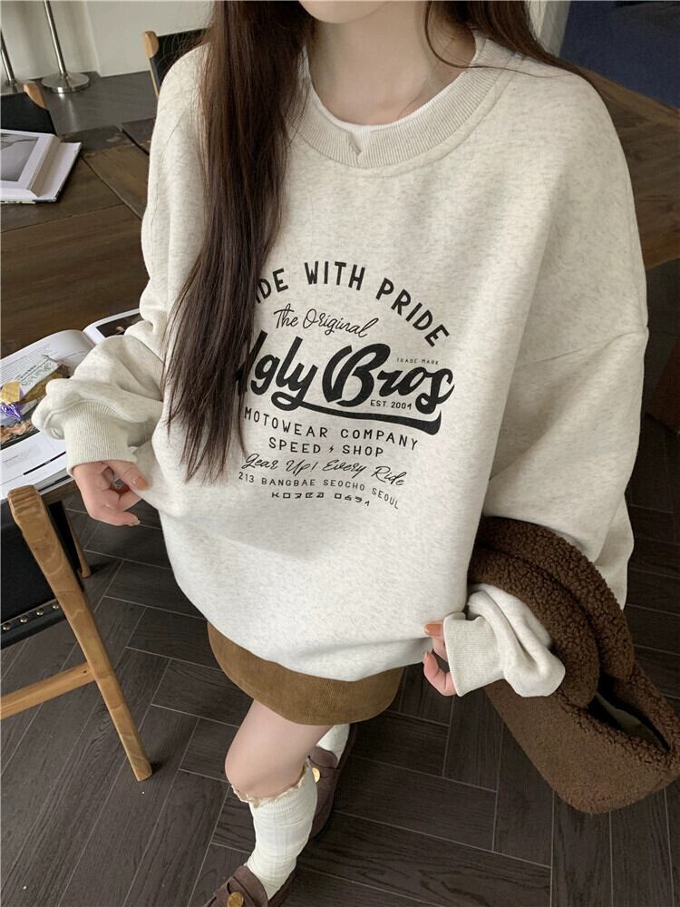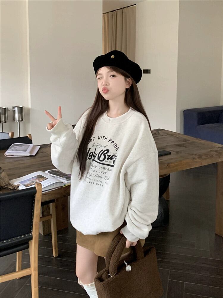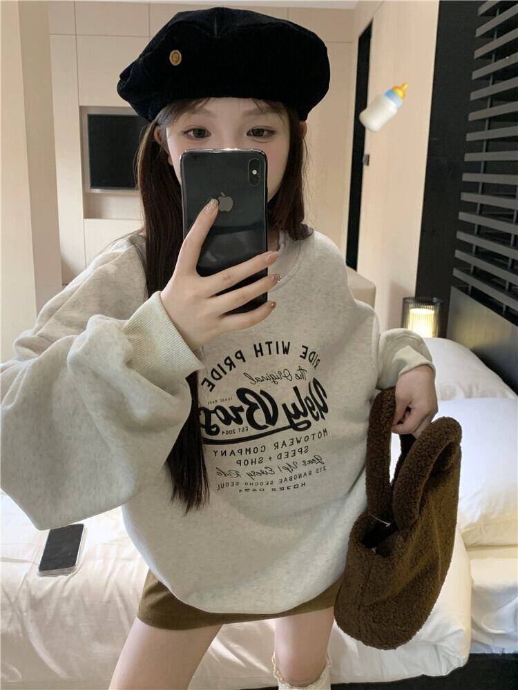 厚いベルベットラウンドネックスウェットシャツの女性の秋と冬 2024 新しいアメリカンレトロな怠惰なスタイルルーズウエスタンスタイル長袖トップ ロング オータム 秋物 ウィンター 冬物 Oネック 8571626152656321