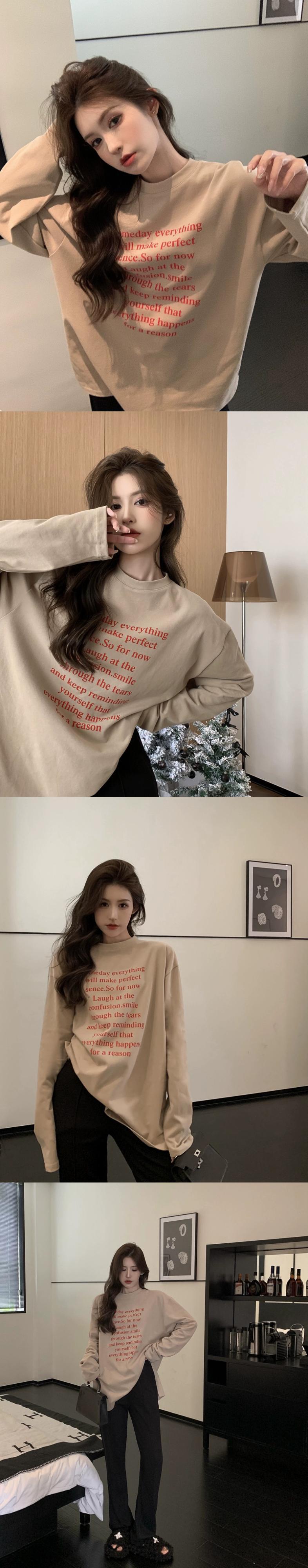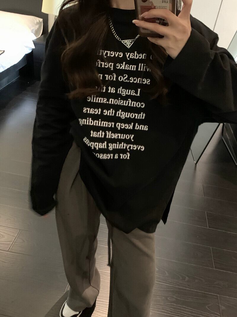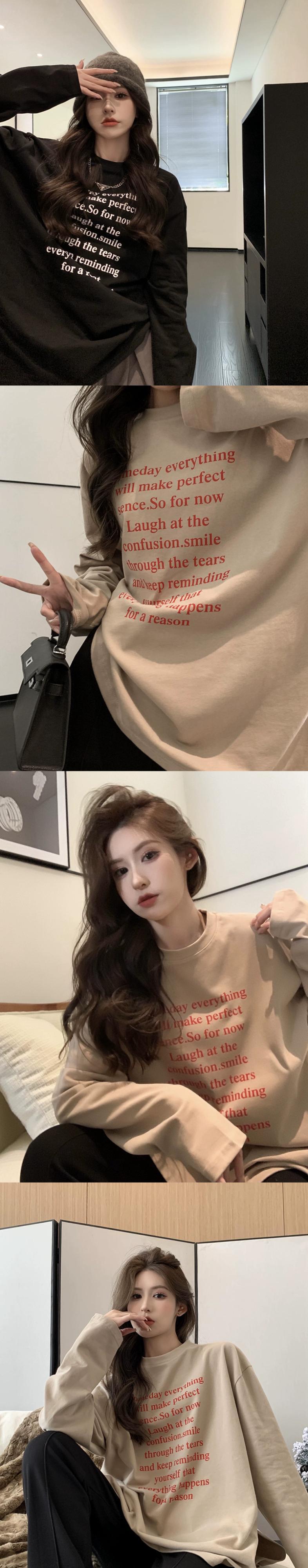 秋冬の白い長袖Tシャツの女性、レタリングプリントのボトムシャツ、ヨーロッパの人気スタイル、ゆったりとしたミドル丈のトップス ロング ホワイト オータム 秋物 ウィンター 冬物 ヨーロピアン 857161265753233