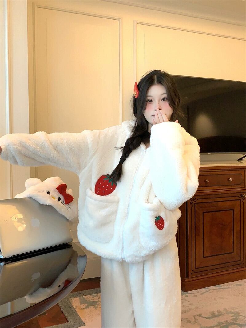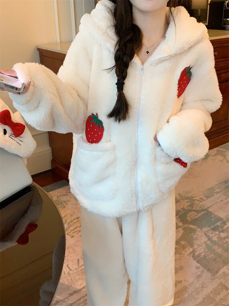 イチゴフード付きコーラルベルベットパジャマ女性冬プラスベルベット肥厚甘くてかわいい学生はホーム服セットを着ることができます 大人ガーリー スウィート キュート カジュアル ウィンター 冬物 857165642317178
