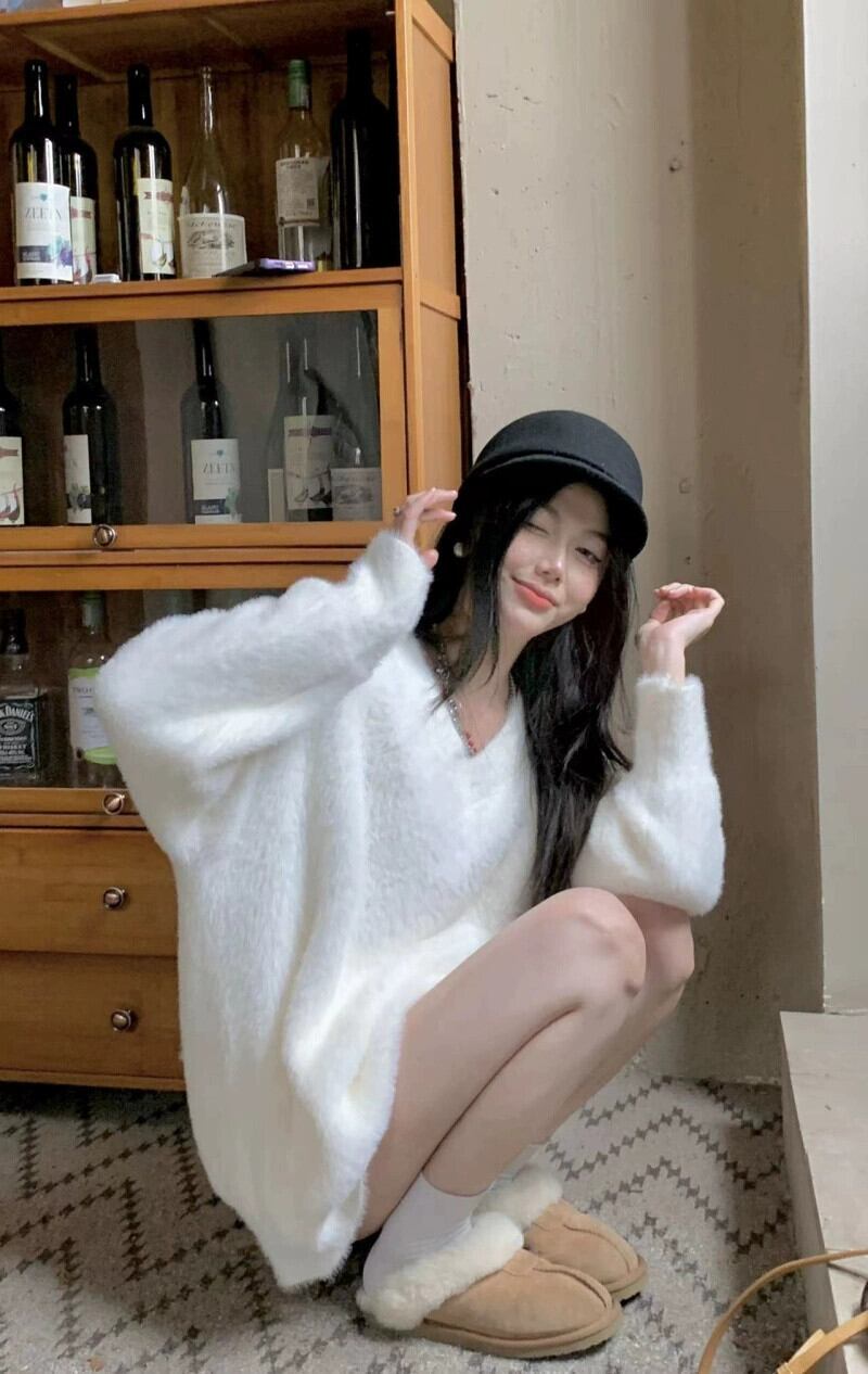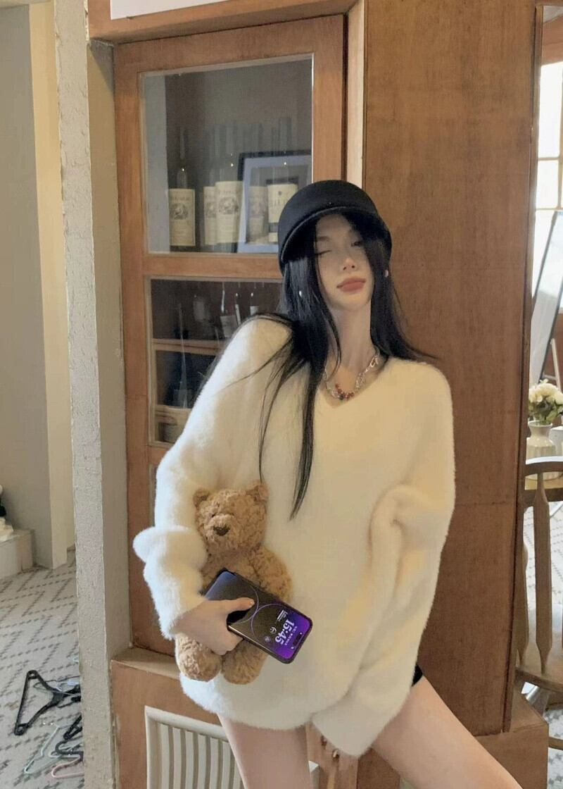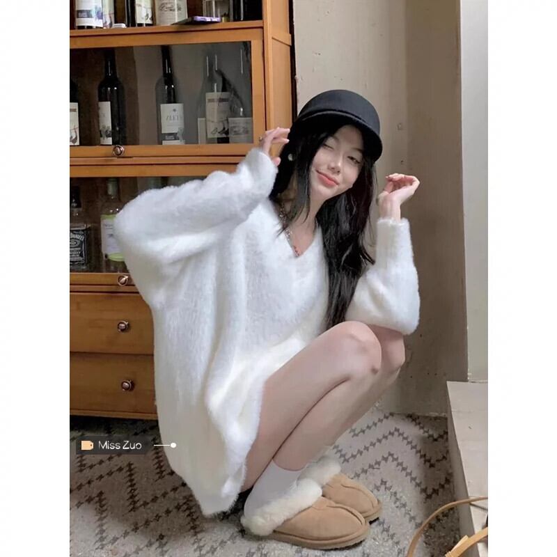 模造ミンクベルベット白セーター女性秋と冬 2024 新しいハイエンド緩い怠惰なスタイルソフトワックス V ネックセーター ホワイト オータム 秋物 ウィンター 冬物 Vネック 8571627457702193
