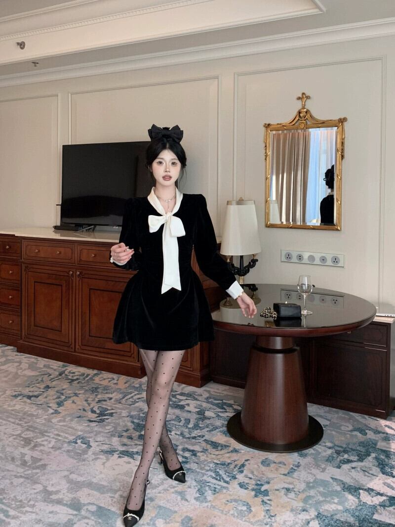 黒のベルベットのドレスの女性の秋と冬 2024 新しいフレンチスタイルの穏やかで非常にかわいいショートスカートと弓小さな人々 ブラック リボン オータム 秋物 ウィンター 冬物 8571641935264920