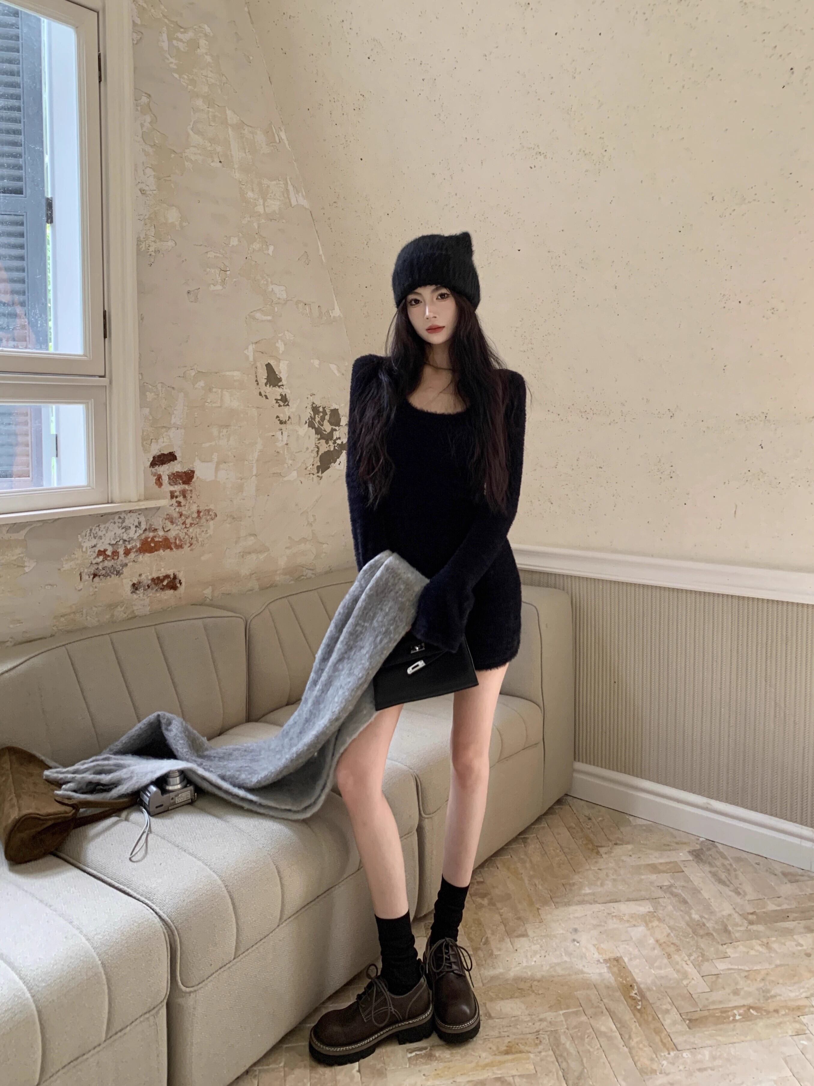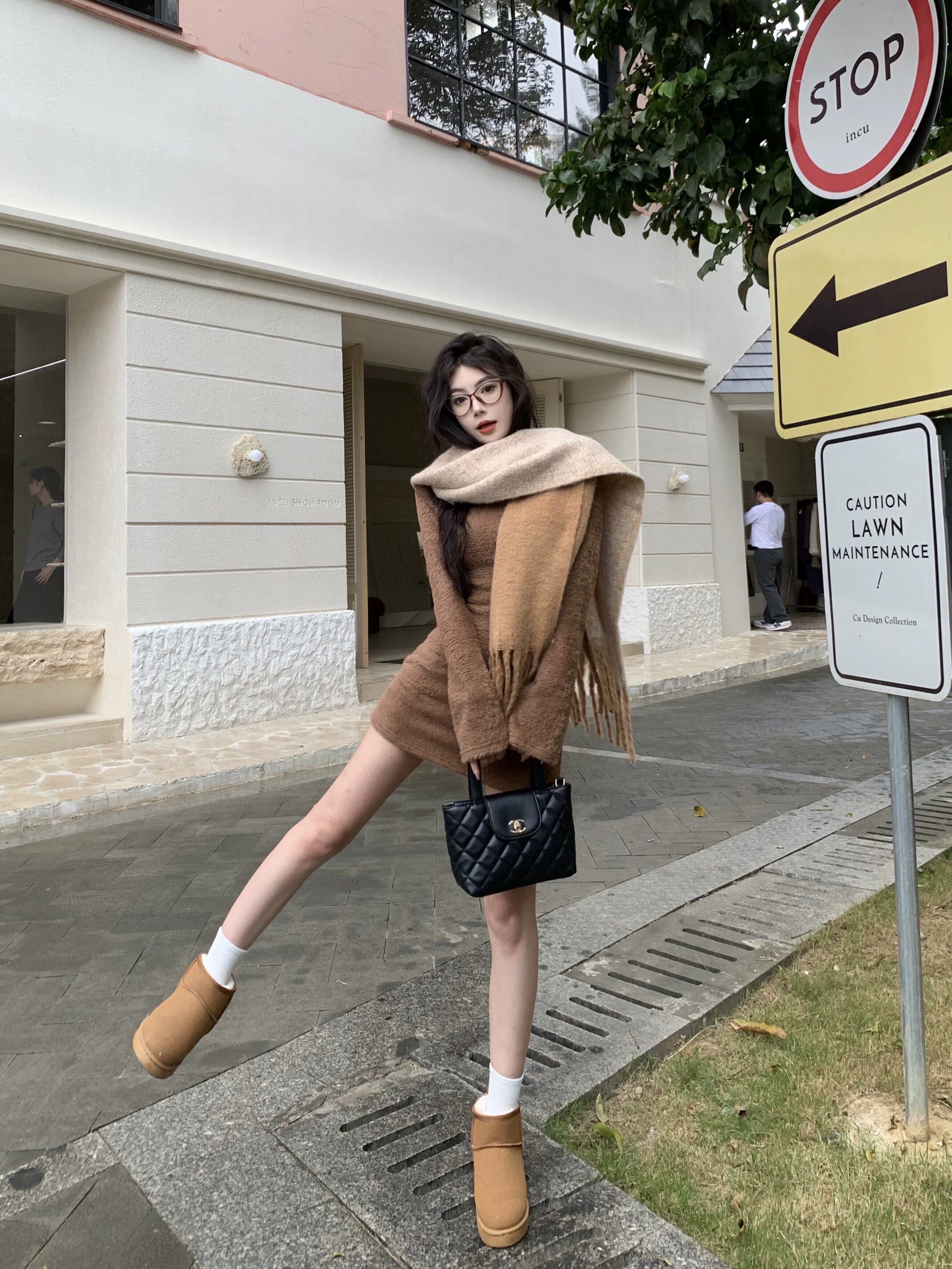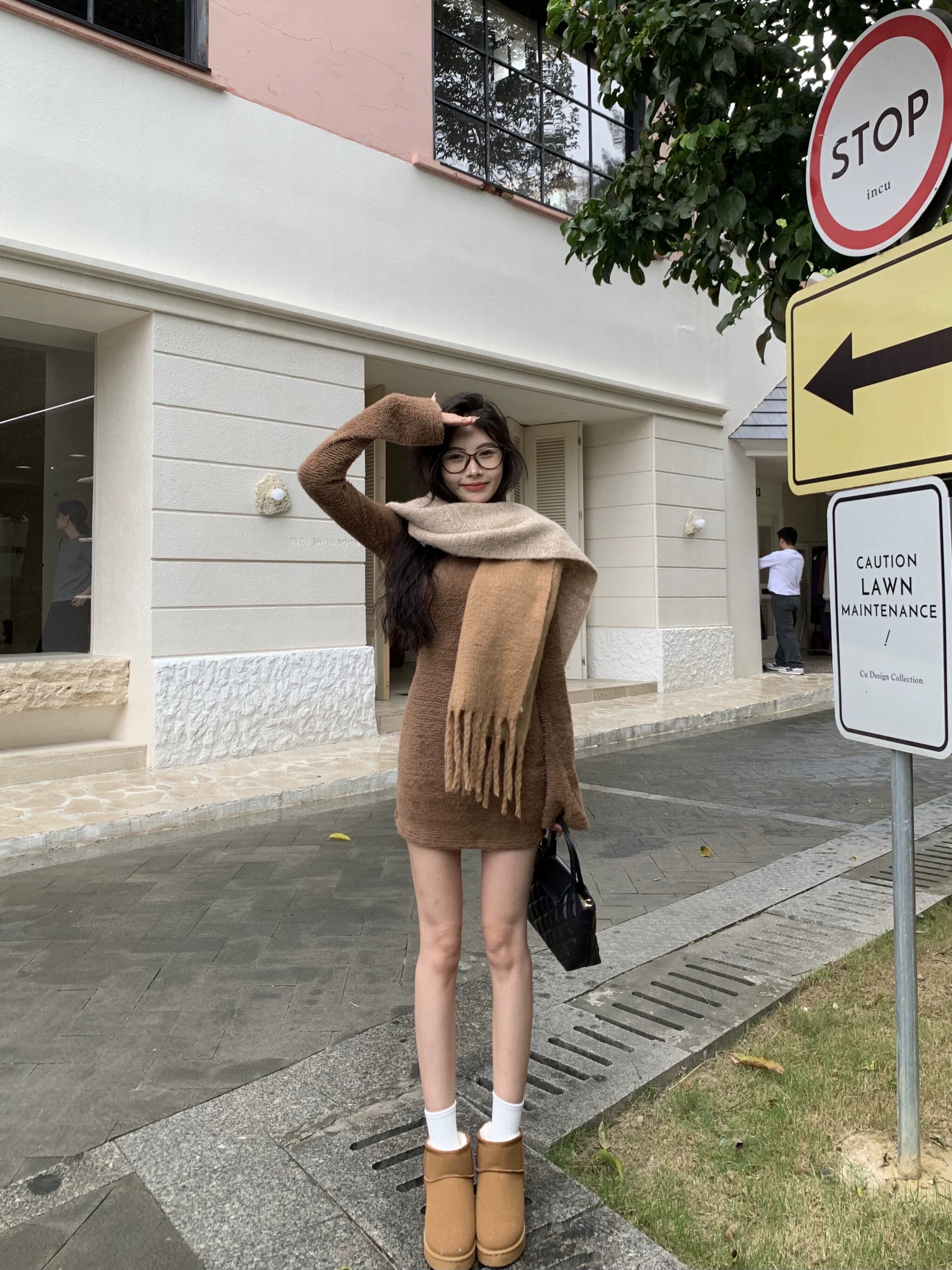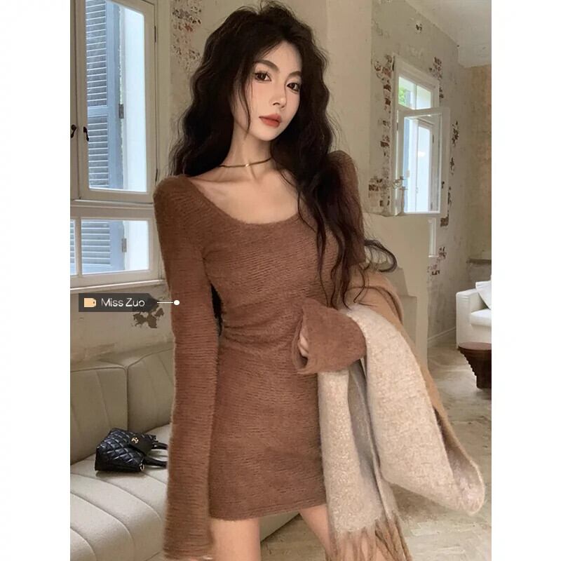 コーヒー色のニットドレスの女性の秋と冬 2024 新しい純粋な欲望セクシーなインナー重ね着ショートスカートヒップカバー オータム 秋物 ウィンター 冬物 ピュア 8571688796794