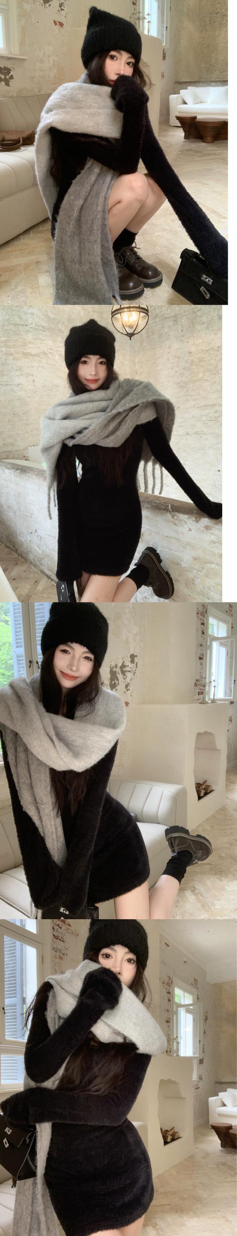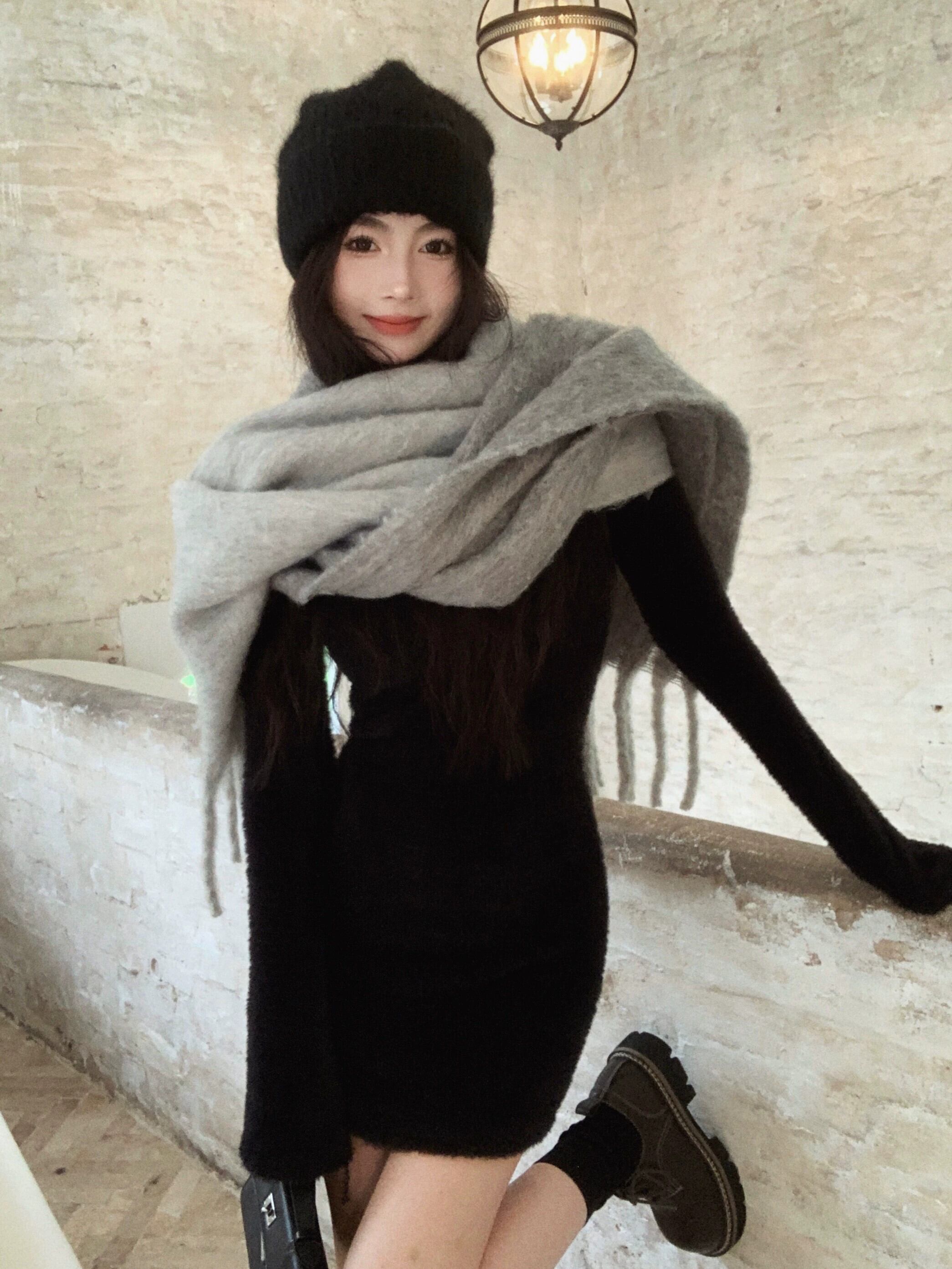 色:カーキカラーブロックスカーフ,グレーのカラーブロックスカーフ,黒いドレス,コーヒー色のドレス