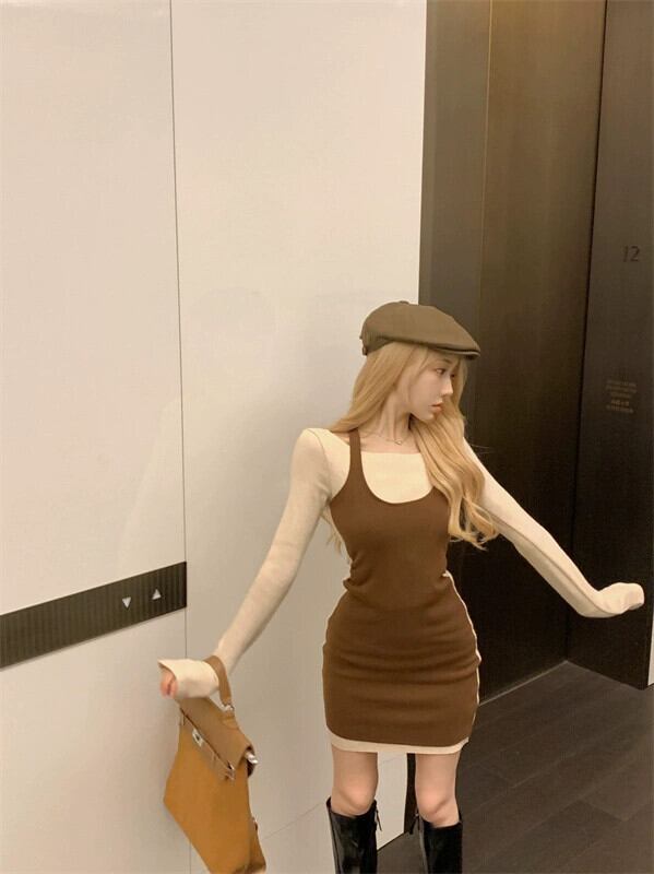 偽のツーピースホルターネックドレス女性 2024 秋の新しい純粋な欲望スタイルデザイン底ヒップショートスカート オータム 秋物 ピュア 8571625958025122