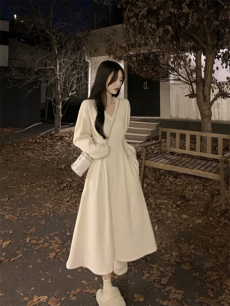 秋冬のオフホワイトの長袖ドレスの女性、フレンチスタイルの女神スタイル、底付きVネックロングスカートのハイエンドスタイル オータム 秋物 ウィンター 冬物 857161206380472