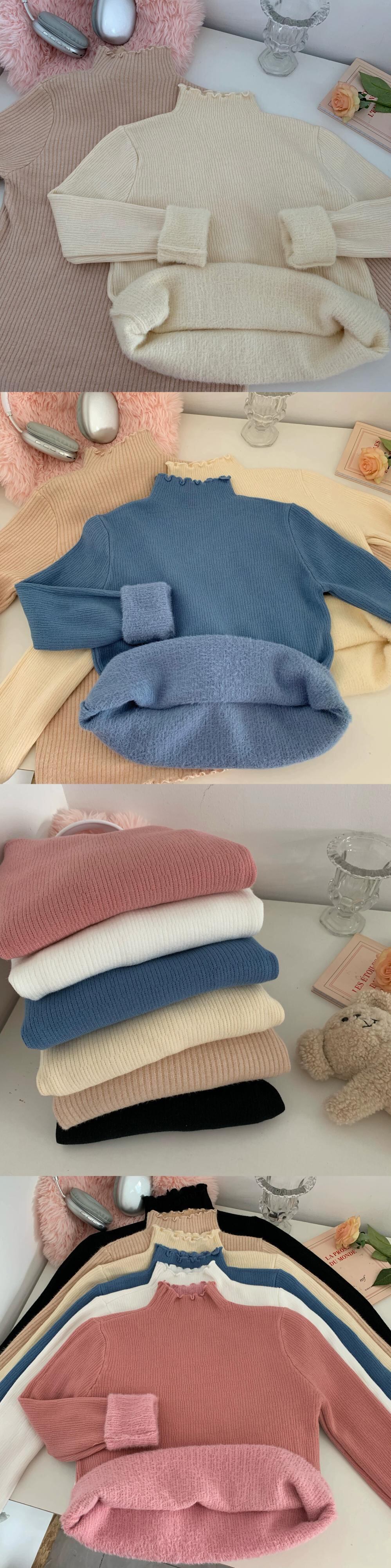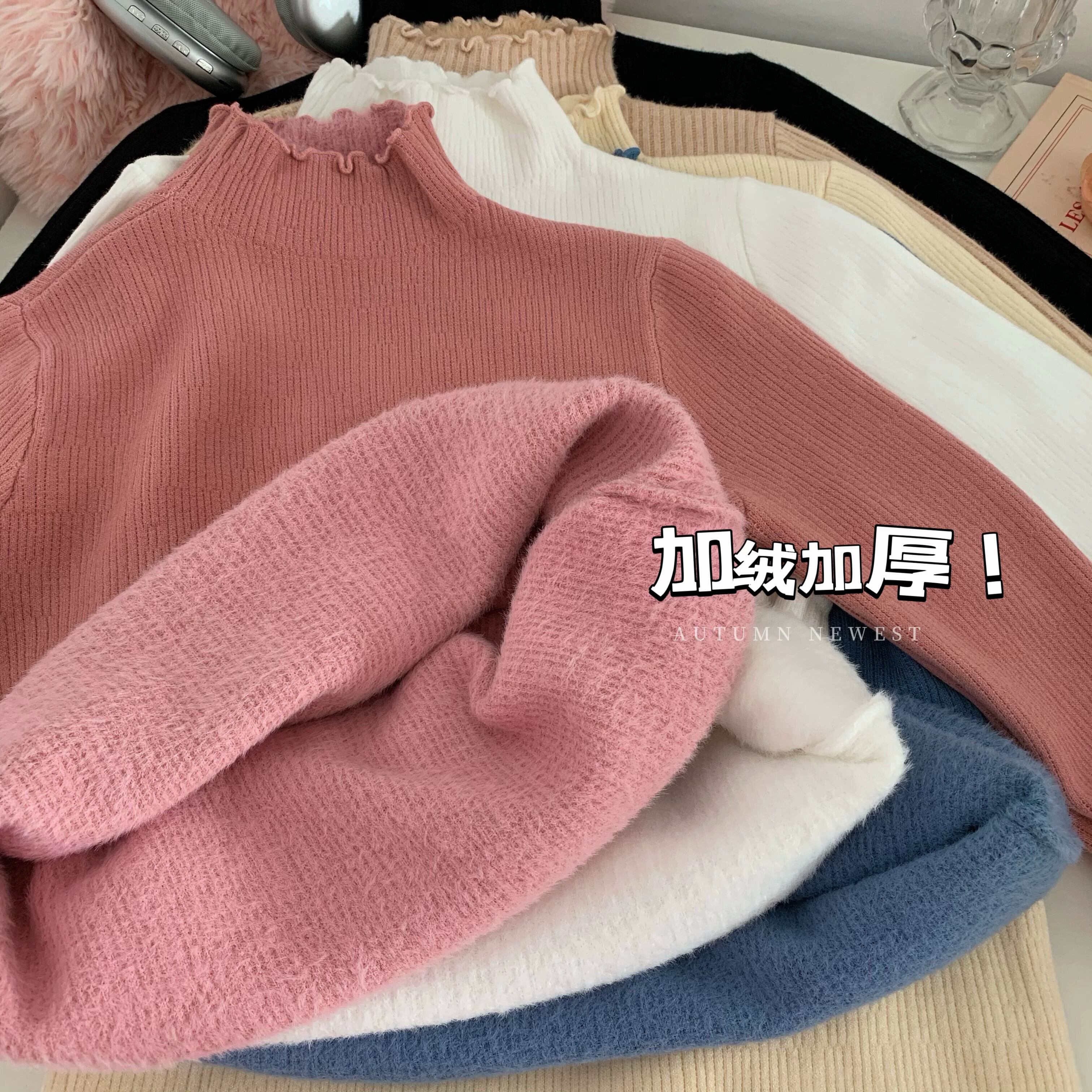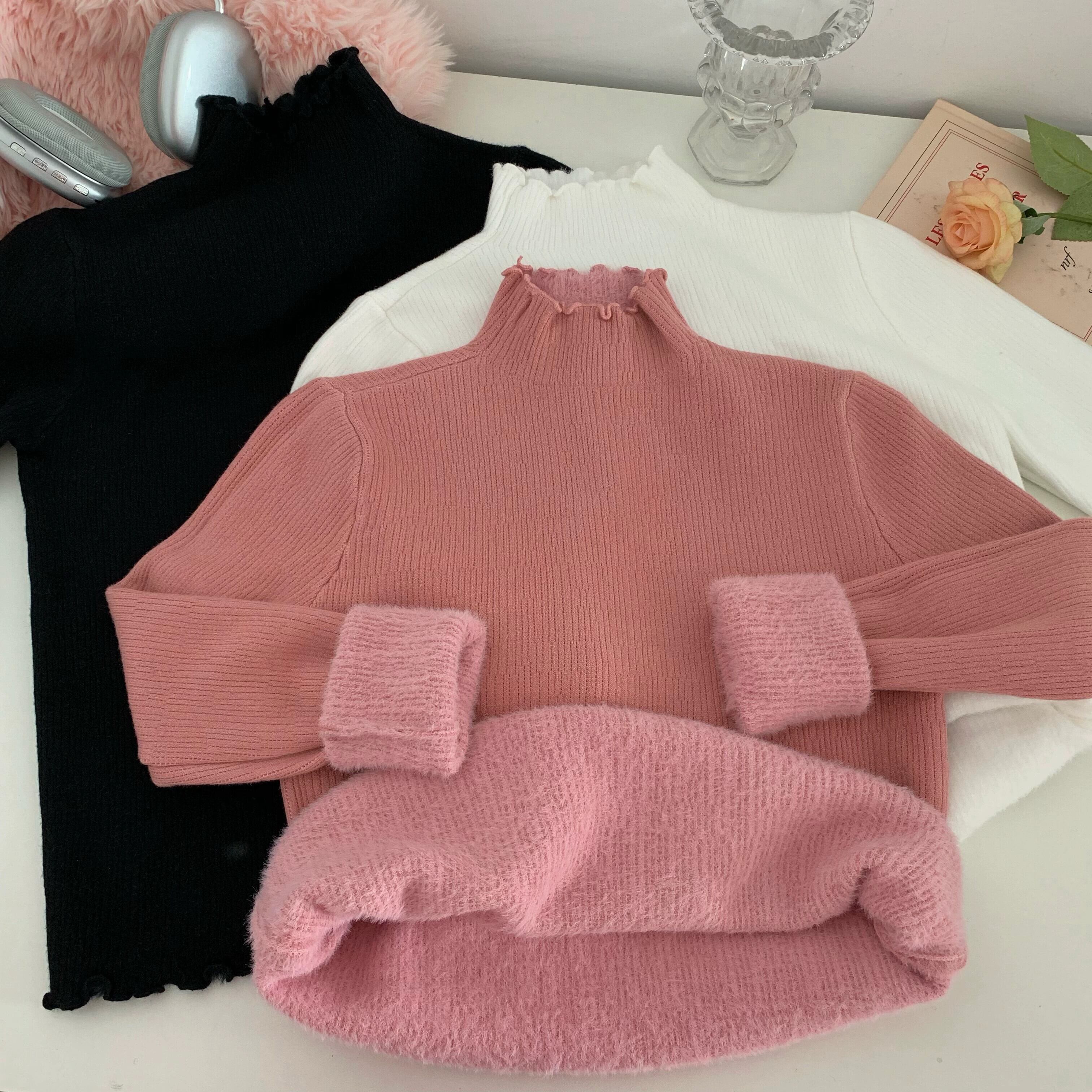 ハーフタートルネックインナー底シャツ女性冬菌ニットトップ 2024 新しいベルベット肥厚ピンクセーター ウィンター 冬物 8571664979223075