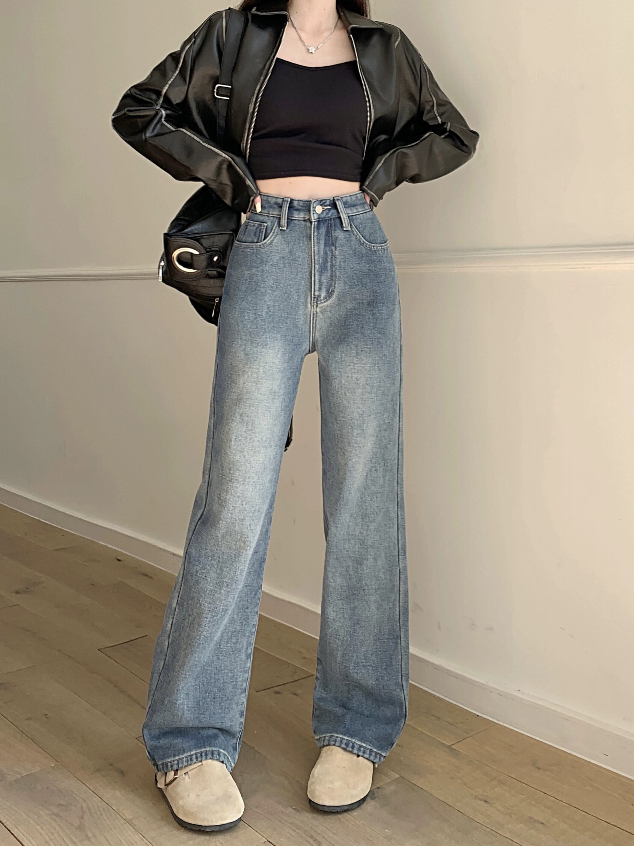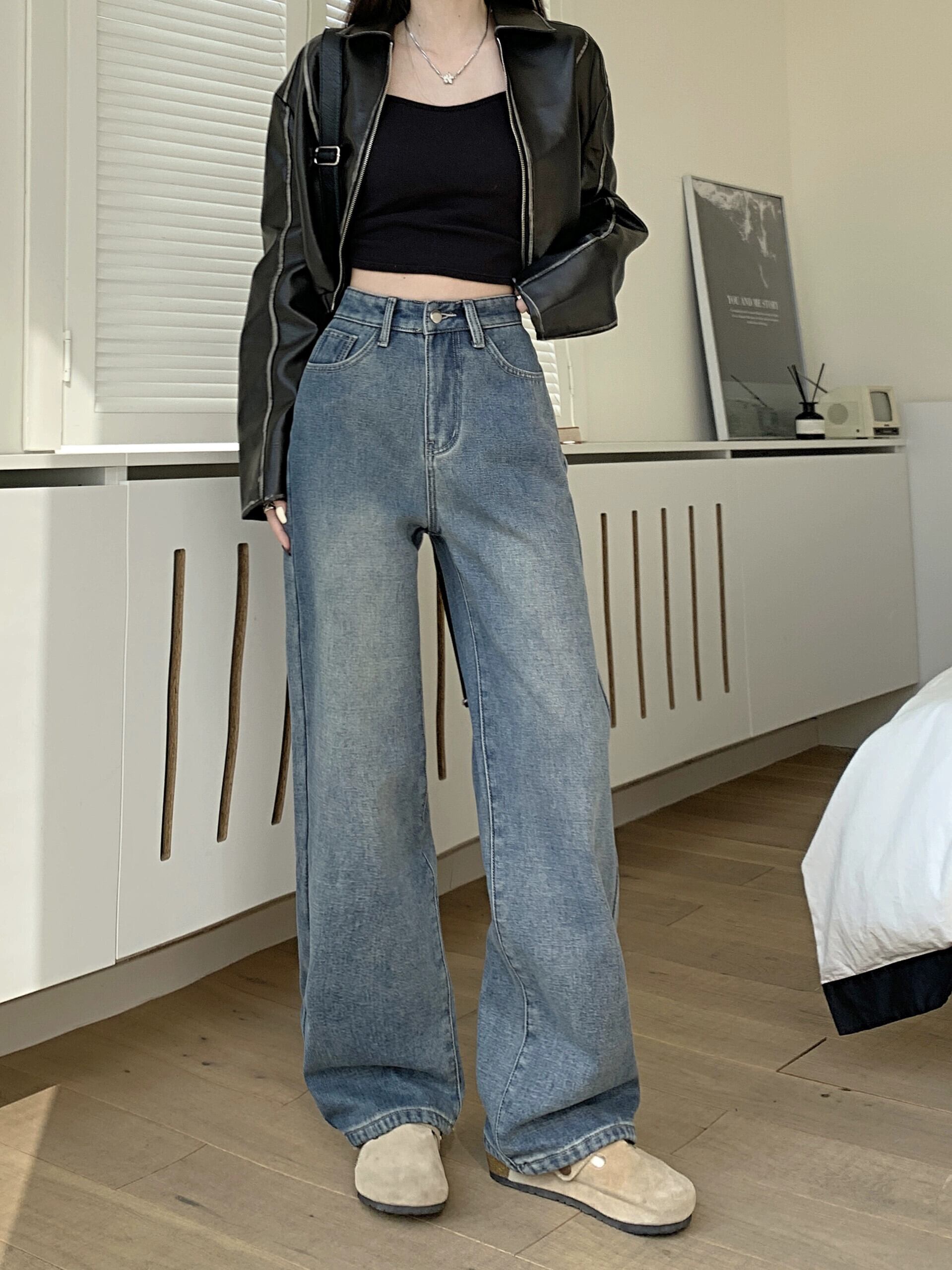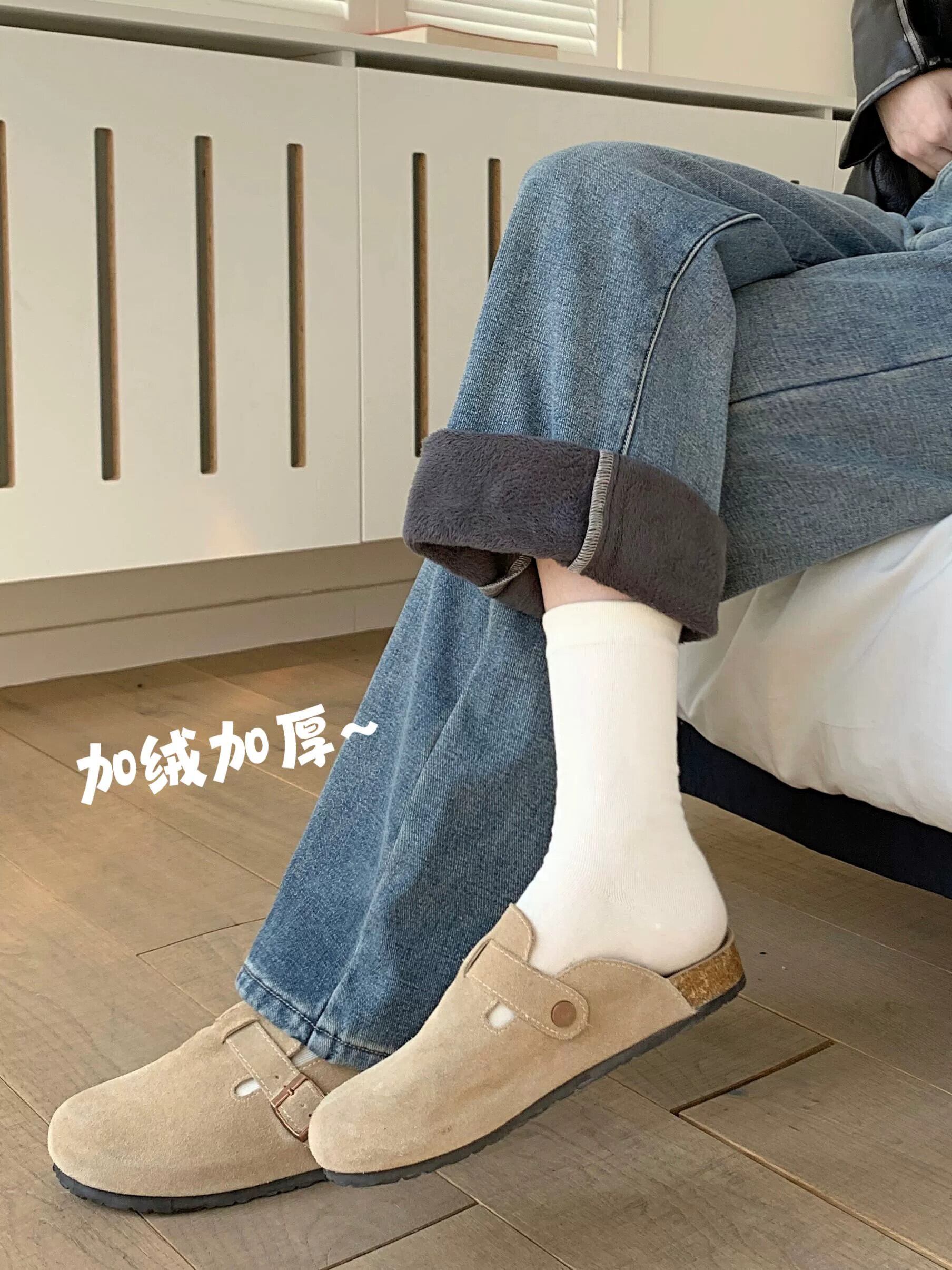 秋冬のジーンズレディースプラスベルベットと厚みのある2024新しいハイウエストルーズストレートレッグフロアレングスワイドレッグロングパンツ小柄な人 オータム 秋物 ウィンター 冬物 8571654984102787