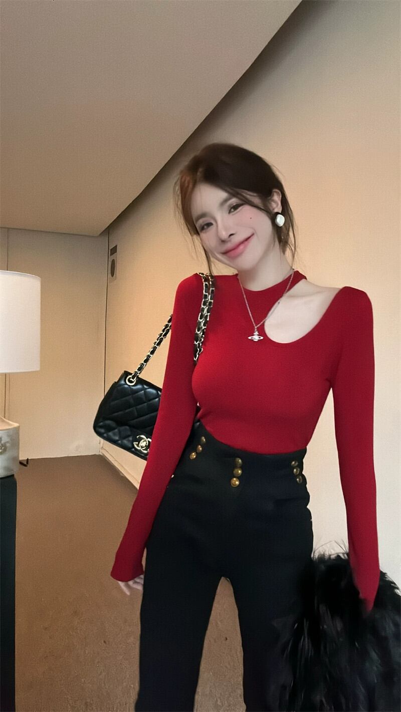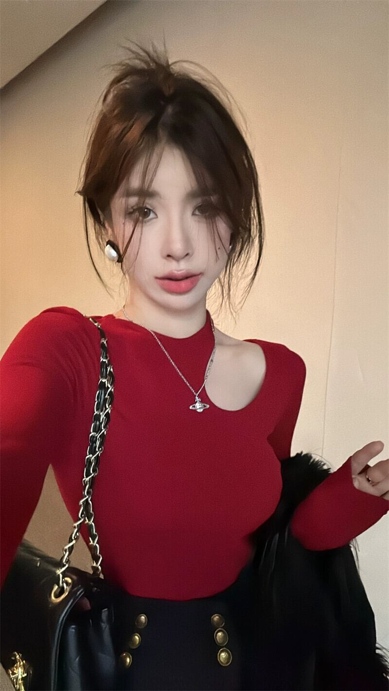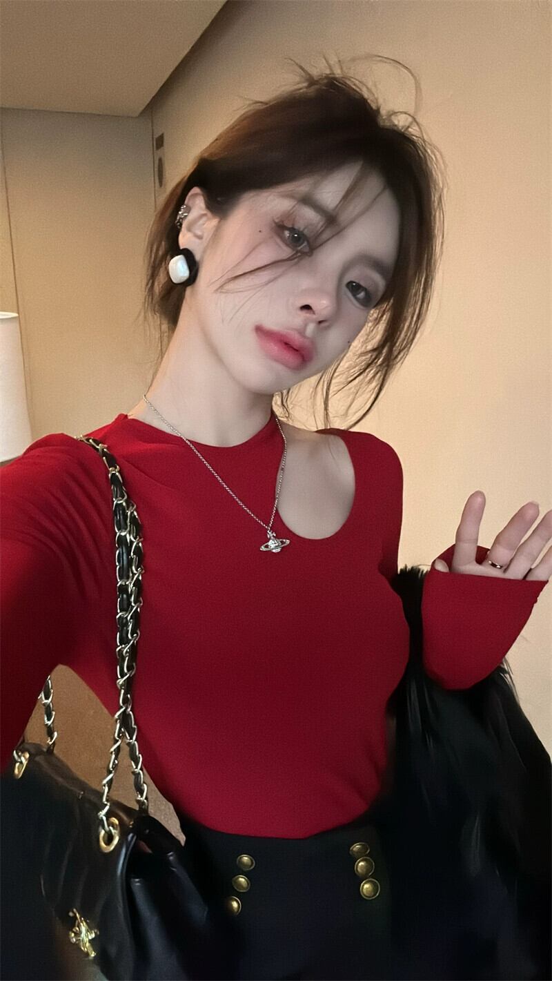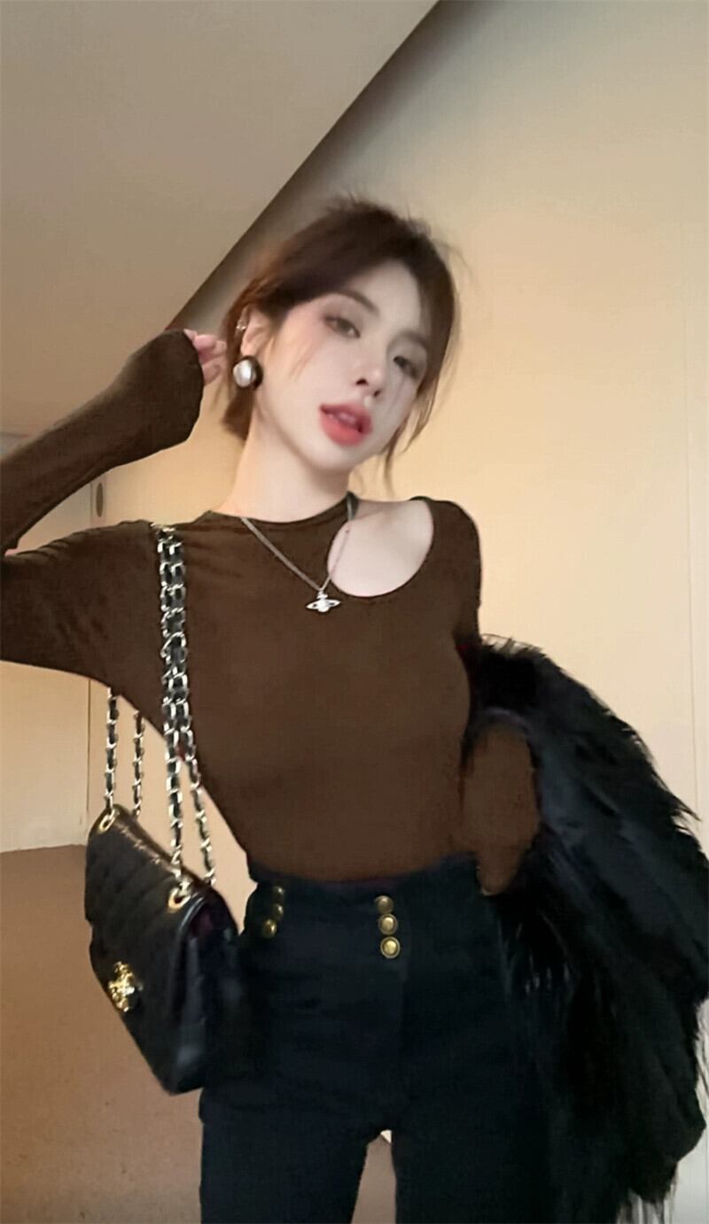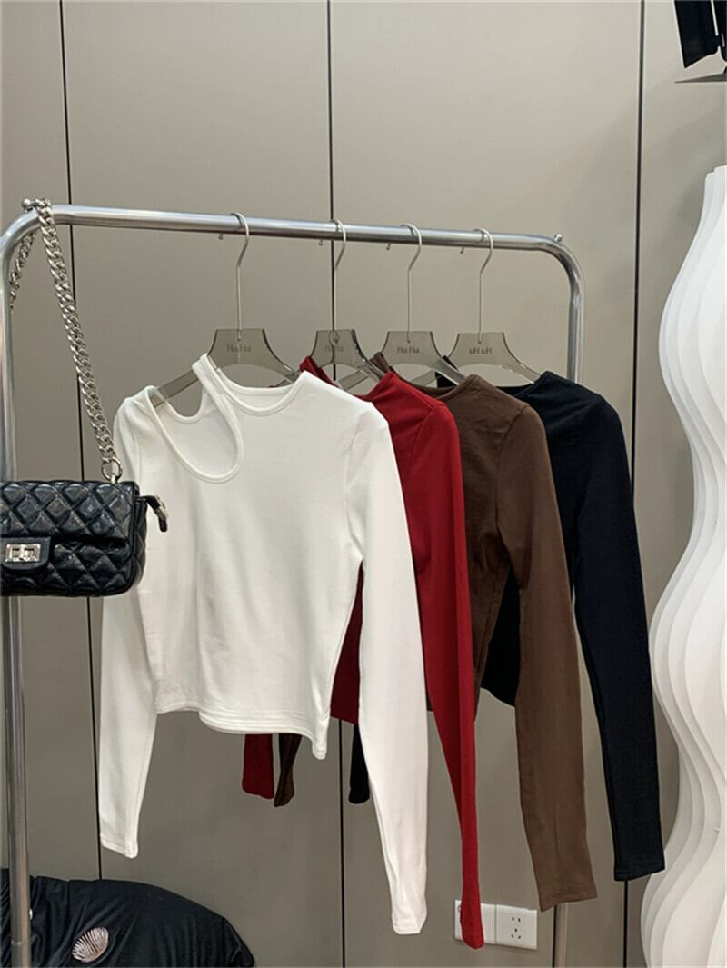 中空オフショルダーショートトップレディース、秋冬インナーレイヤリングシャツ、慎重で非常に見栄えの良いセクシーな長袖Tシャツ ロング オータム 秋物 ウィンター 冬物 8571626586832560