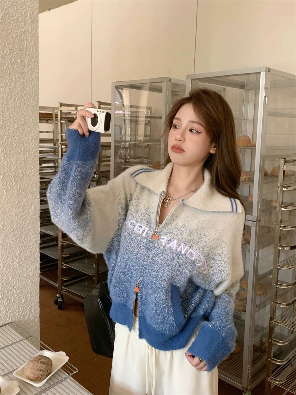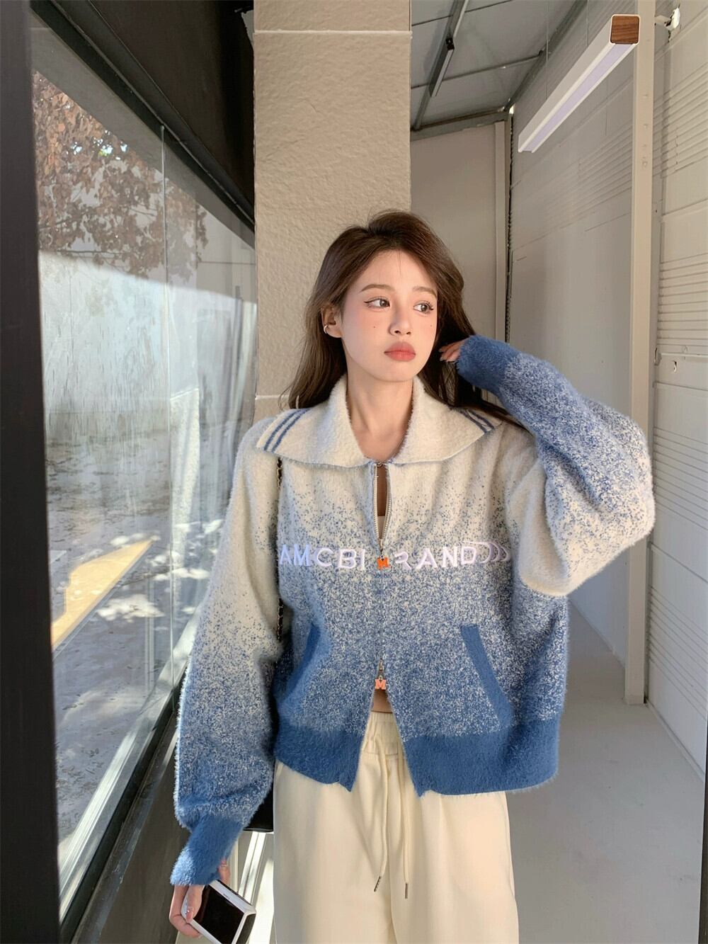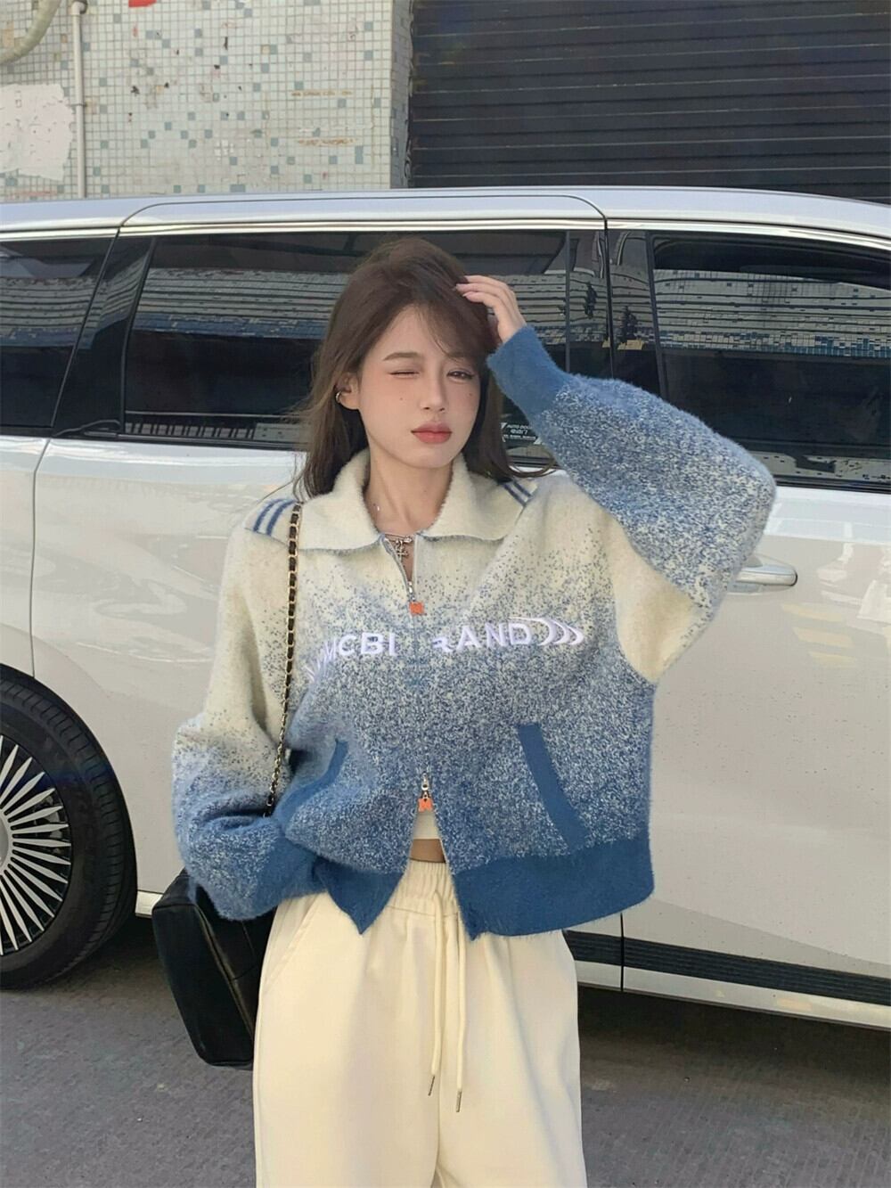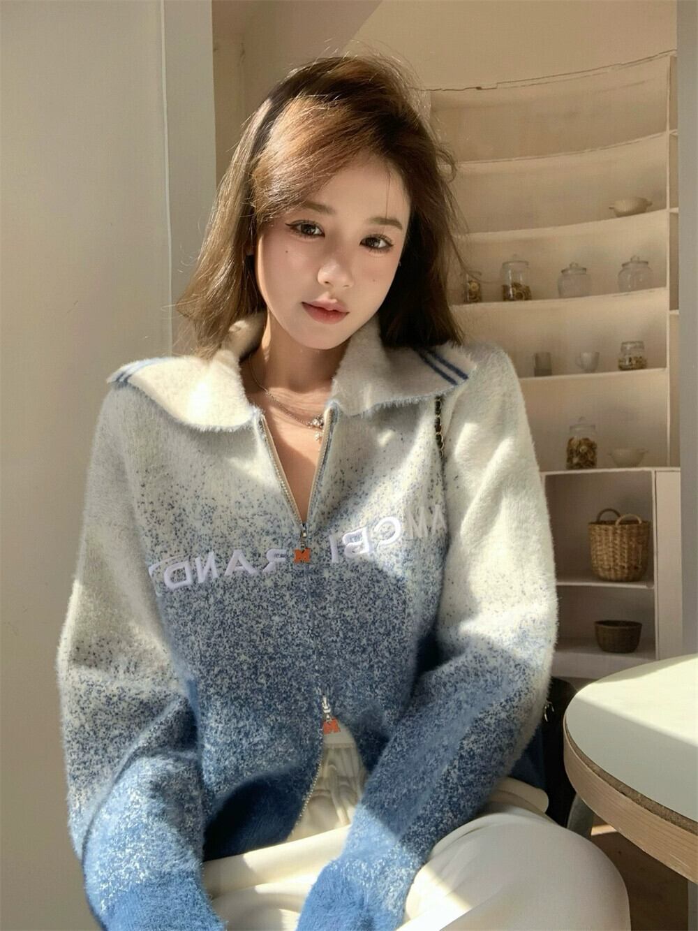 グラデーションカラーのセータージャケットの女性の秋と冬 2024 新デザインレトロソフトワックスダブルジッパーラペルニットカーディガン オータム 秋物 ウィンター 冬物 8571672746299787